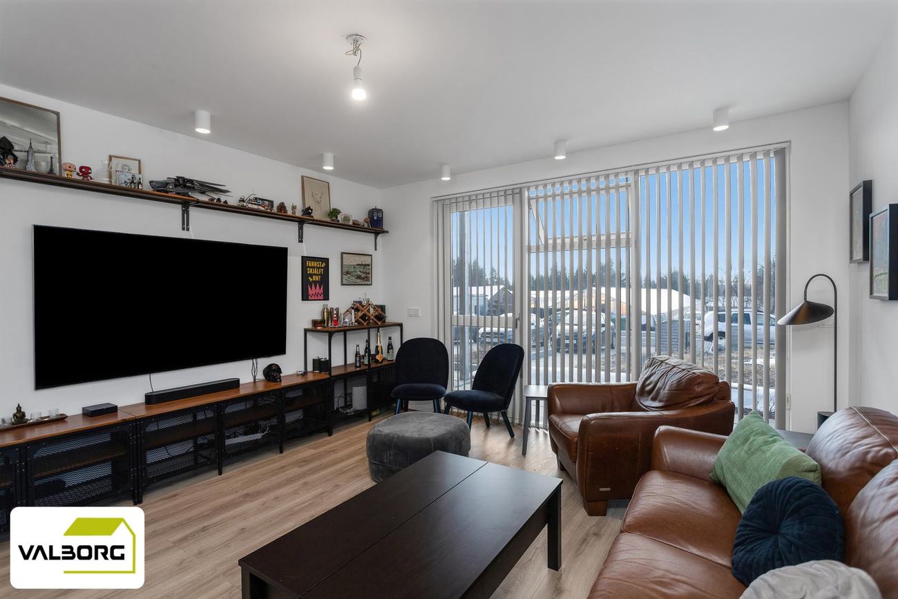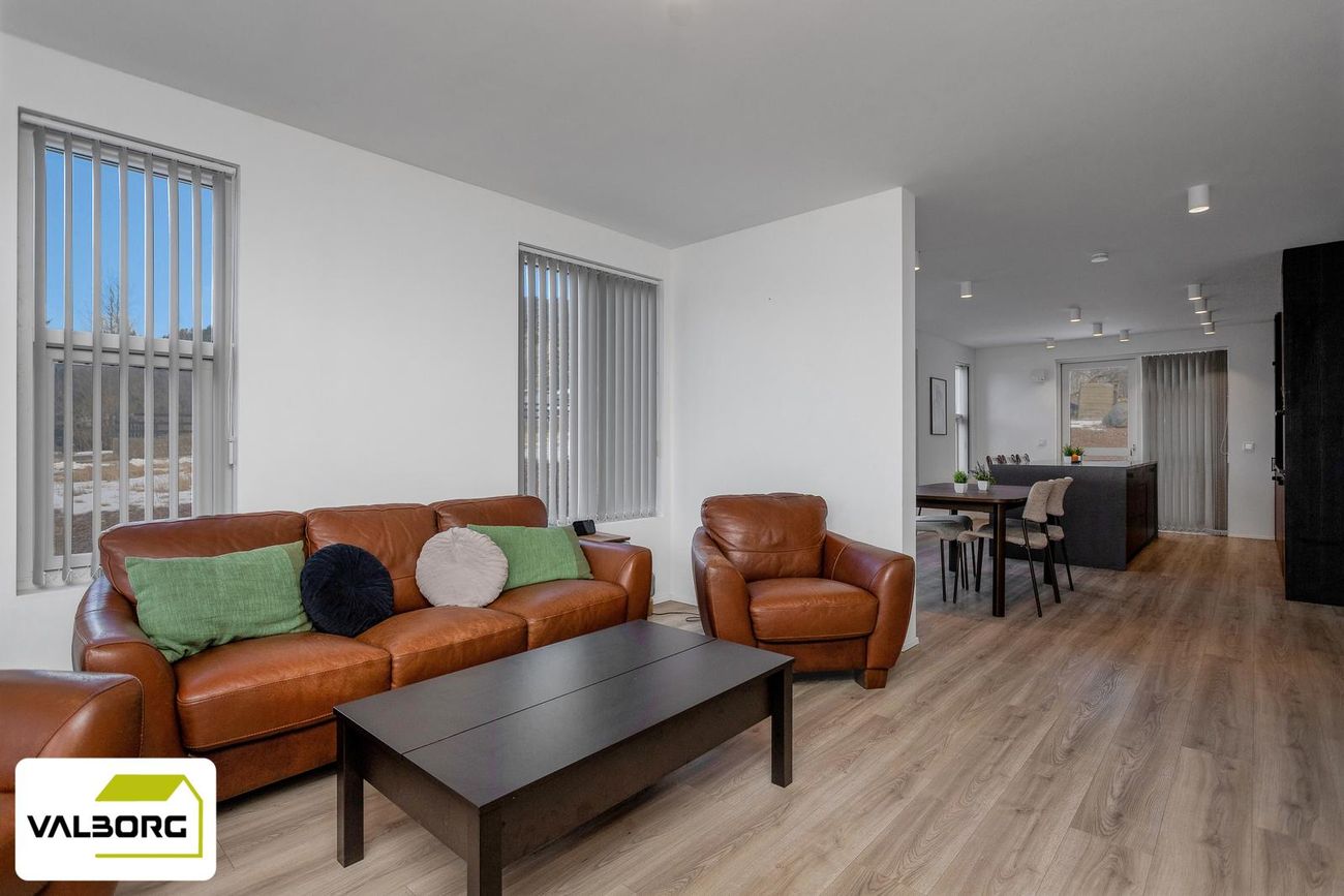 Stofa í opnu rými frá eldhúsi. Parket á gólfi og útgengt frá stofu út á hellulagða verönd að framanverðu.