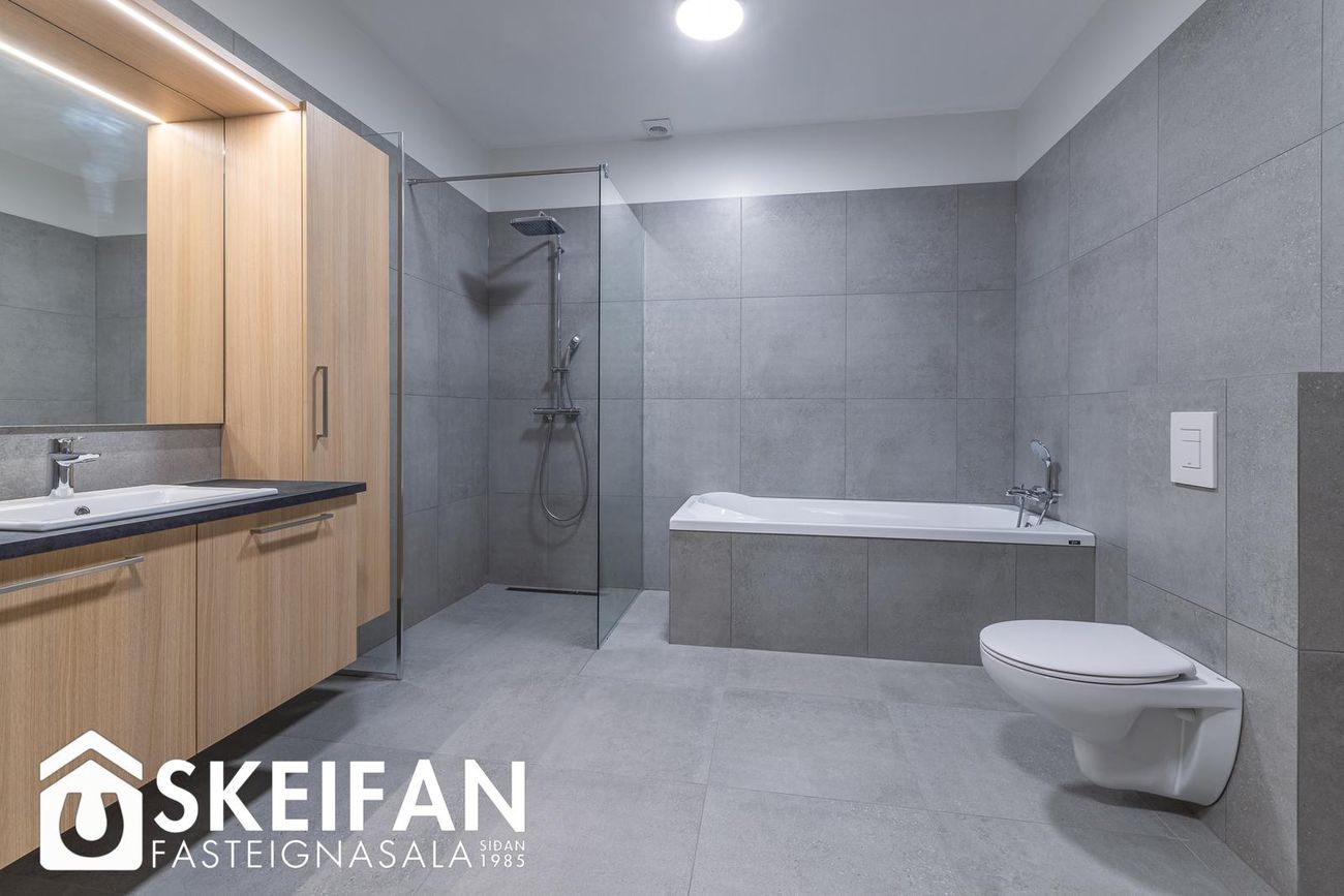 Baðherbergi með walk-in sturta, baðkari, upphengdu salerni, handklæðaofni og flísalögum gólfum. Hreinlætistæki frá Grohe.