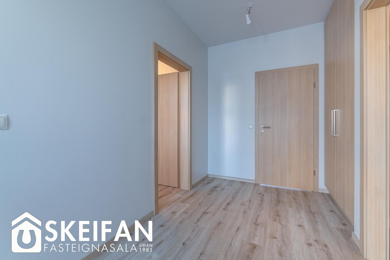 Vínylparket á gólfi, flísar frá Álfaborg í baðherbergi, álgluggar og hurðir, eikarhurðir frá Parka.