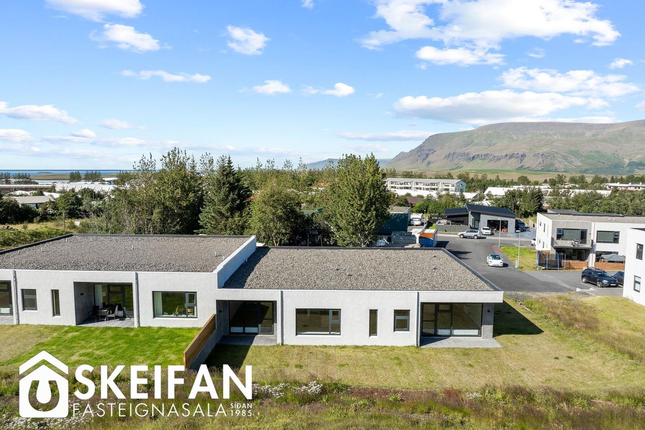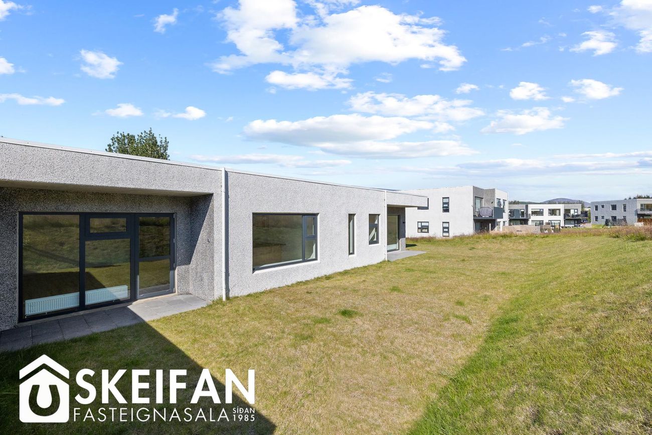 Hellulagt lóð með snjóbræðslukerfi að framan og tyrfaðri umgjörð.