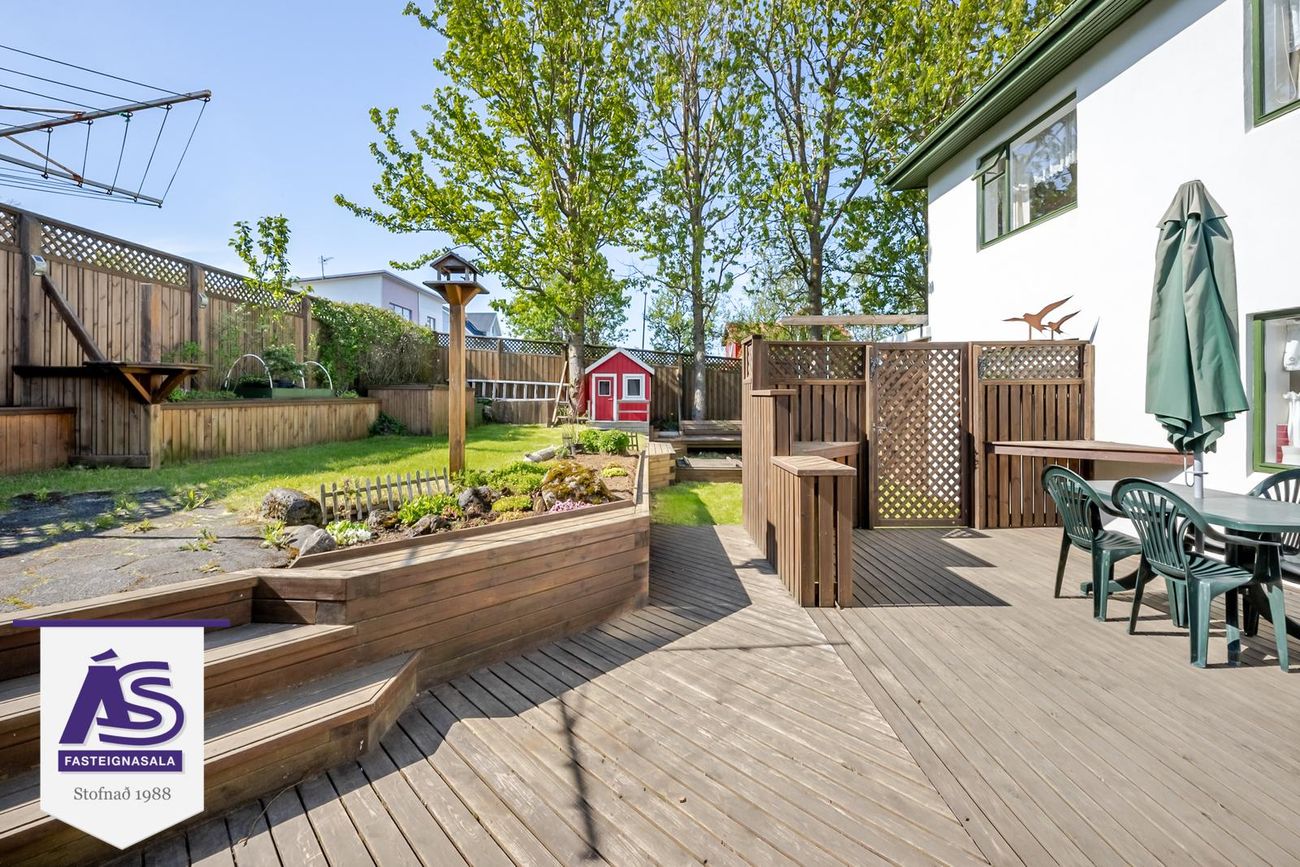 195,6 fm einbýlishús með bílskúr, 3-4 svefnherbergi, parketgólf, hitað bílaplan og fallegur garður.