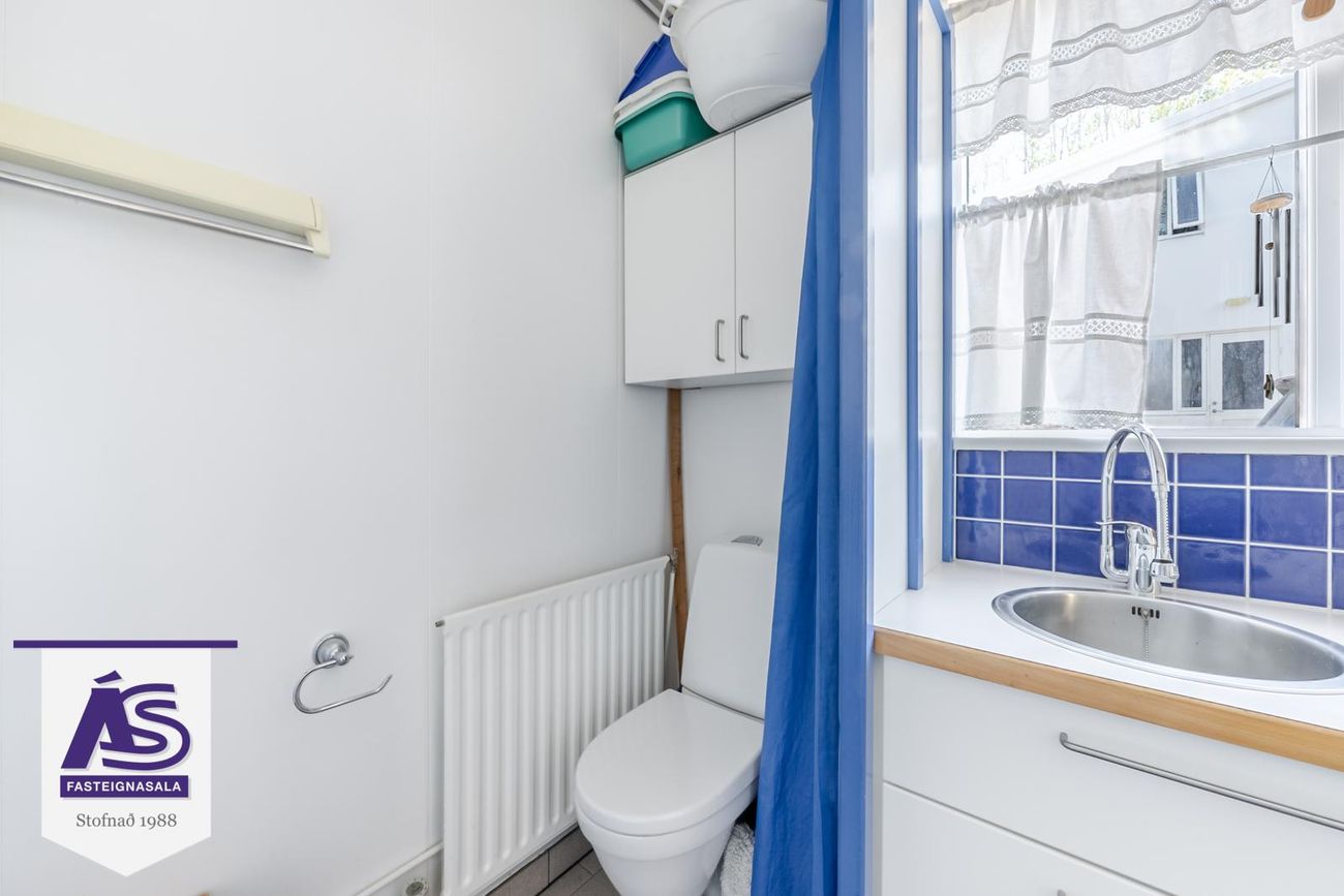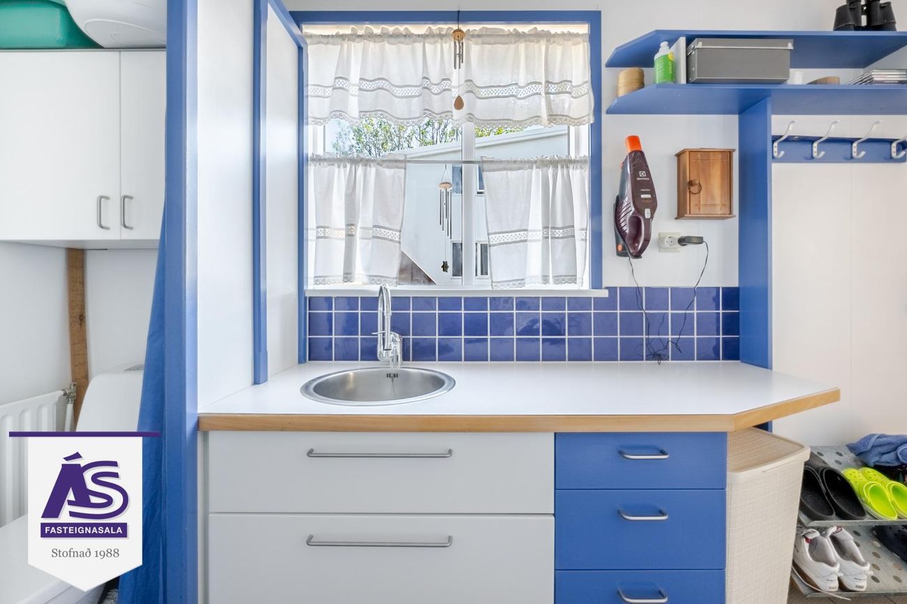 Heitt og kalt vatn, vaskur og gluggar. Lítil inngönguhurð á bílskúrshurð.