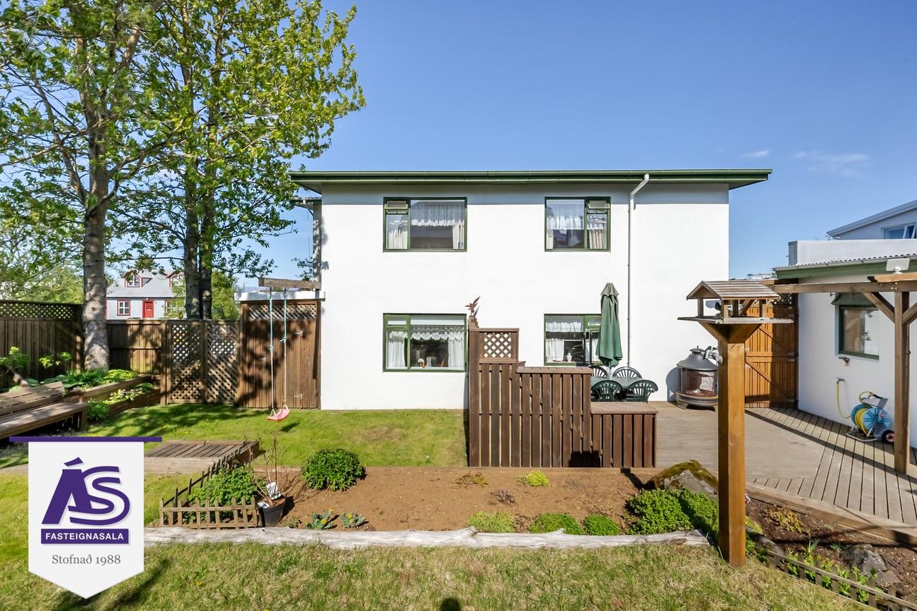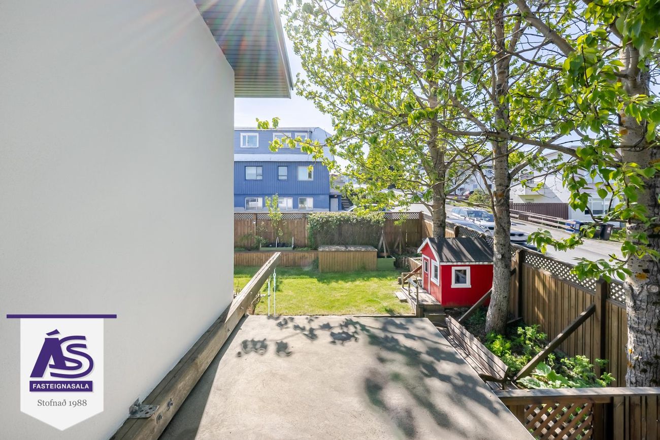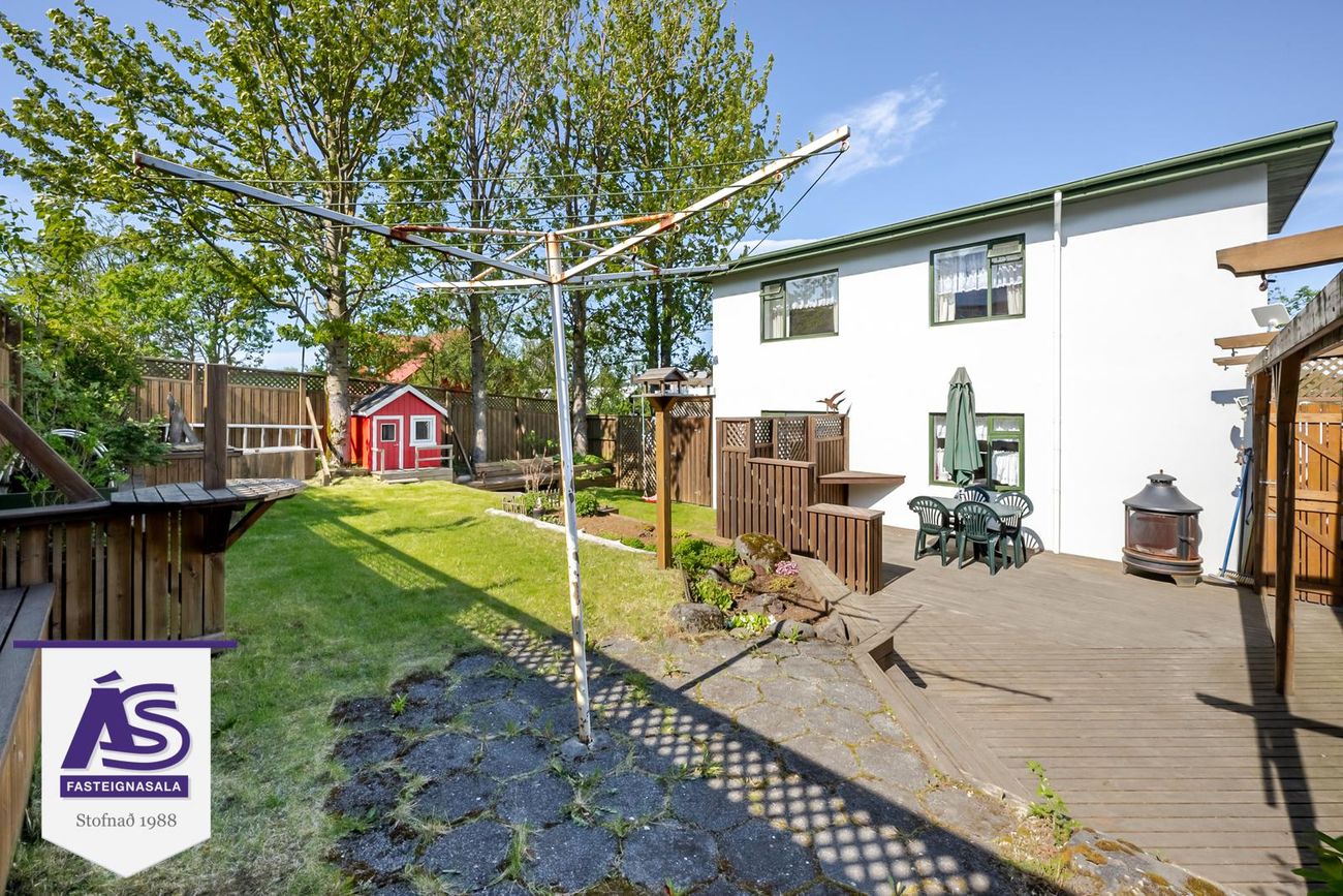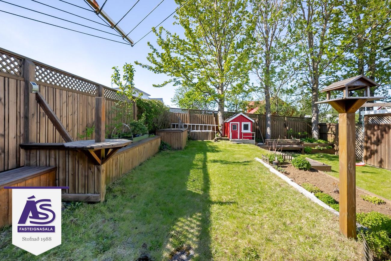 Garðurinn virkilega fallegur og skjólgóður, búið að skerma hann af með skjólveggjum hliðum þannig að hægt er að hafa hann alveg lokaðann. Lítið dúkkuhús, lokuð geymsla undir svölunum.