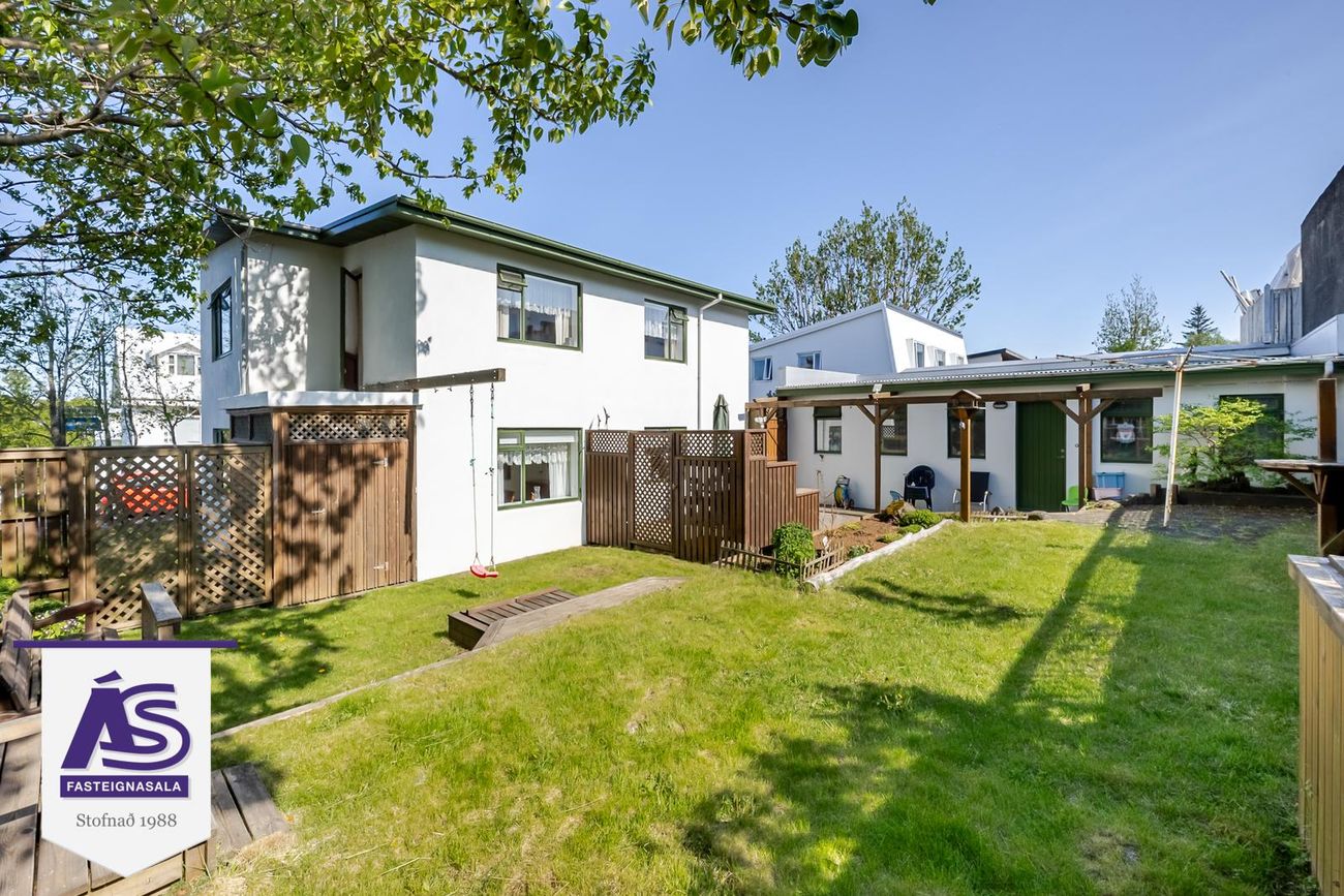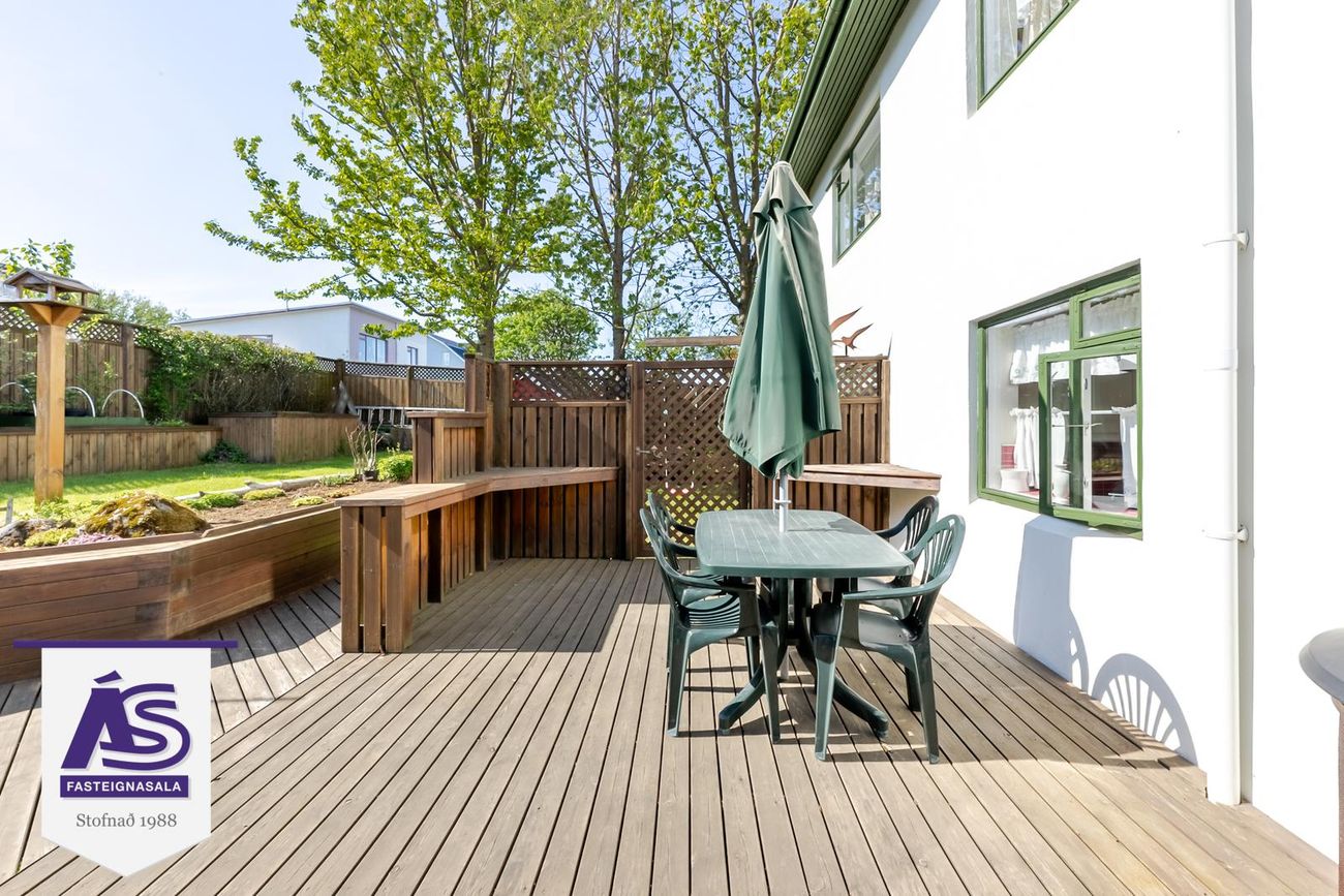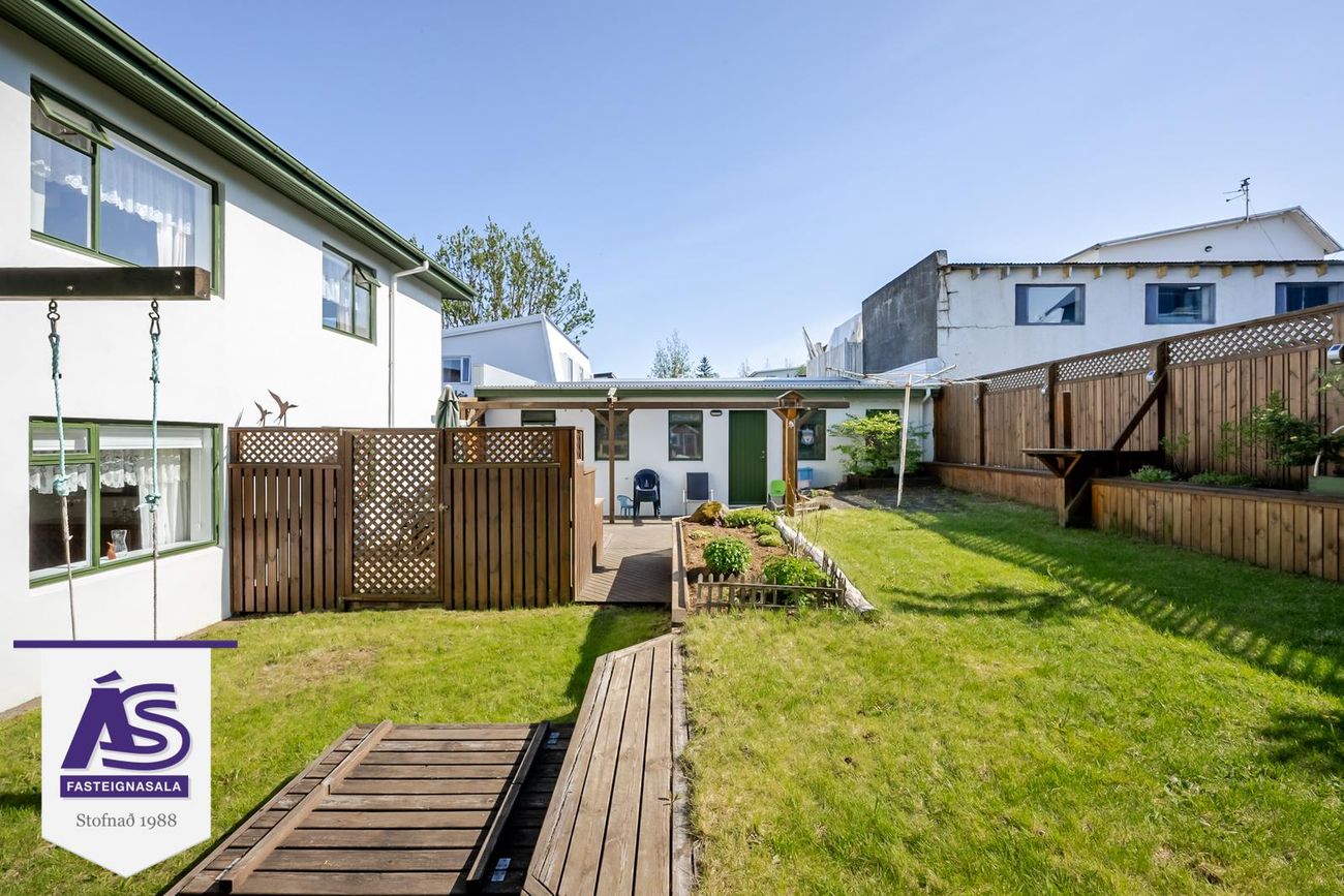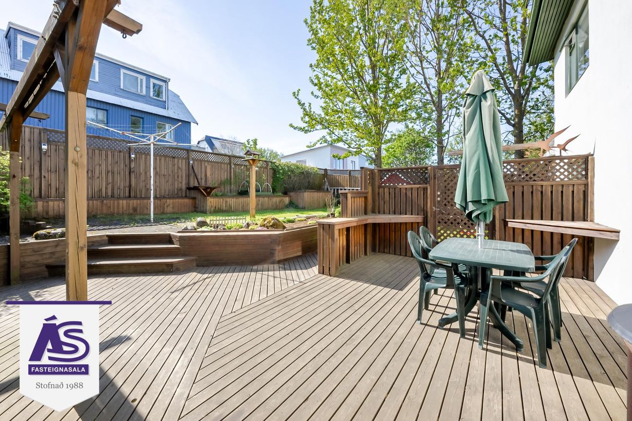 Garðurinn virkilega fallegur og skjólgóður, búið að skerma hann af með skjólveggjum hliðum þannig að hægt er að hafa hann alveg lokaðann. Lítið dúkkuhús, lokuð geymsla undir svölunum.