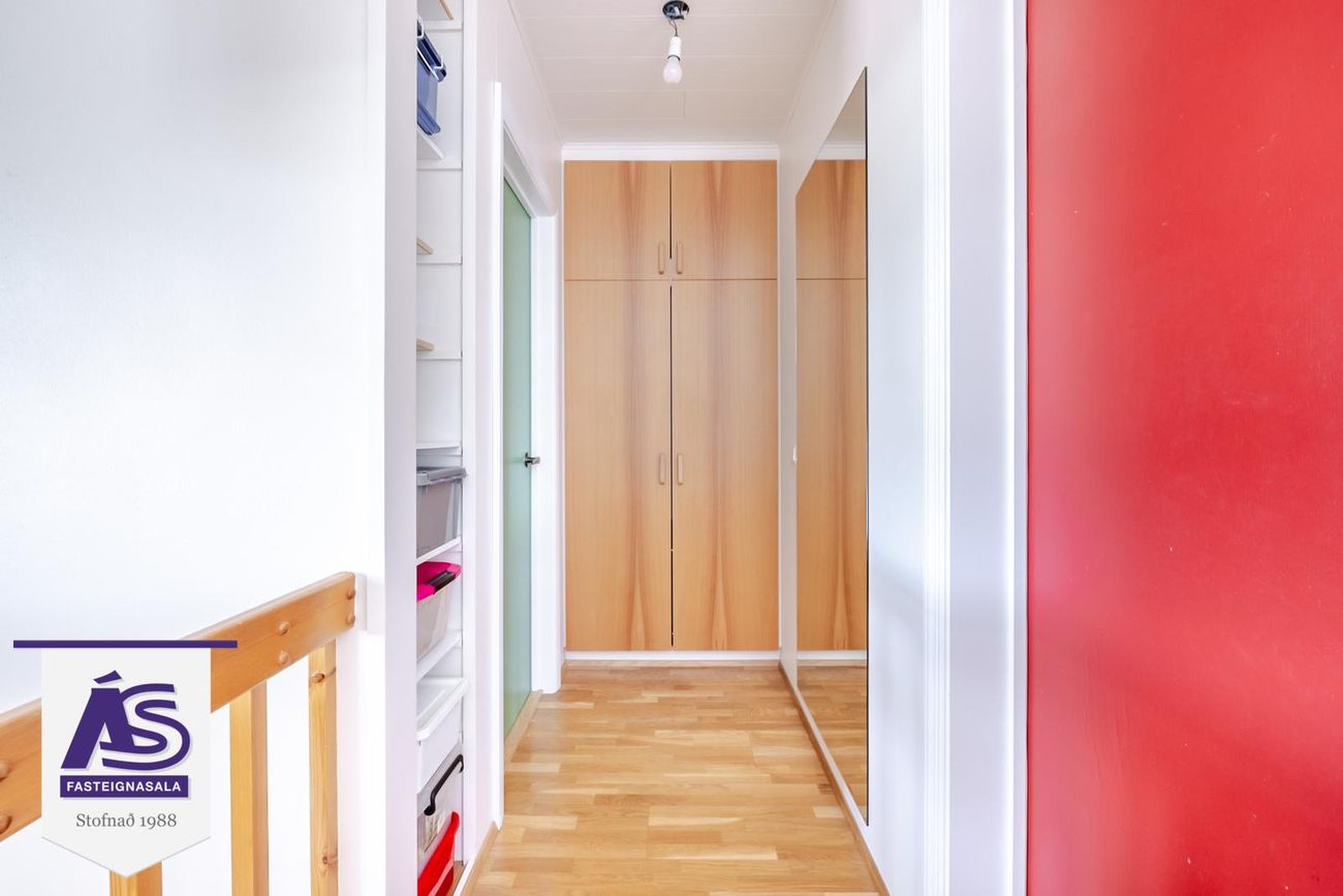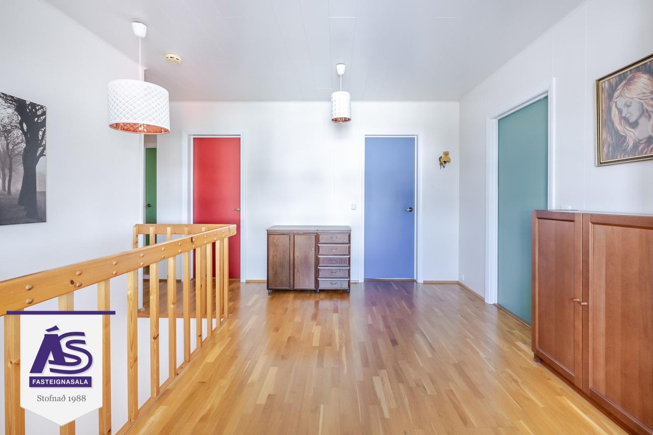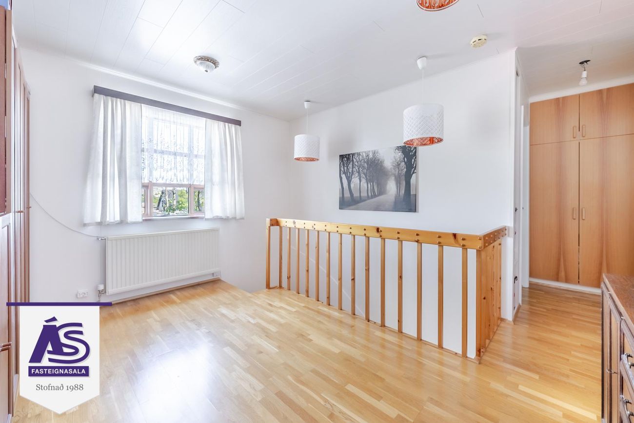 Efri hæð:Parketlagur stigi er milli hæða með næturlýsingu.