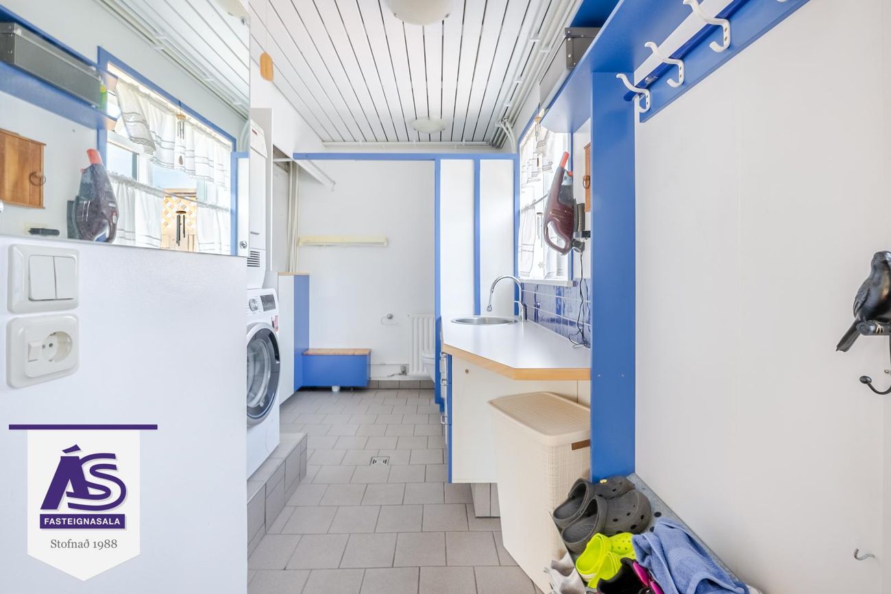 Þvottahús með stæði fyrir þvottavél og þurrkara, vaskur. Í enda þvottahúss er salerni, útgengt er úr þvottahúsi út á bílaplan.