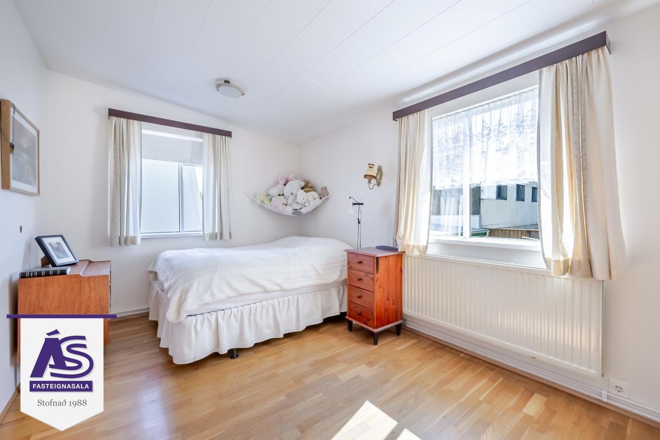 3 Svefnherbergi eru á efri hæðinni með parketi og skápar í einu þeirra. Útgengt út á svalir úr einu þeirra en á þær vantar handriði.