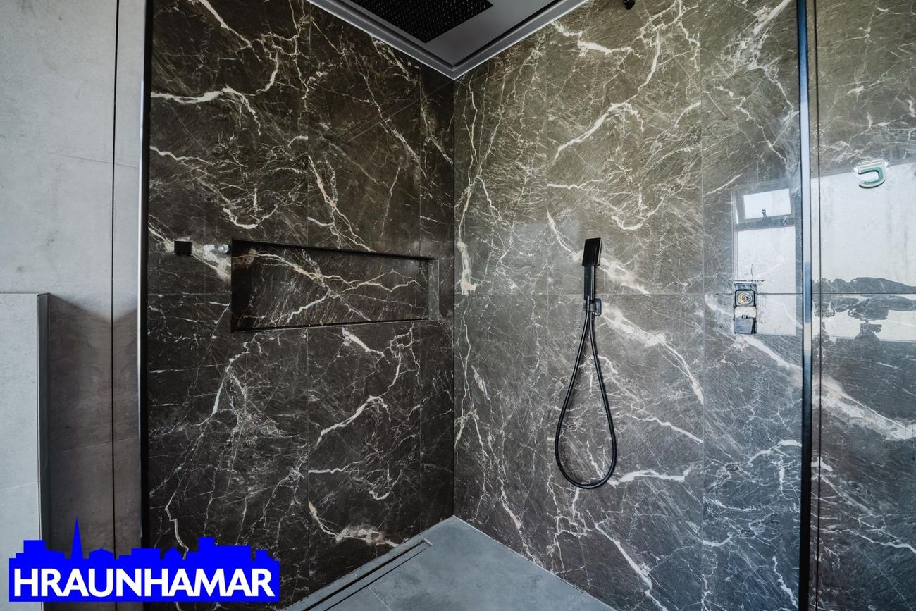 Gólfefni eru flísar, parket og flot.