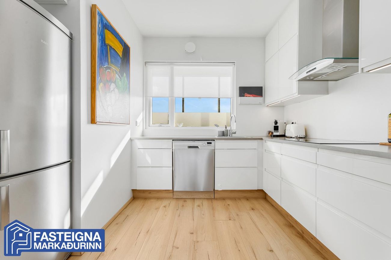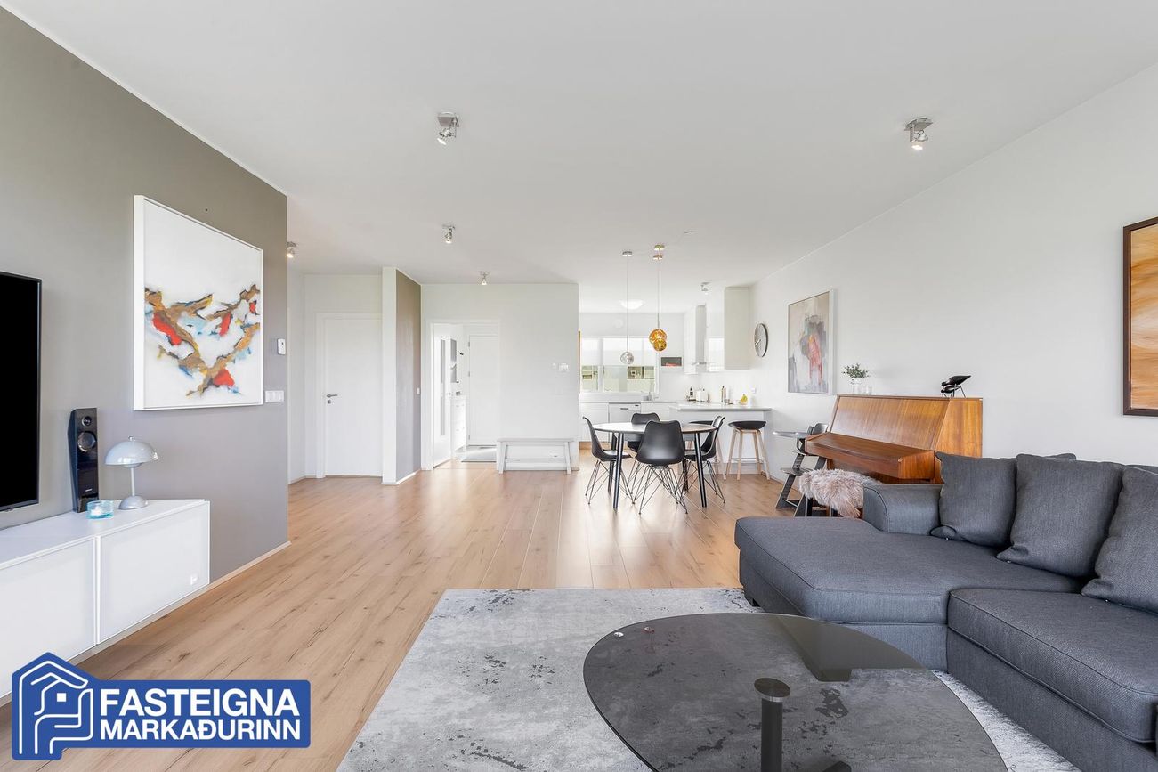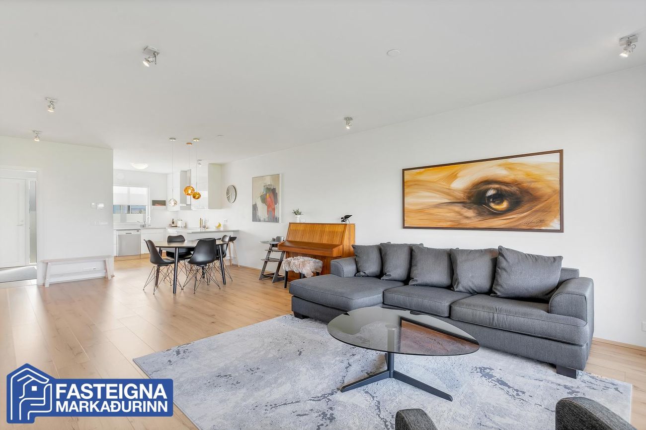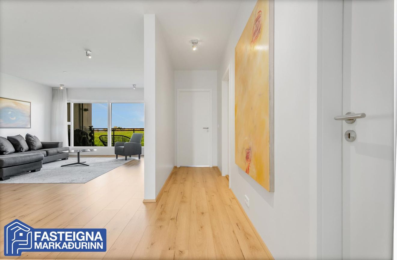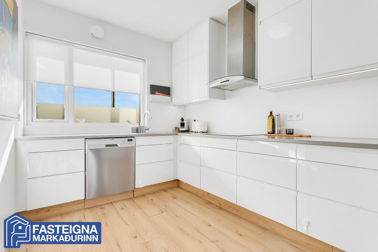 Sér þvottaherbergi er innan eignar og út frá stofu eru stórar svalir sem snúa til vesturs með fallegt útsýni til sjávar og víðar. Innréttingar í eldhúsi og baðherbergi eru frá HTH. Lýsing eignar:Inngangur, sameiginlegur, flísar á andyri og teppi á strigahúsi.