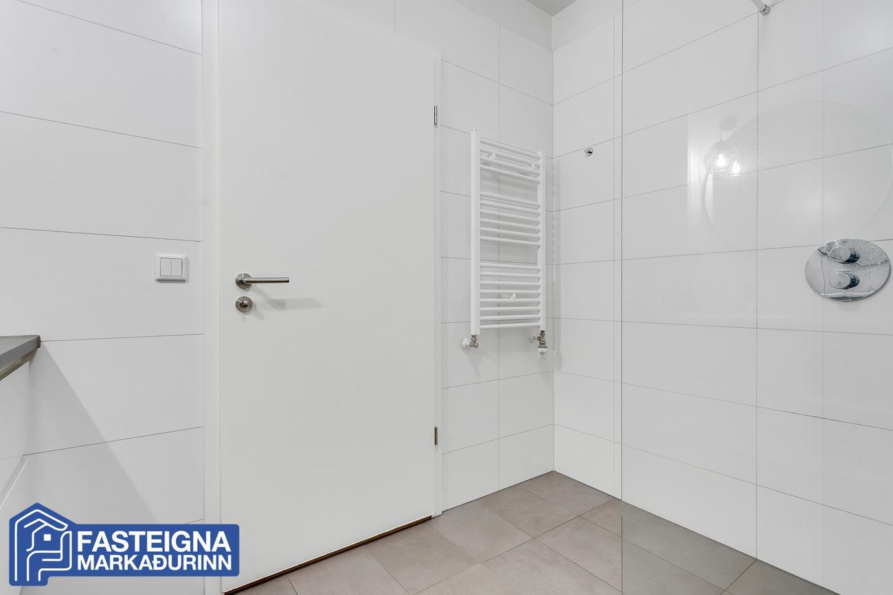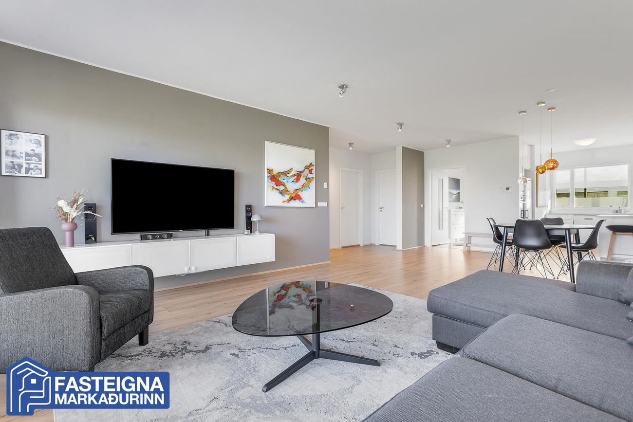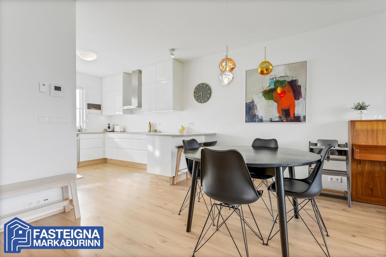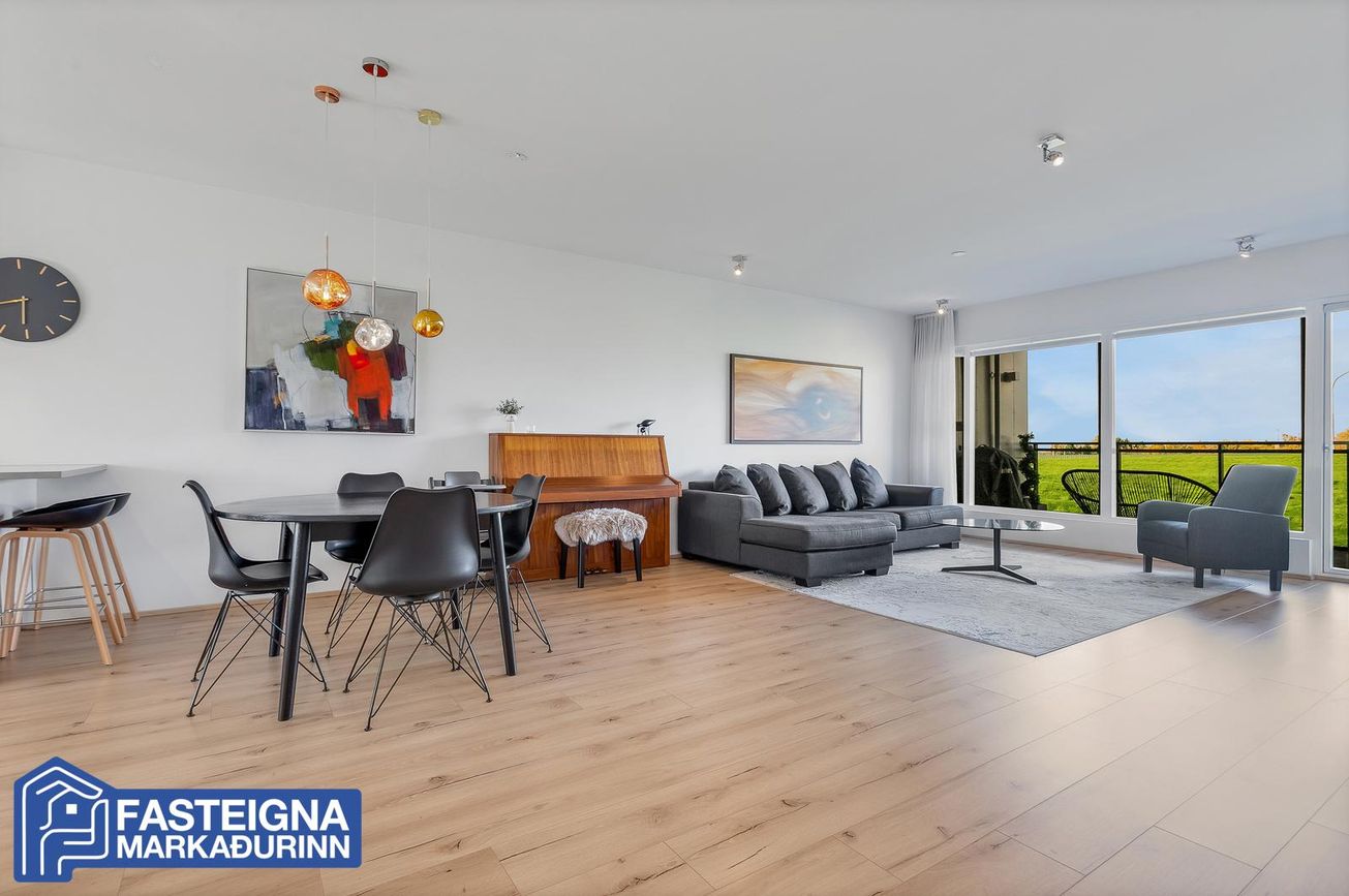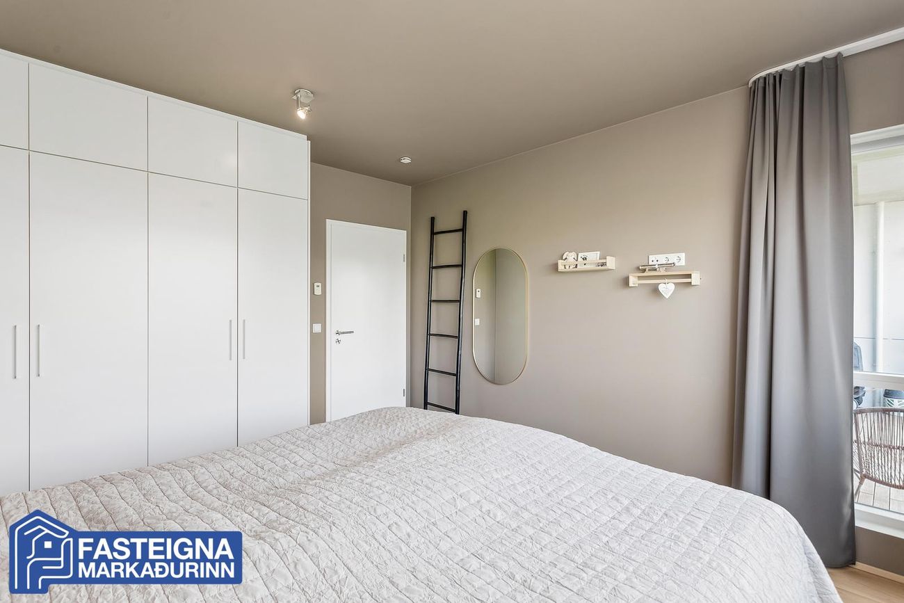 Sér þvottaherbergi er innan eignar og út frá stofu eru stórar svalir sem snúa til vesturs með fallegt útsýni til sjávar og víðar. Innréttingar í eldhúsi og baðherbergi eru frá HTH. Lýsing eignar:Inngangur, sameiginlegur, flísar á andyri og teppi á strigahúsi.
