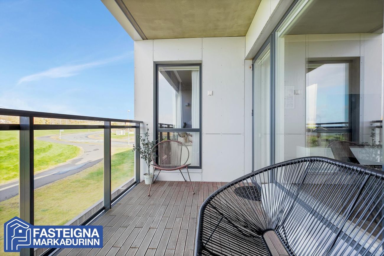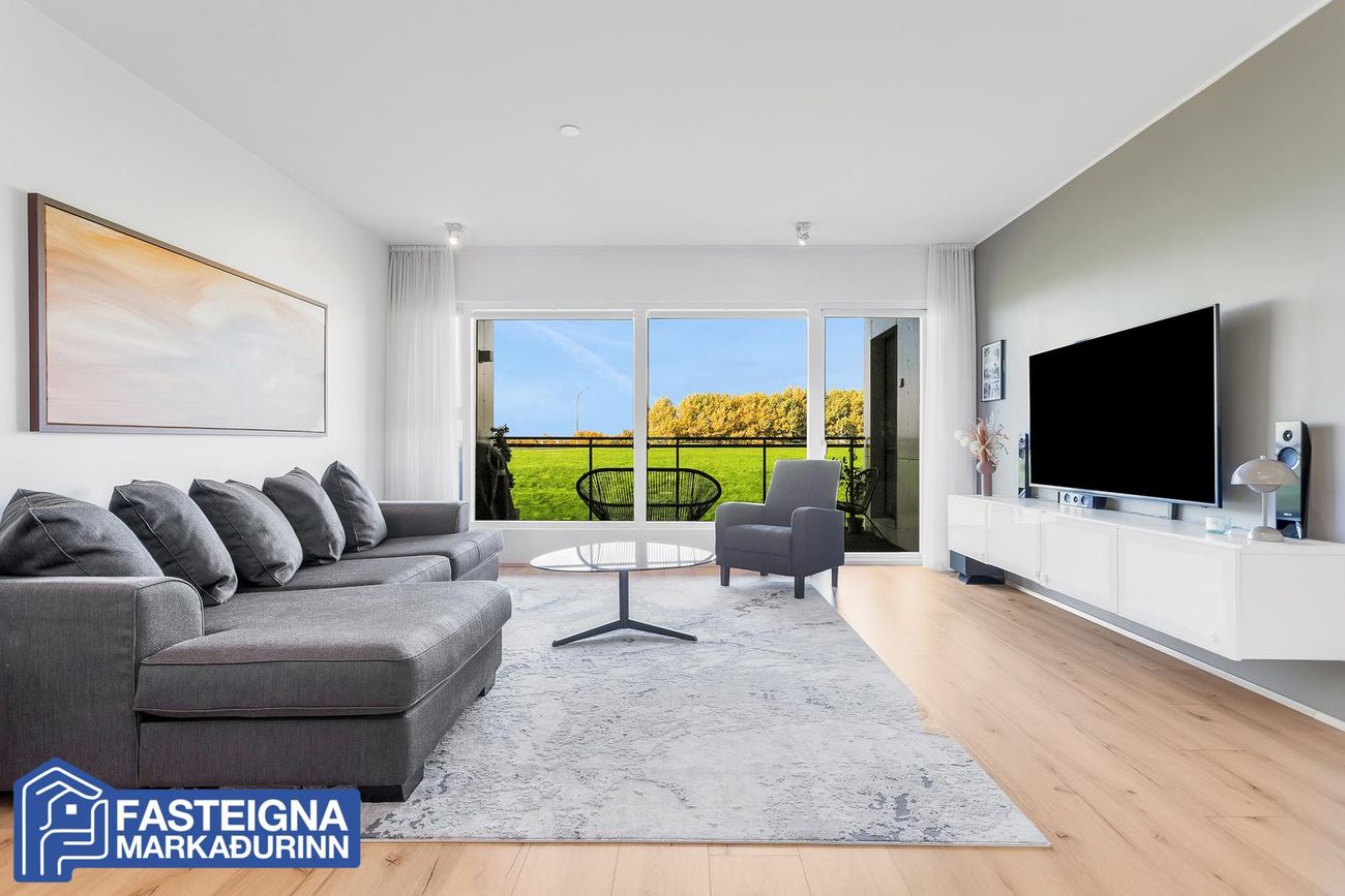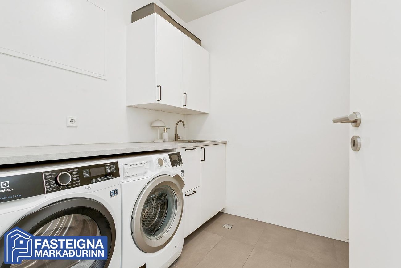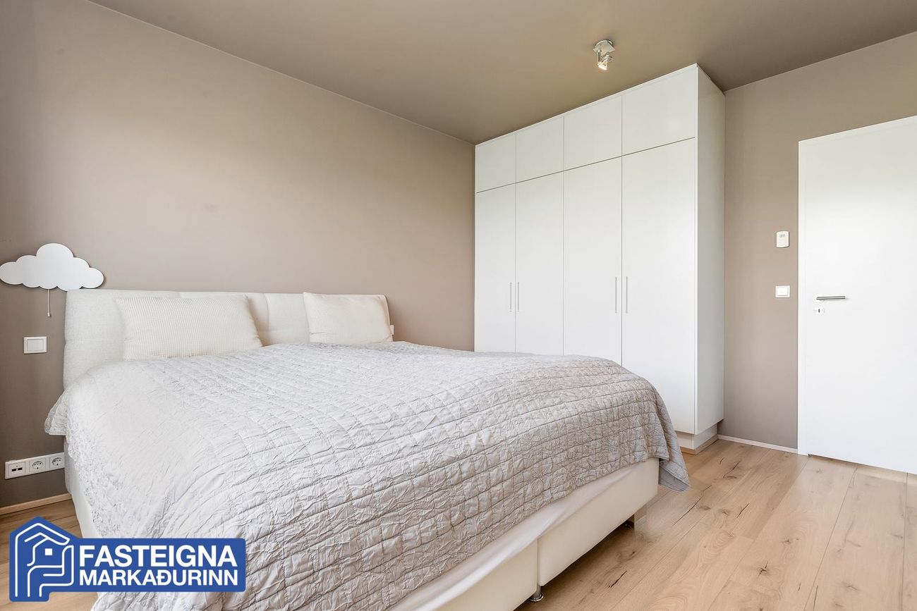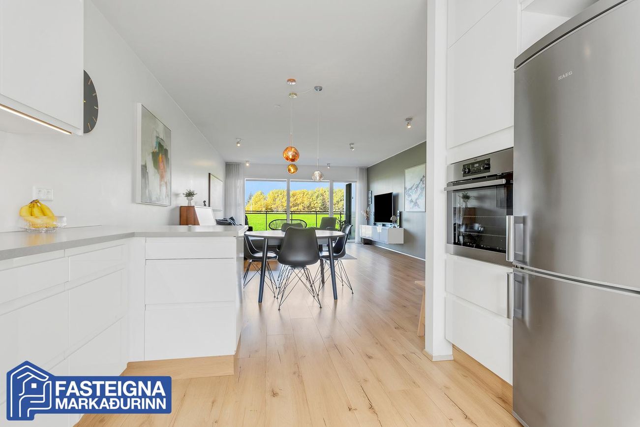 Sér þvottaherbergi er innan eignar og út frá stofu eru stórar svalir sem snúa til vesturs með fallegt útsýni til sjávar og víðar. Innréttingar í eldhúsi og baðherbergi eru frá HTH. Lýsing eignar:Inngangur, sameiginlegur, flísar á andyri og teppi á strigahúsi.