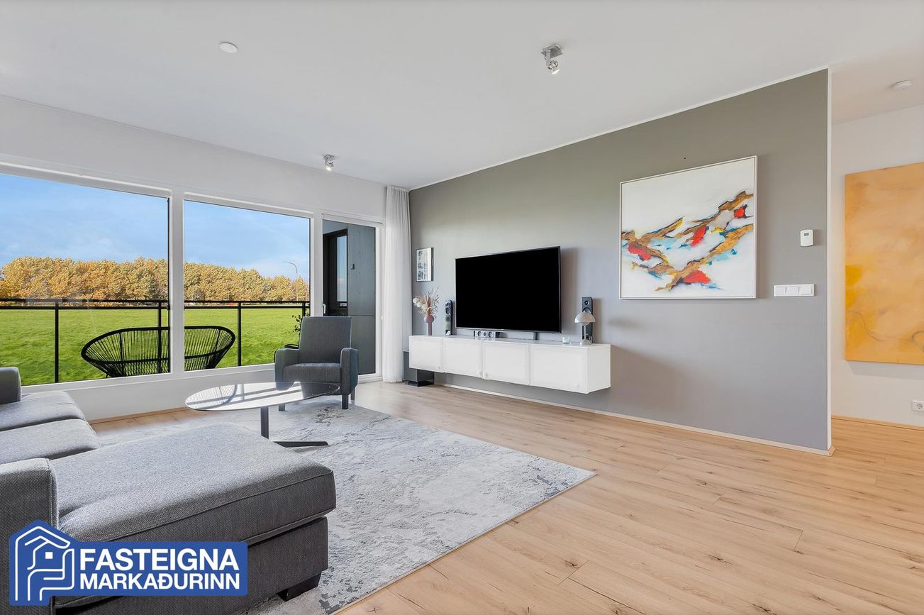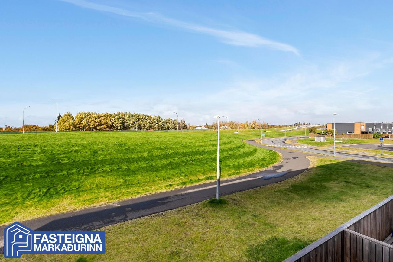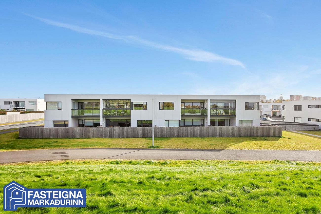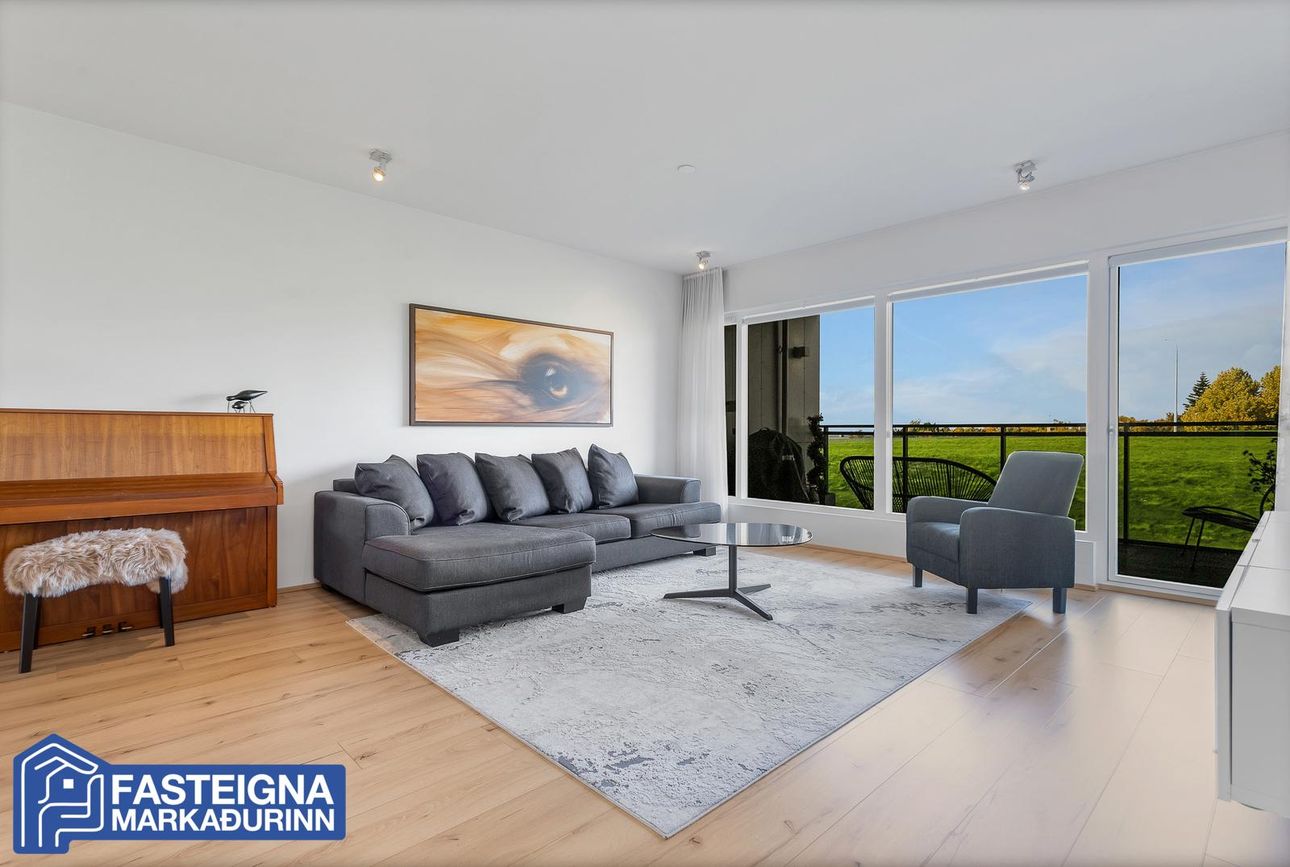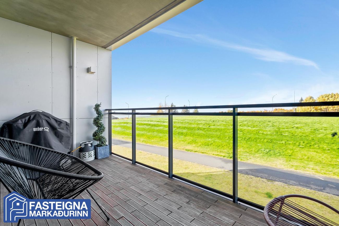 Sér þvottaherbergi er innan eignar og út frá stofu eru stórar svalir sem snúa til vesturs með fallegt útsýni til sjávar og víðar. Innréttingar í eldhúsi og baðherbergi eru frá HTH. Lýsing eignar:Inngangur, sameiginlegur, flísar á andyri og teppi á strigahúsi.