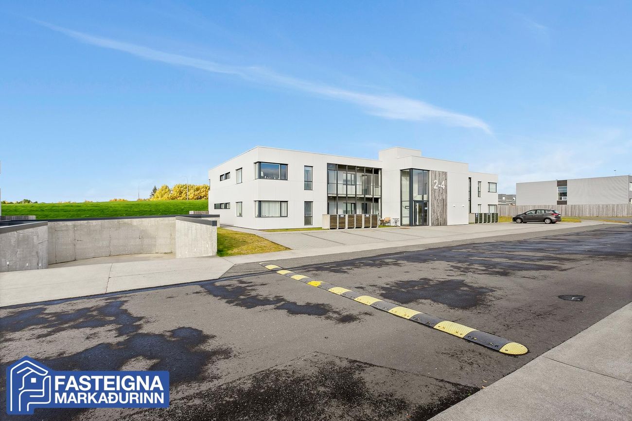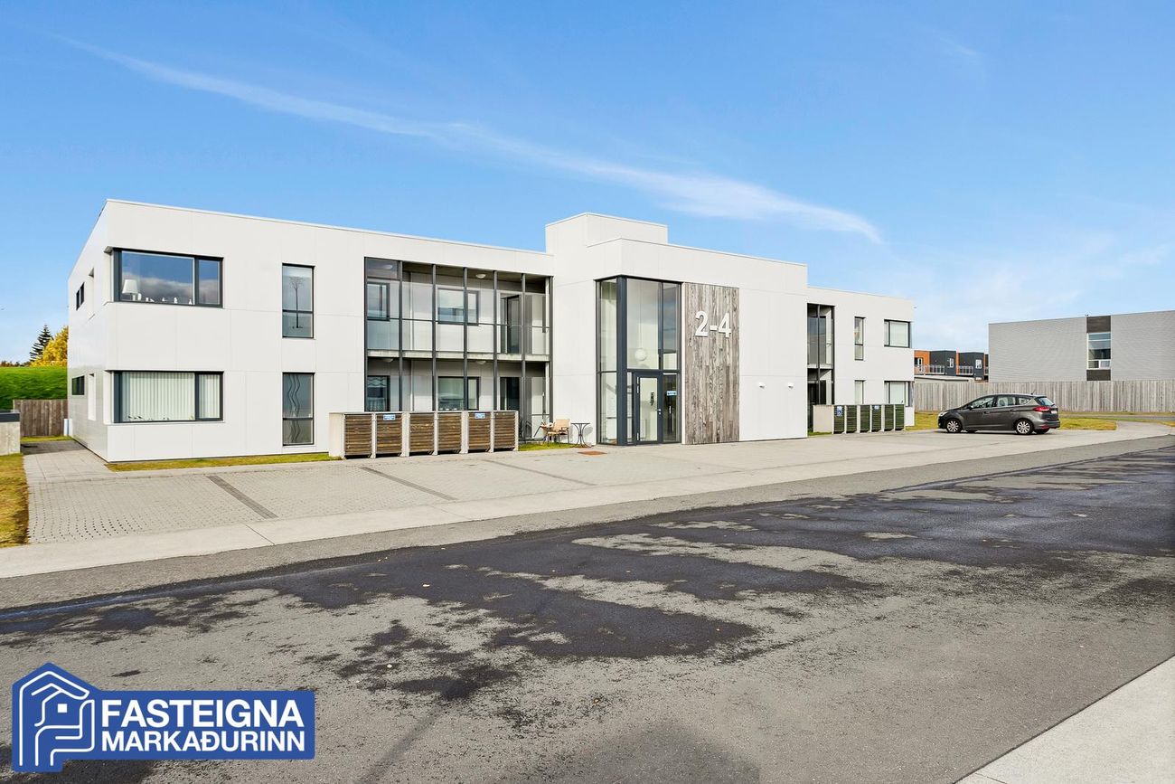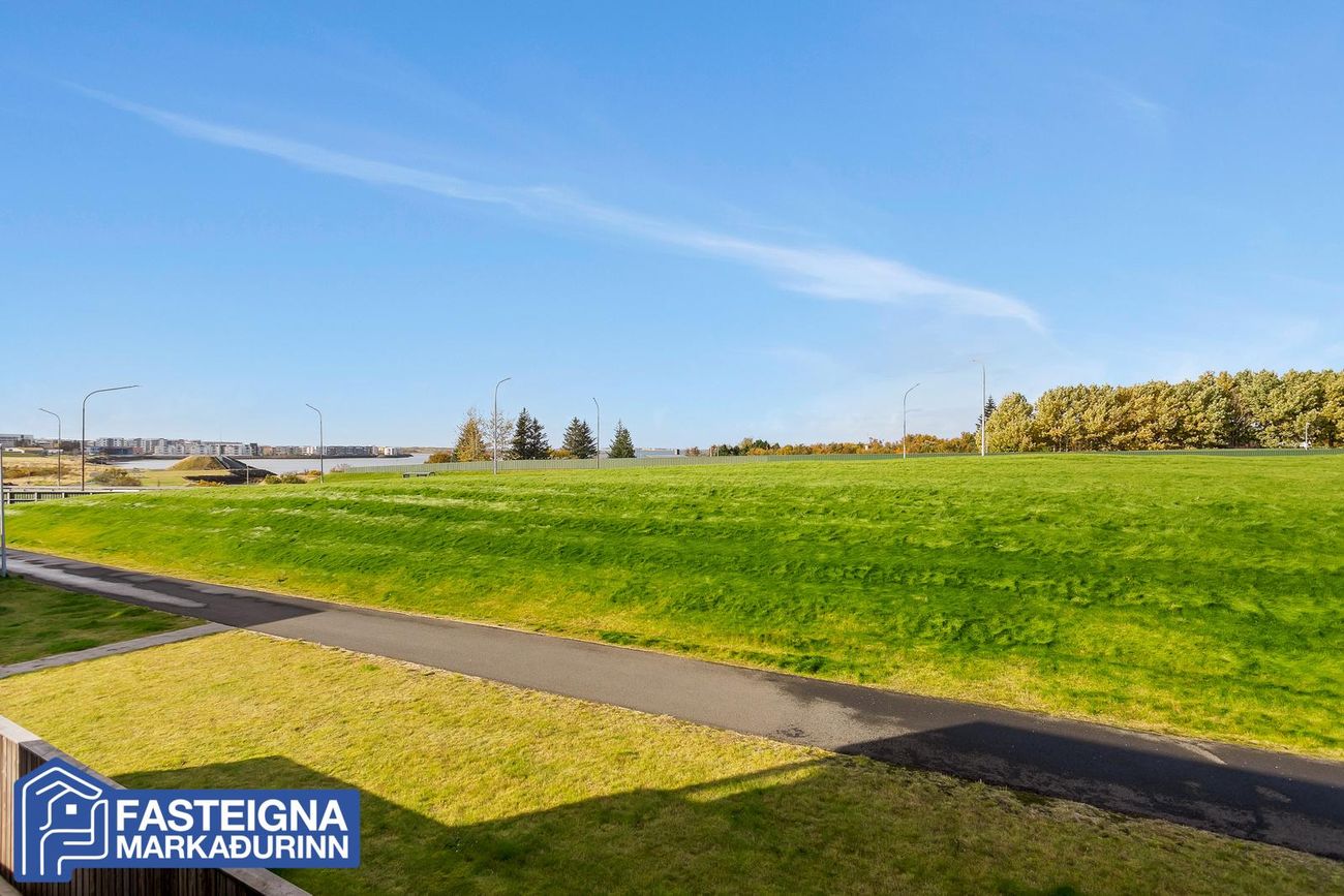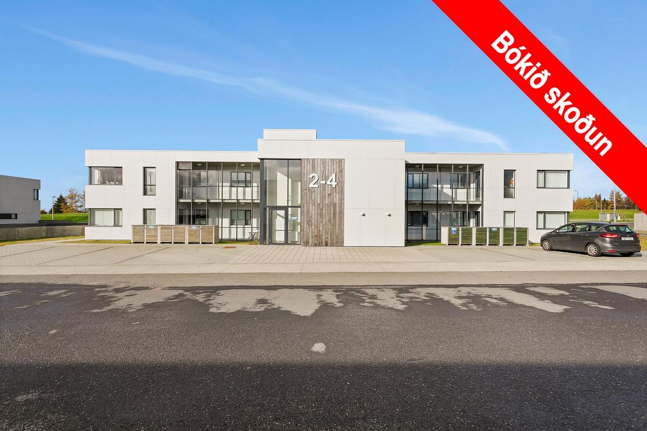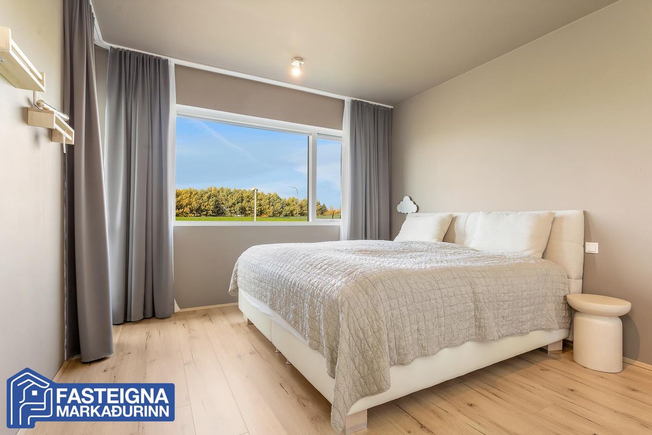 Sér þvottaherbergi er innan eignar og út frá stofu eru stórar svalir sem snúa til vesturs með fallegt útsýni til sjávar og víðar. Innréttingar í eldhúsi og baðherbergi eru frá HTH. Lýsing eignar:Inngangur, sameiginlegur, flísar á andyri og teppi á strigahúsi.