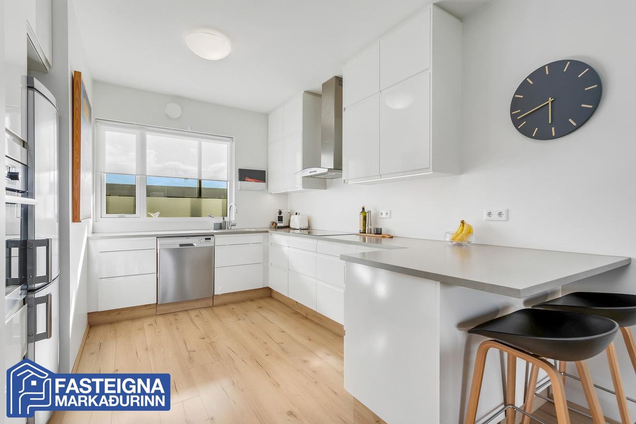 Eldhús, parketlagt með fallegum hvítum HTH innréttingum, tengi fyrir uppþvottavél, ofn í vinnuhæð, spanhelluborð og vifta. Barborð með pláss fyrir tvo stóla er við eldhús.