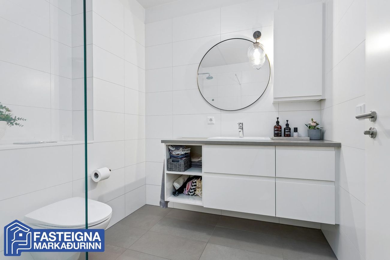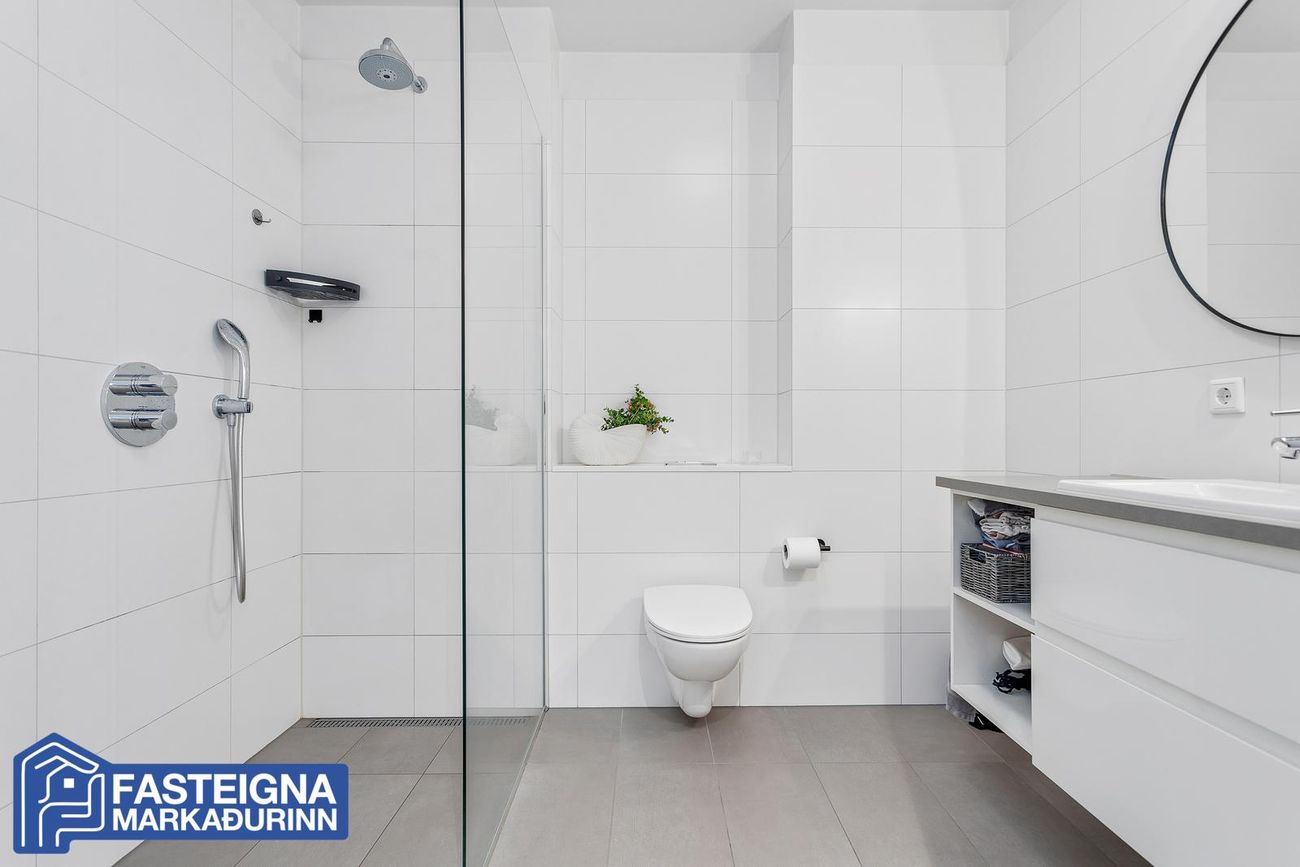 Baðherbergi, rúmgott, flísalagt gólf og veggir, flísalögð sturta með sturtgleri, vegghengt wc. og innrétting.