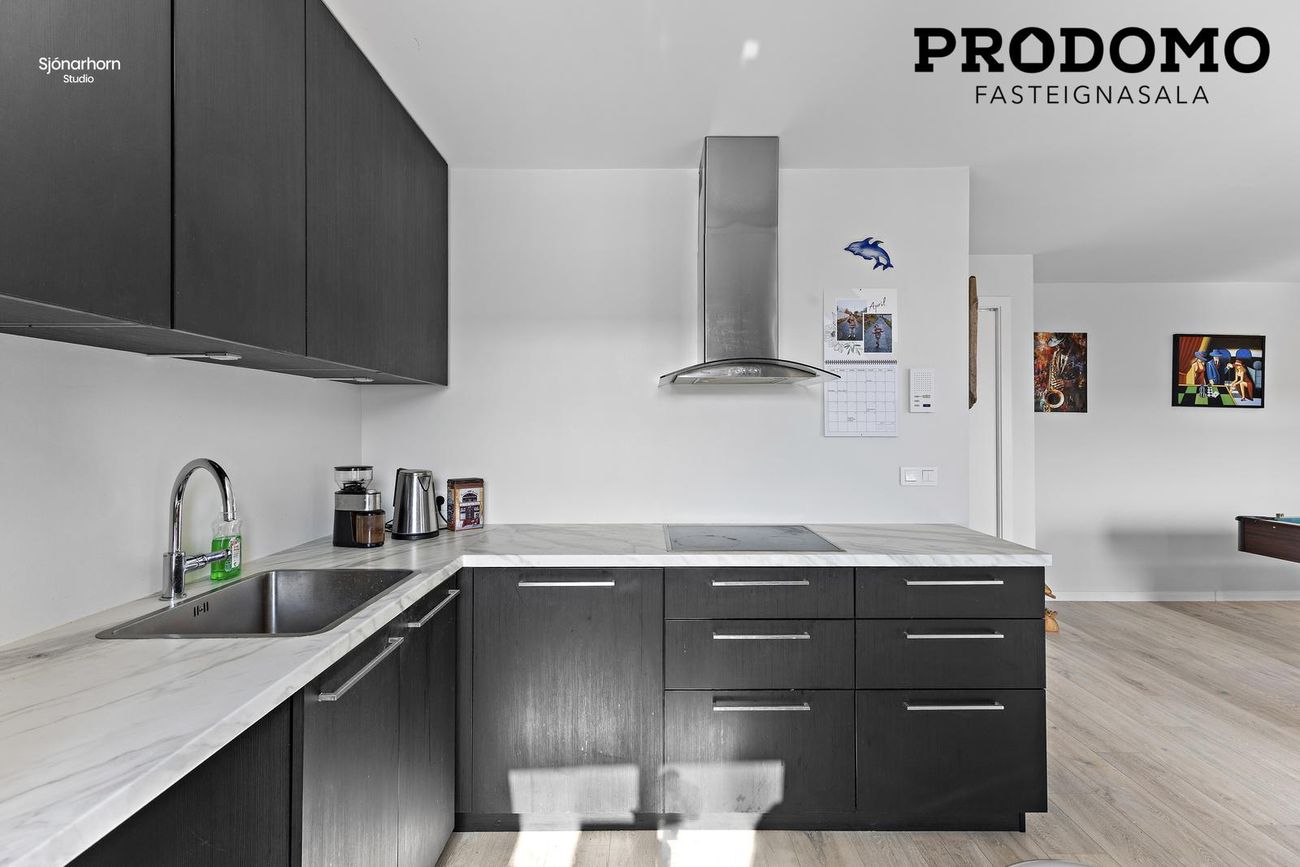 Eldhús með parketi á gólfi og nýrri fallegri svartri innréttingu með helluborði, ofni og viftu. Gert er ráð fyrir uppþvottavél.