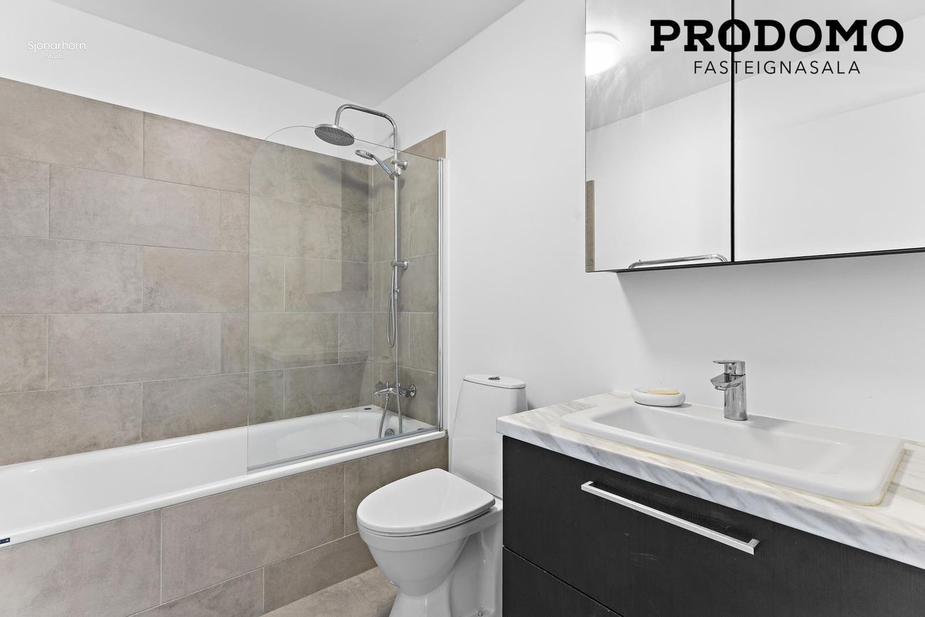 Baðherbergi með flísum á gólfi og veggjum að hluta til. Þar er nýleg innrétting og baðkar með sturtu.