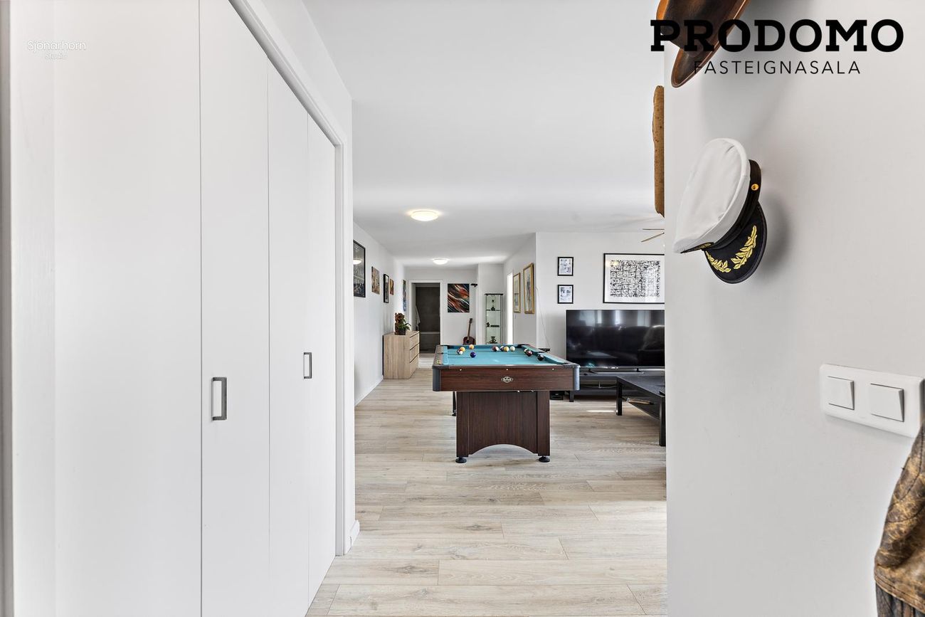 Stofa / sjónvarpshol með parketi á gólfi. Þaðan er útgengt á svalir.