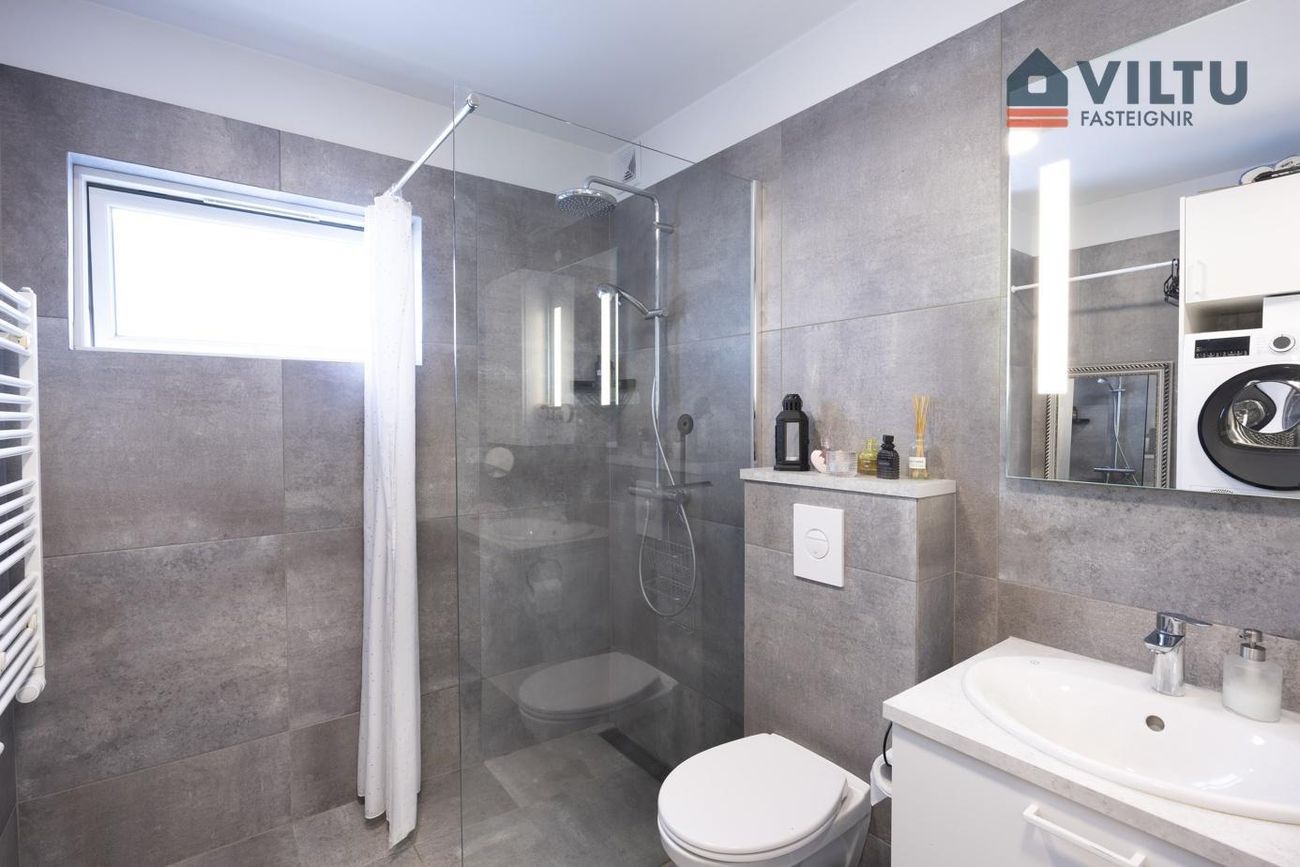 Rúmgt baðherbergi með flísalegð hólf og gólf, upphengt salerni, handklæðaofni, walk-in sturta og tengi fyrir þvottavél og þurrkara.