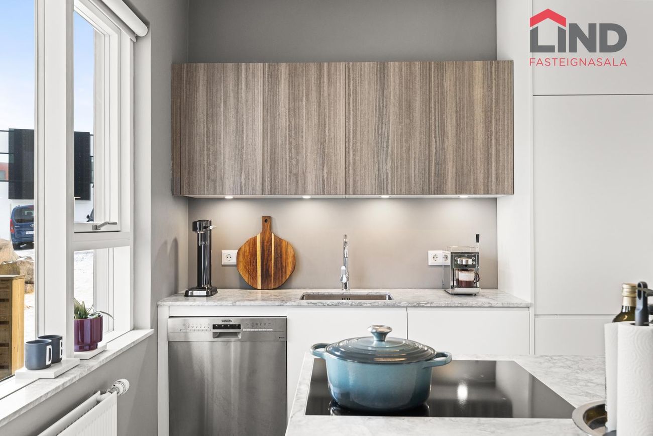 Lind fasteignasala / Heimir Hallgrímsson lögg. fasteignasali kynnir afar glæsilega 109,4 fermetra 3ja herbergja íbúð á 1. hæð (merkt íbúð 201) með tvennum veröndum til suðurs og norðurs við Brekkugötu 1 í Garðabæ. Fallegt lyftuhús byggt árið 2019. Íbúðin er björt og virkilega vel skipulögð þar sem glæsilegt endurnýjað eldhús er staðsett í miðju alrými með borðstofu og setustofu sitthvoru megin í alrýminu. Stór afgirt verönd til suðurs og önnur verönd frá eldhúsi með fallegu útsýni til fjalla. Vandað eldhús með stórri eldhúseyju með steini á borðum, niðurteknu lofti með innfelldum ljósum og Siemens Studio Line eldhústækjum. Góð svefnherbergi með skápum. Rúmgott þvottaherbergi er staðsett inn af eldhúsi. Myndavéladyrasími er í húsinu.