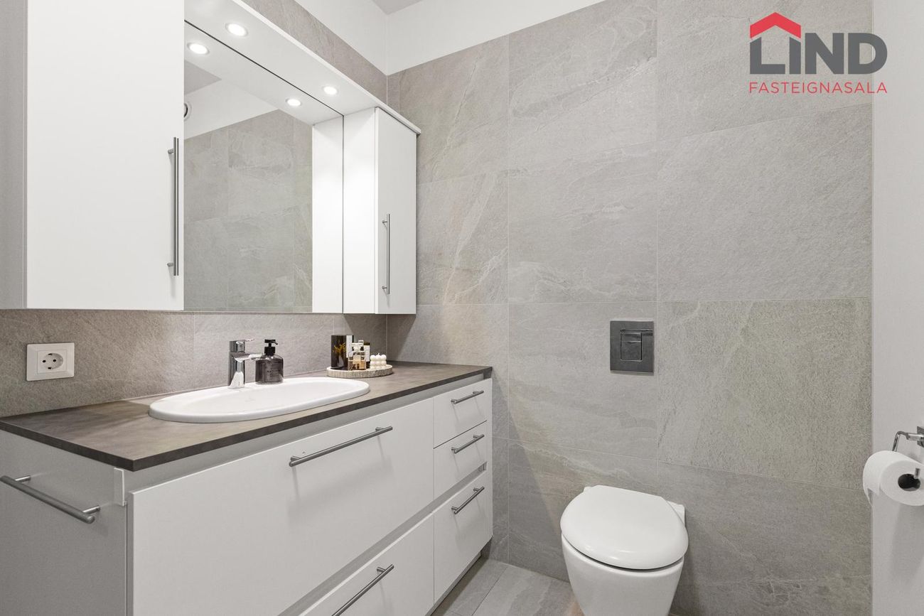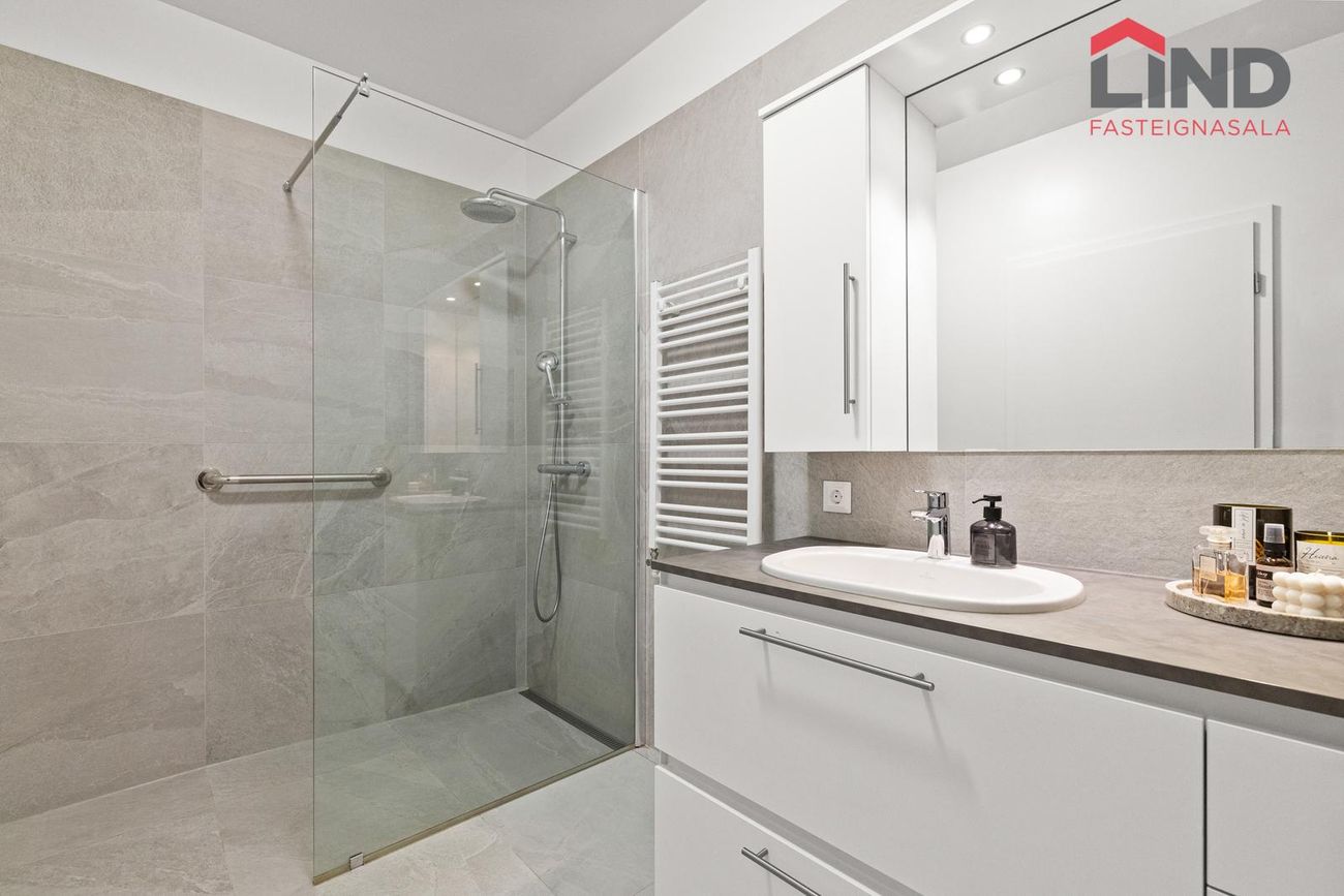 Baðherbergi: Með flísum á gólfi og hluta veggja. Flísalögð sturta með glerþili, falleg innrétting við vask og skápum fyrir ofan. Upphengt innbyggt salerni og handklæðaofn.