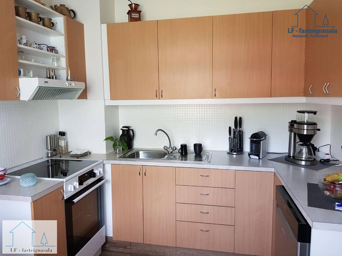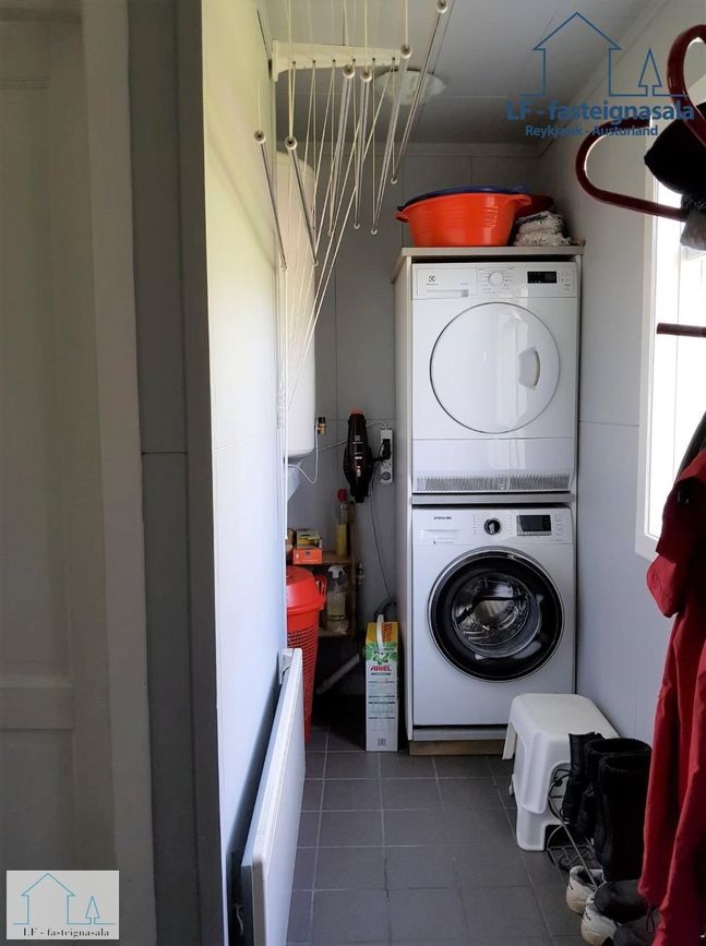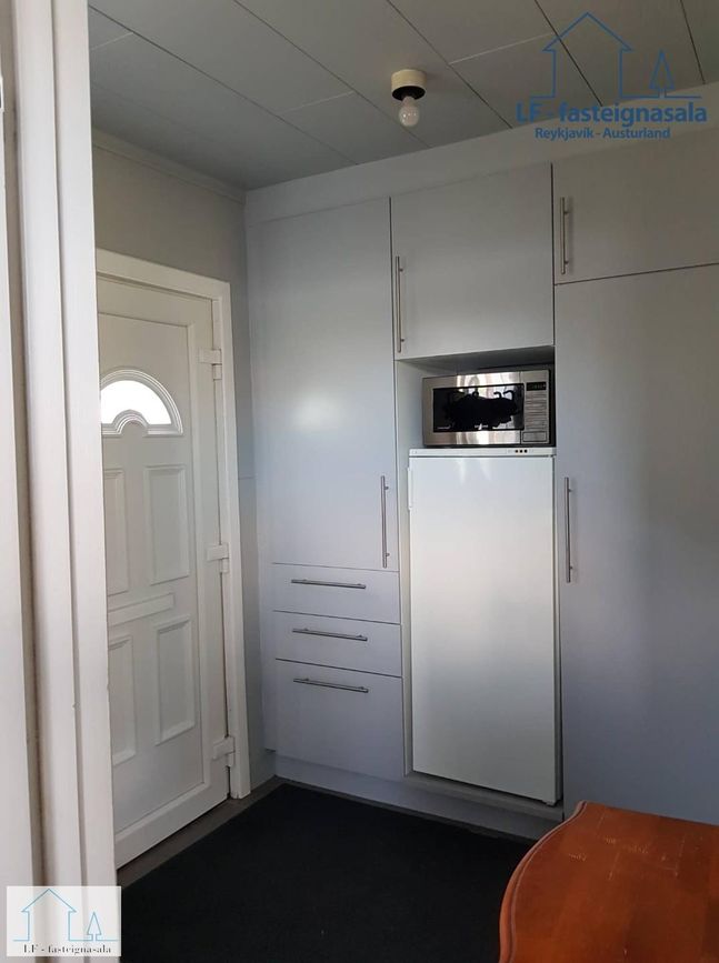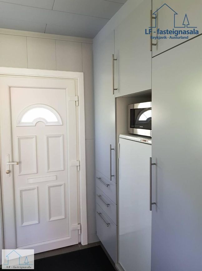 Við hlið þvottahússins er innrétting sem er nokkurskonar viðbót við eldhúsinnréttinguna og þar er pláss fyrir frystiskáp.