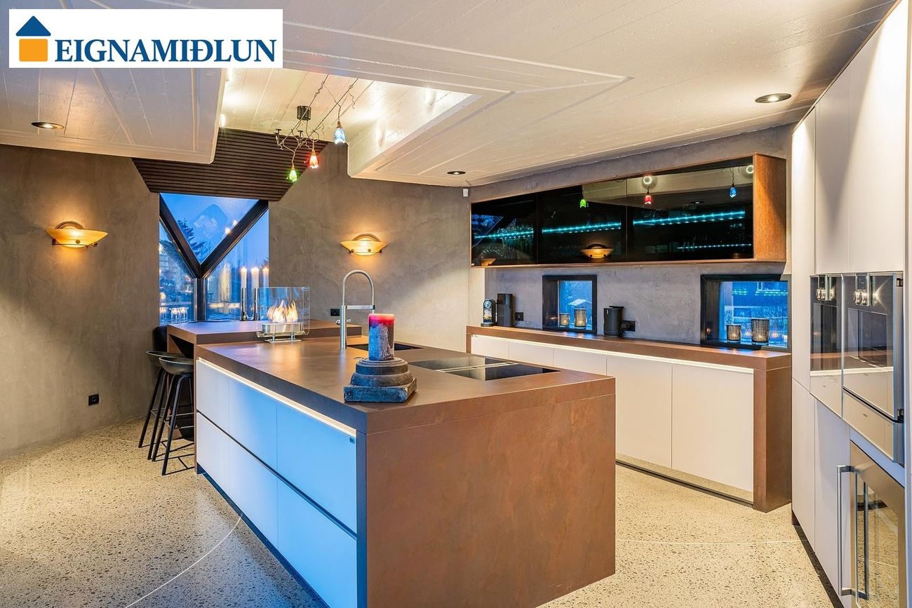 Eldhús: Stórt með sérsmíðaða, glerklædda eldhúsinnréttingu frá Häcker með Gaggenau tækjum (bakara-og grillofn, gufuofn, hitaplata og tvöfaldur vínkælir), gott pláss fyrir borðstofuborð í stækkaðri borðstofu með glæsilegu útsýni. Í eldhúsinu er einstaklega stór eldunareyja úr hitaþolnu Dekton steinefni með borðaðstöðu og Bora spanhelluborði með gufugleypi. Horngluggi til vesturs og gluggar til norðurs, innfelld lýsing og kastarar í lofti. Veggir eru með steinefnasparsli.