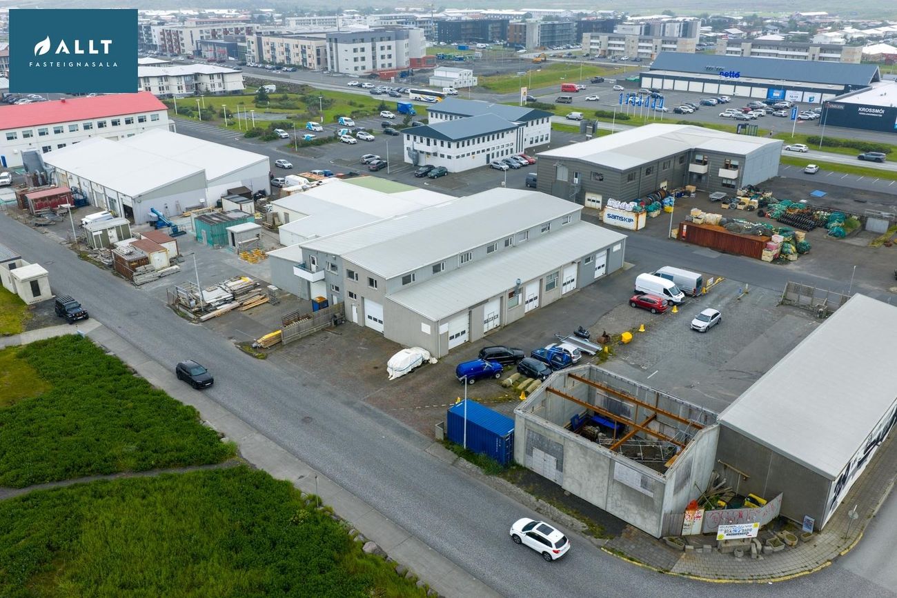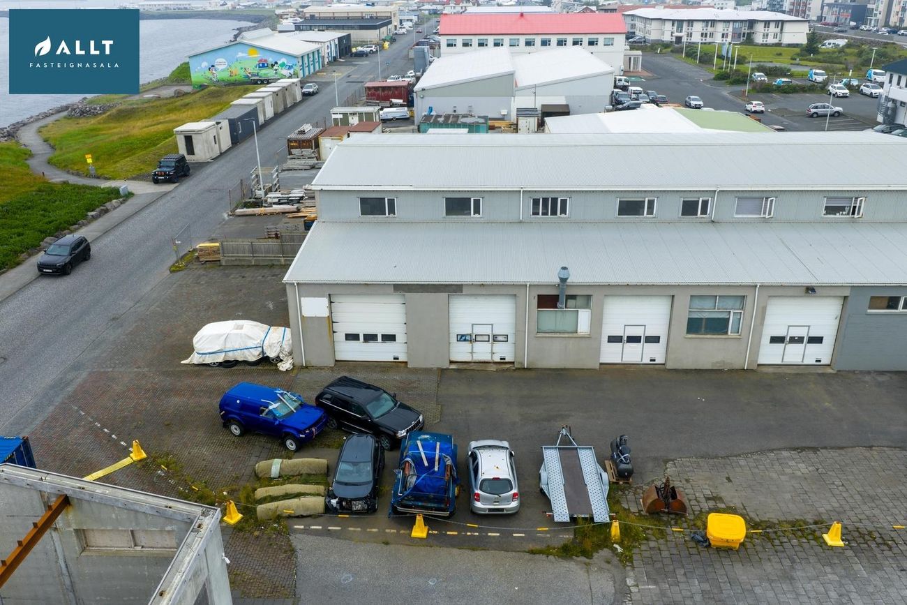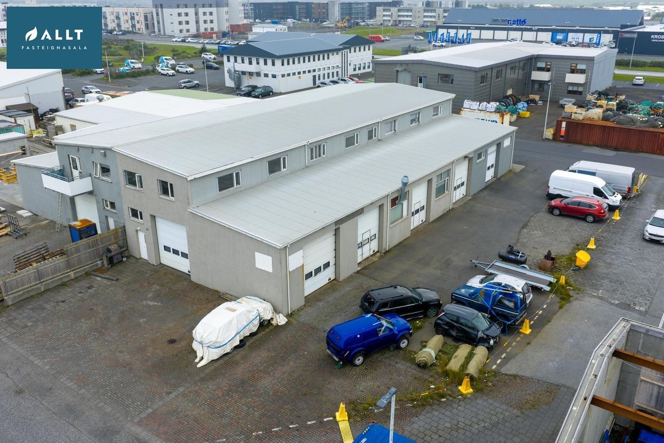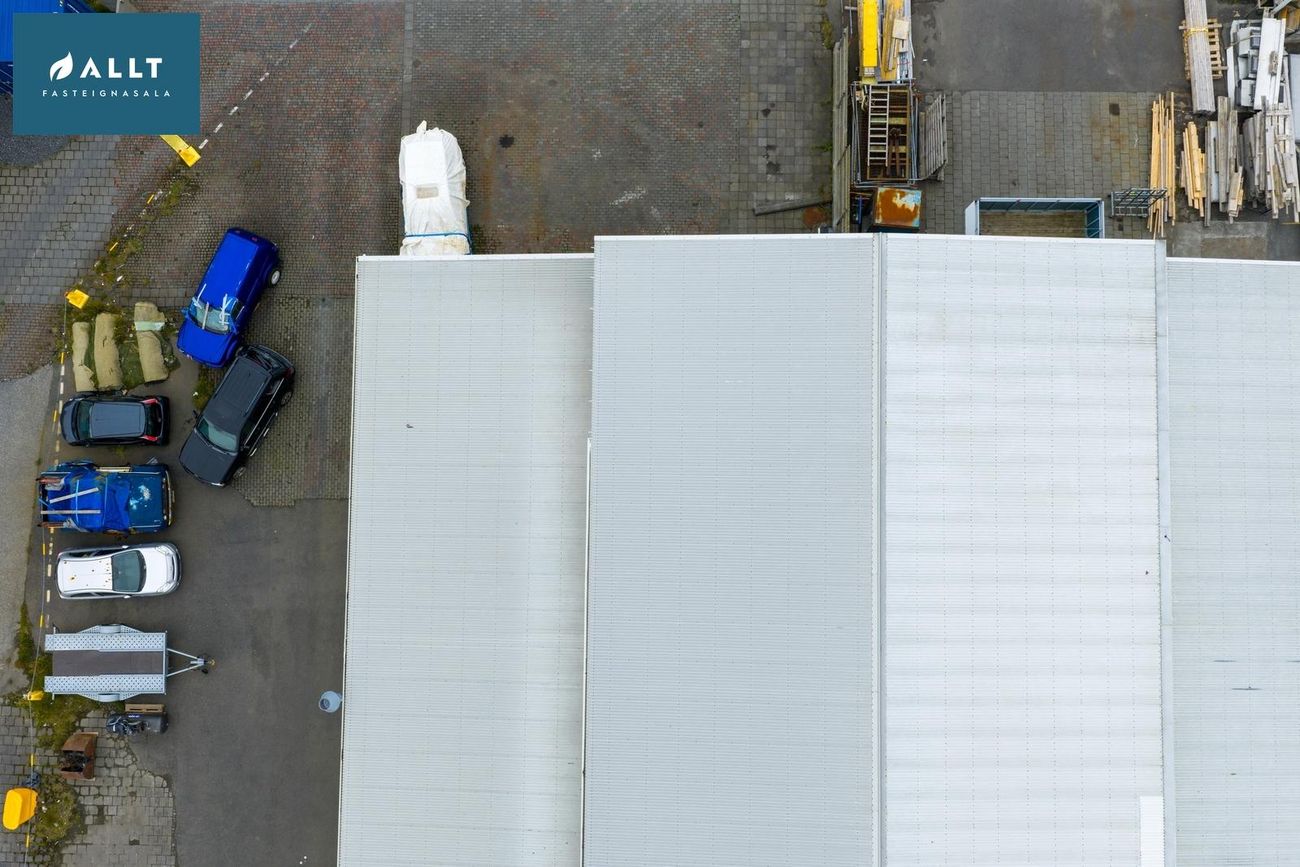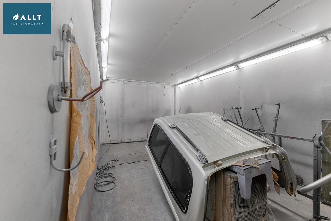 Neðrihæð samanstendur af 201.5 fm. Þrjár innkeyrsluhurðar, opið rými og búið að stúka af sprautuklefa ásamt geyslulofti. Afstúkað rými sem verkstjórarými sem í dag er notað til að blanda lakk. Gott bílastæði er við tvær hliðar eignarinnar.