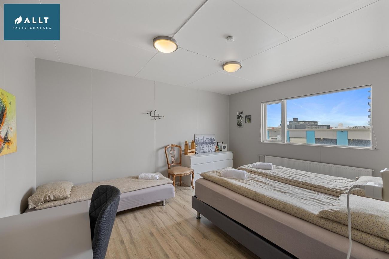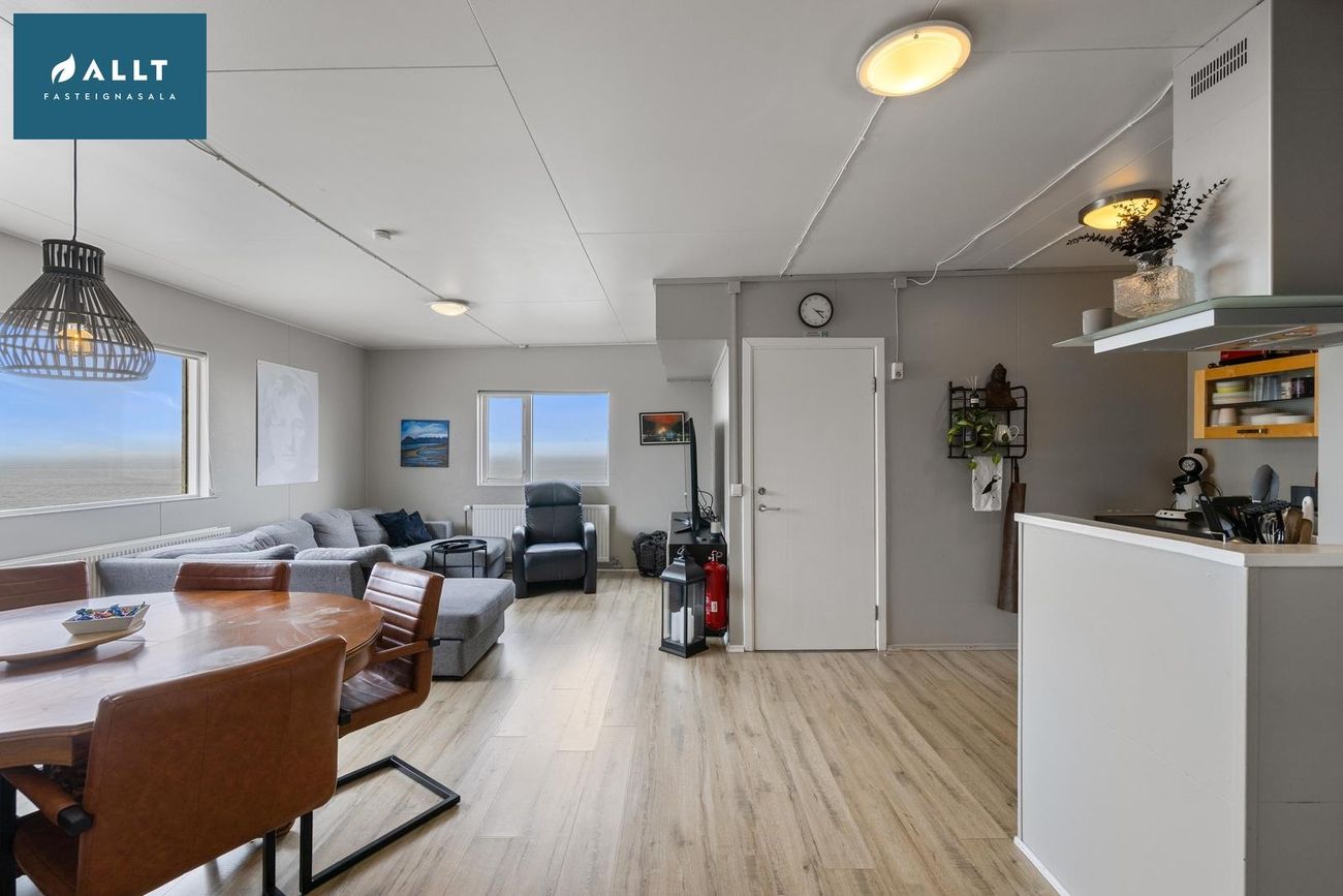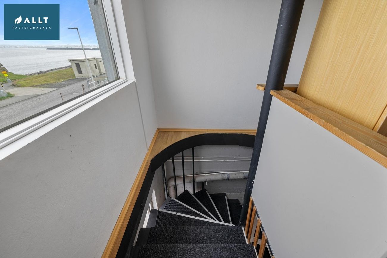 Efrihæð er innangeng frá stigagangi sem er líka getur verið sér inngang frá verkstæði. Gengið upp stiga, komið á stigapall og inn í innréttaða íbúð. Íbúðin er öll parketlögð. Skiptist í eldhús, stofu, borðstofu, flott útsýni er frá stofu yfir á Faxaflóa. Þvottahús, þrjú svefnherbergi ásamt baðherbergi.