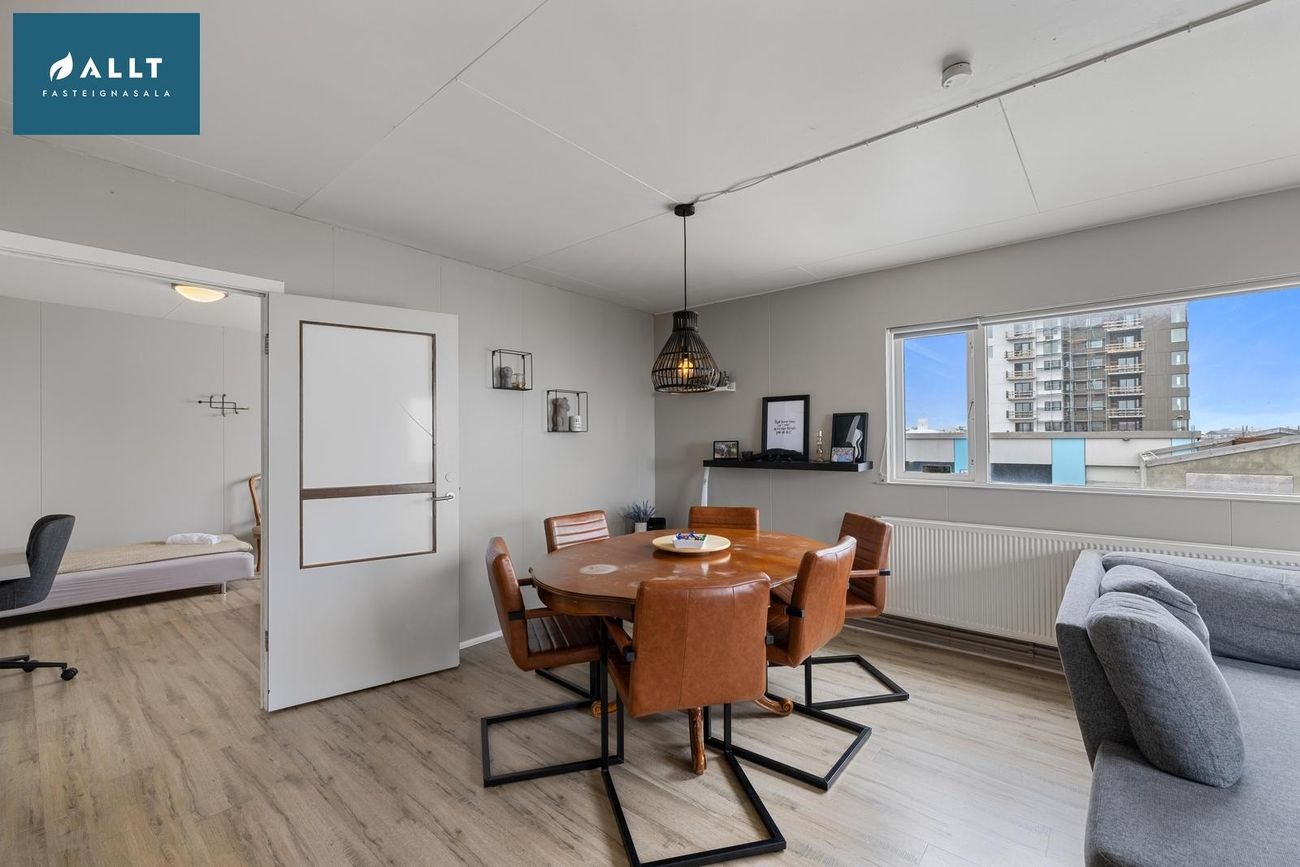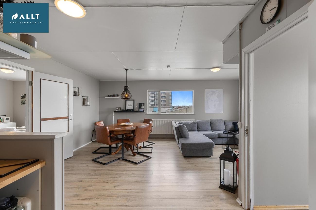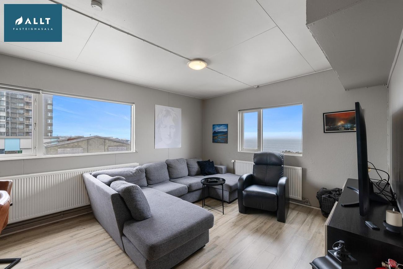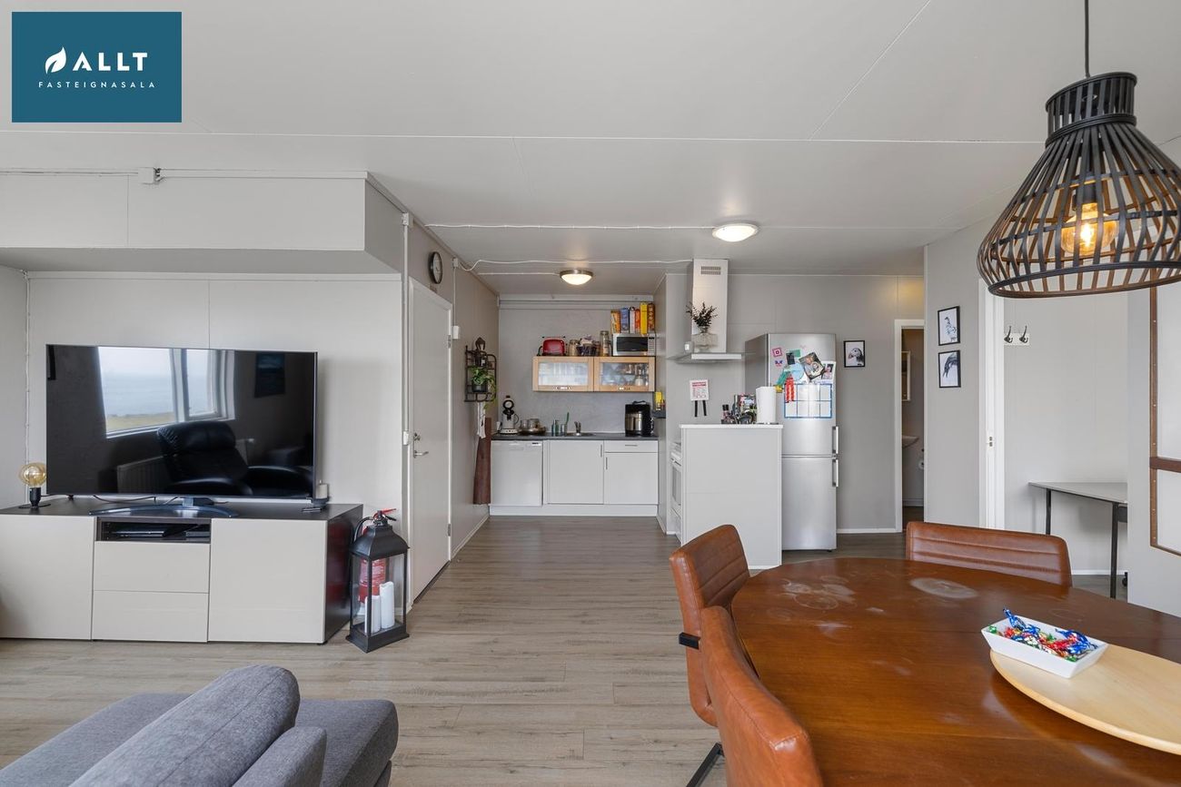 Efrihæð er innangeng frá stigagangi sem er líka getur verið sér inngang frá verkstæði. Gengið upp stiga, komið á stigapall og inn í innréttaða íbúð. Íbúðin er öll parketlögð. Skiptist í eldhús, stofu, borðstofu, flott útsýni er frá stofu yfir á Faxaflóa. Þvottahús, þrjú svefnherbergi ásamt baðherbergi.