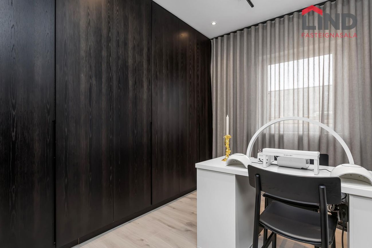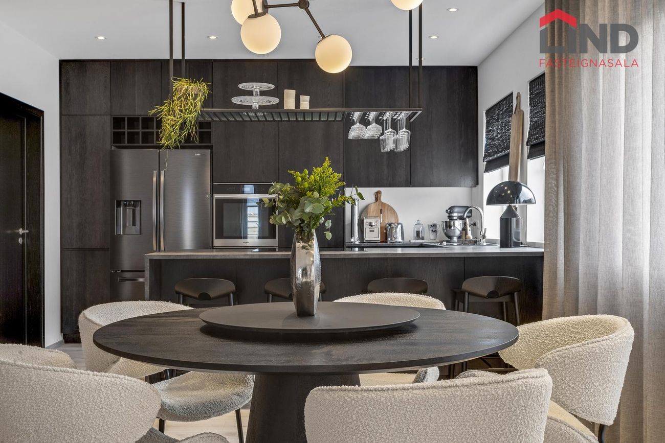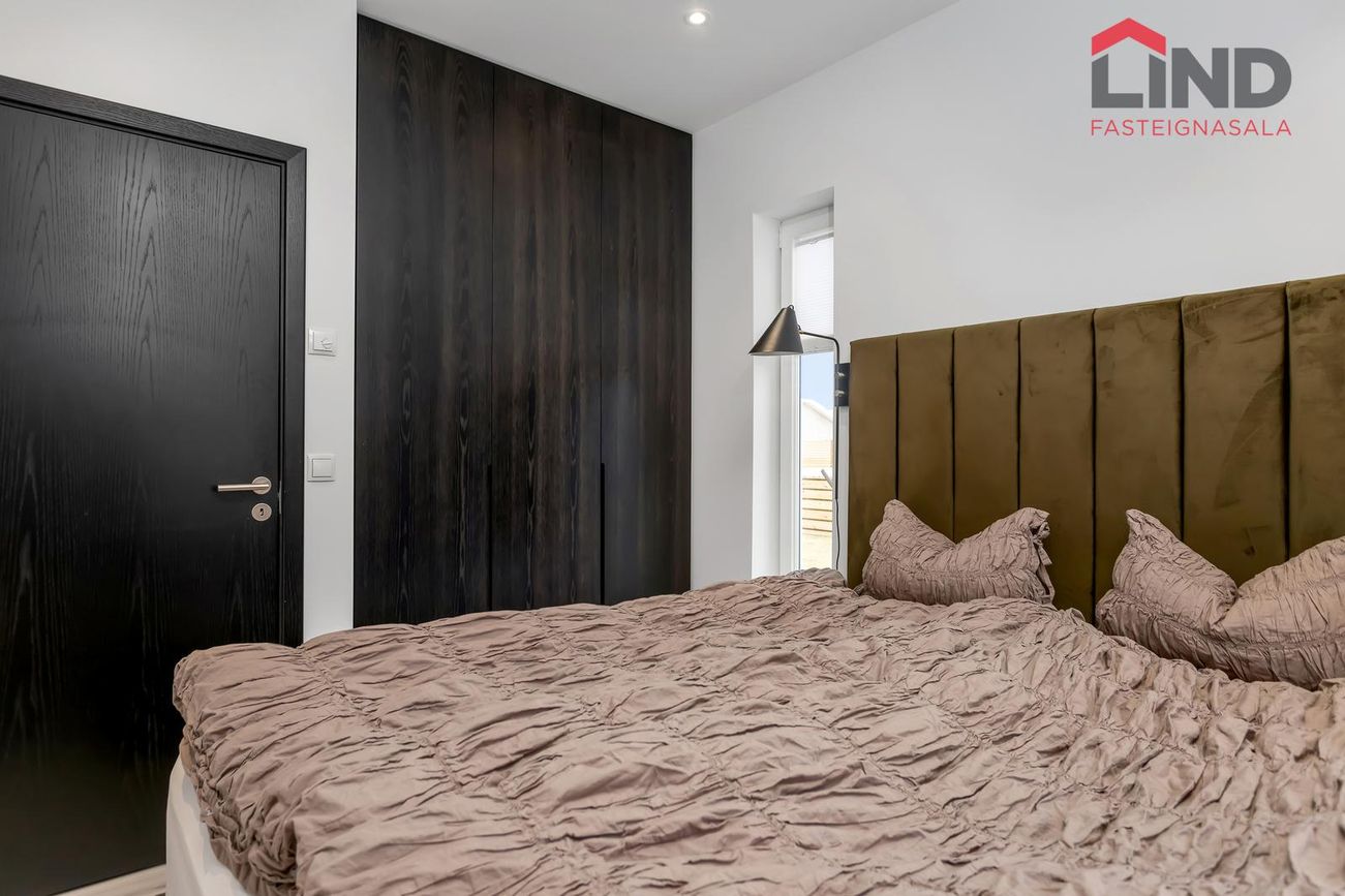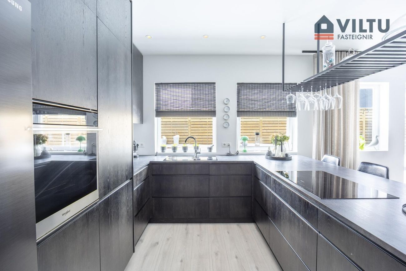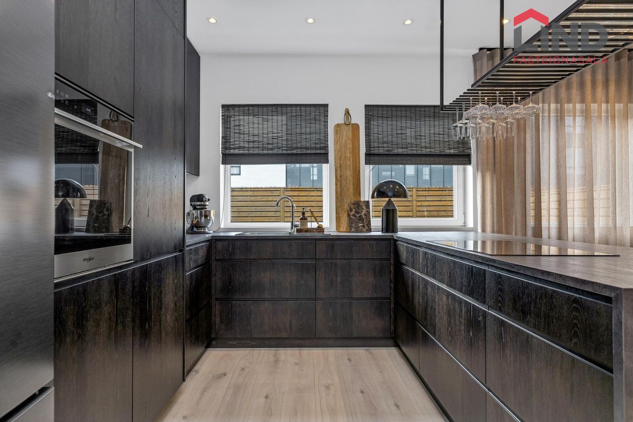 * Allar innréttingar eru sérsmíðaðar, svarbrúnar og ná upp í loft. Engar höldur á skápum og lokast skúffur og skápar með ljúflokun. Útiljós eru með birtunema.