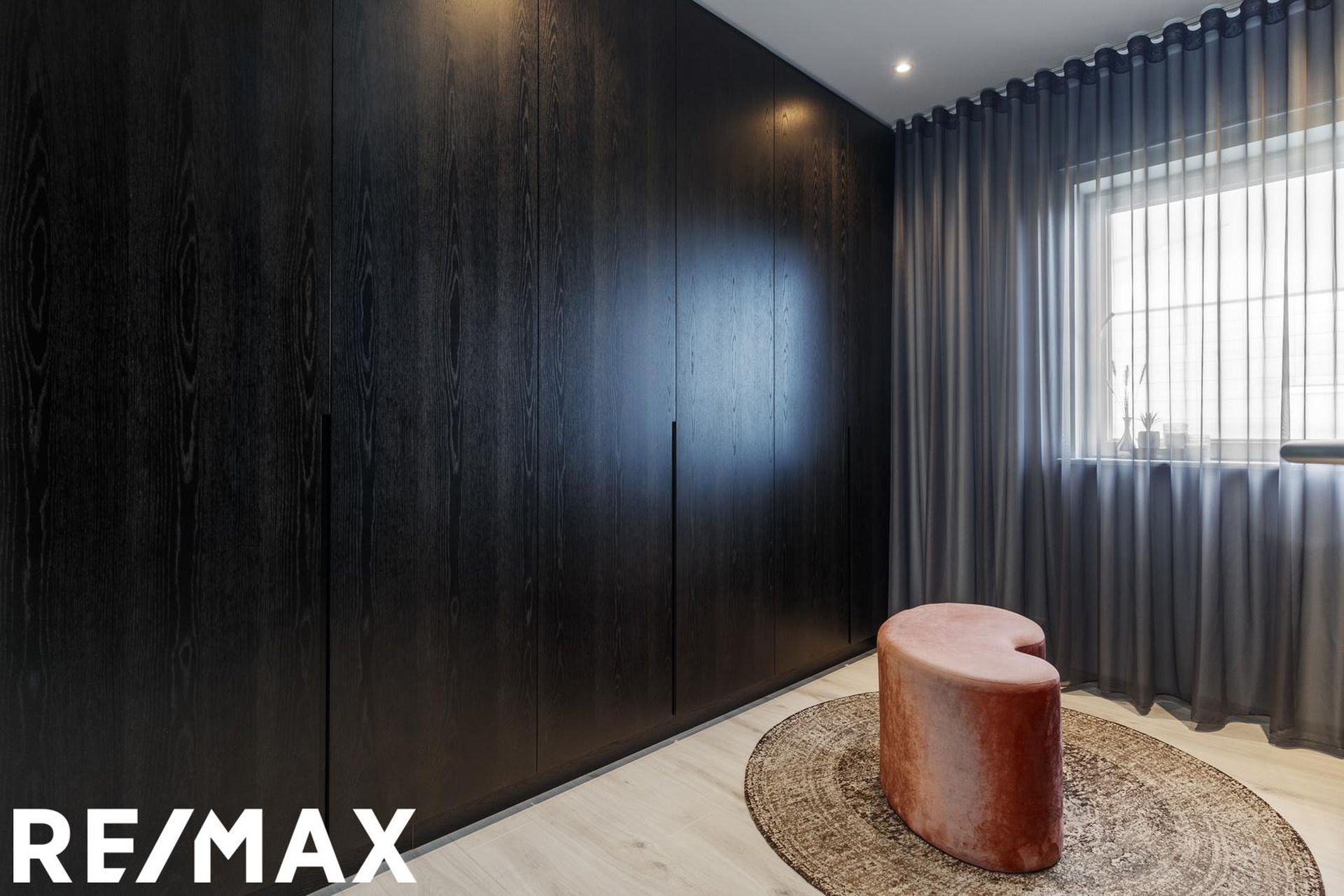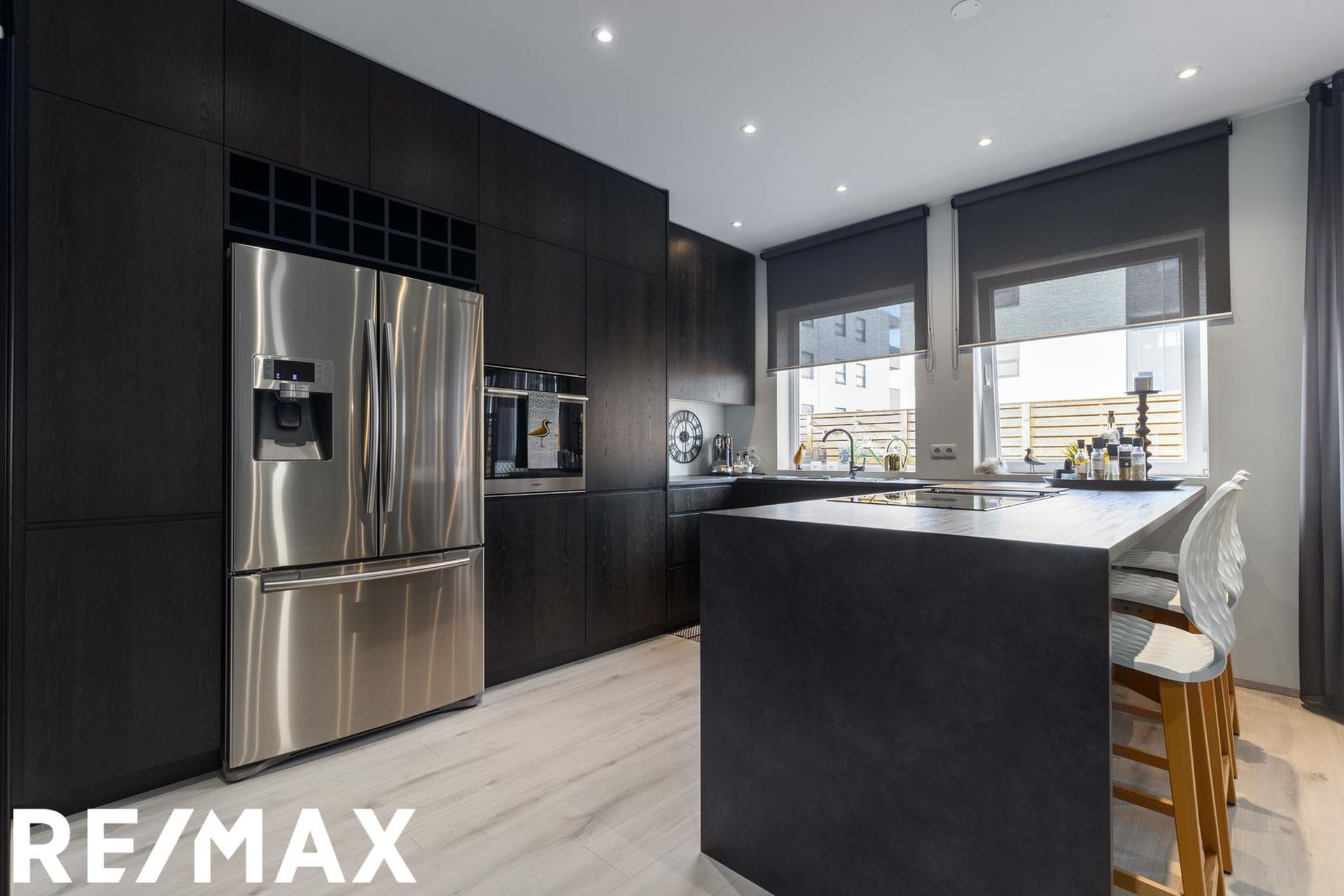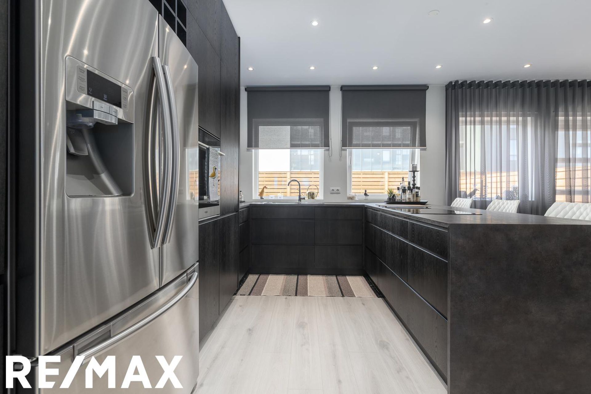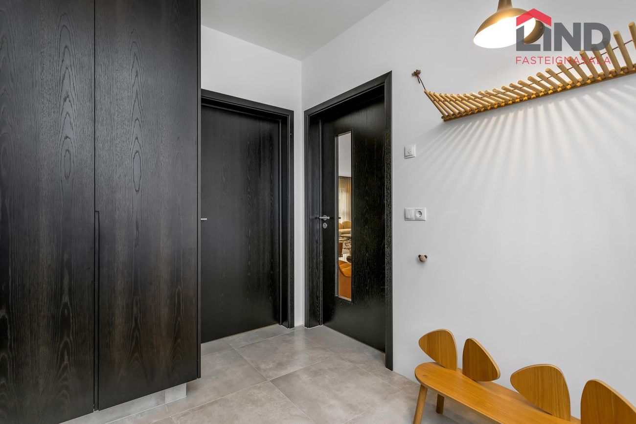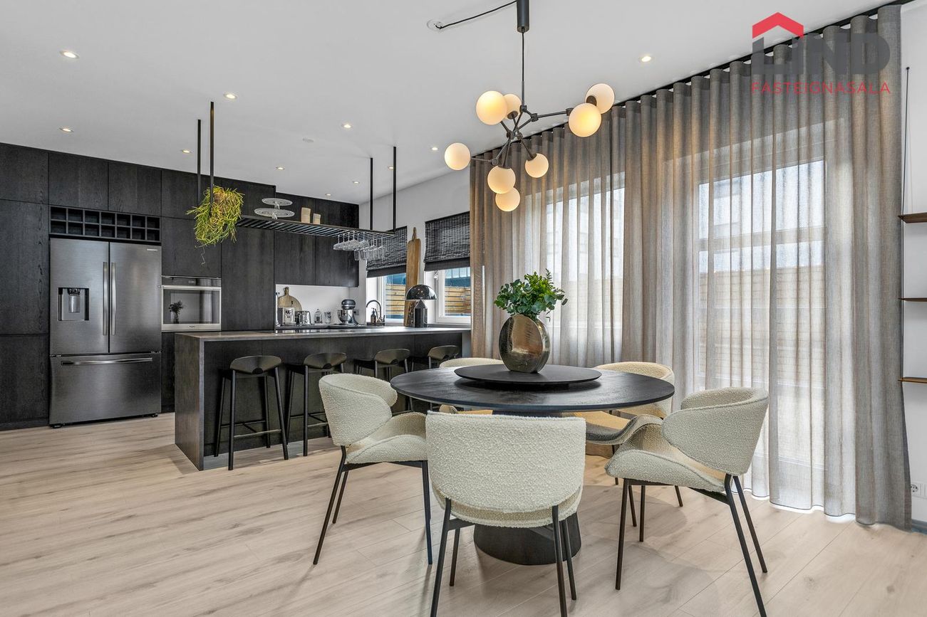 * Allar innréttingar eru sérsmíðaðar, svarbrúnar og ná upp í loft. Engar höldur á skápum og lokast skúffur og skápar með ljúflokun. Útiljós eru með birtunema.