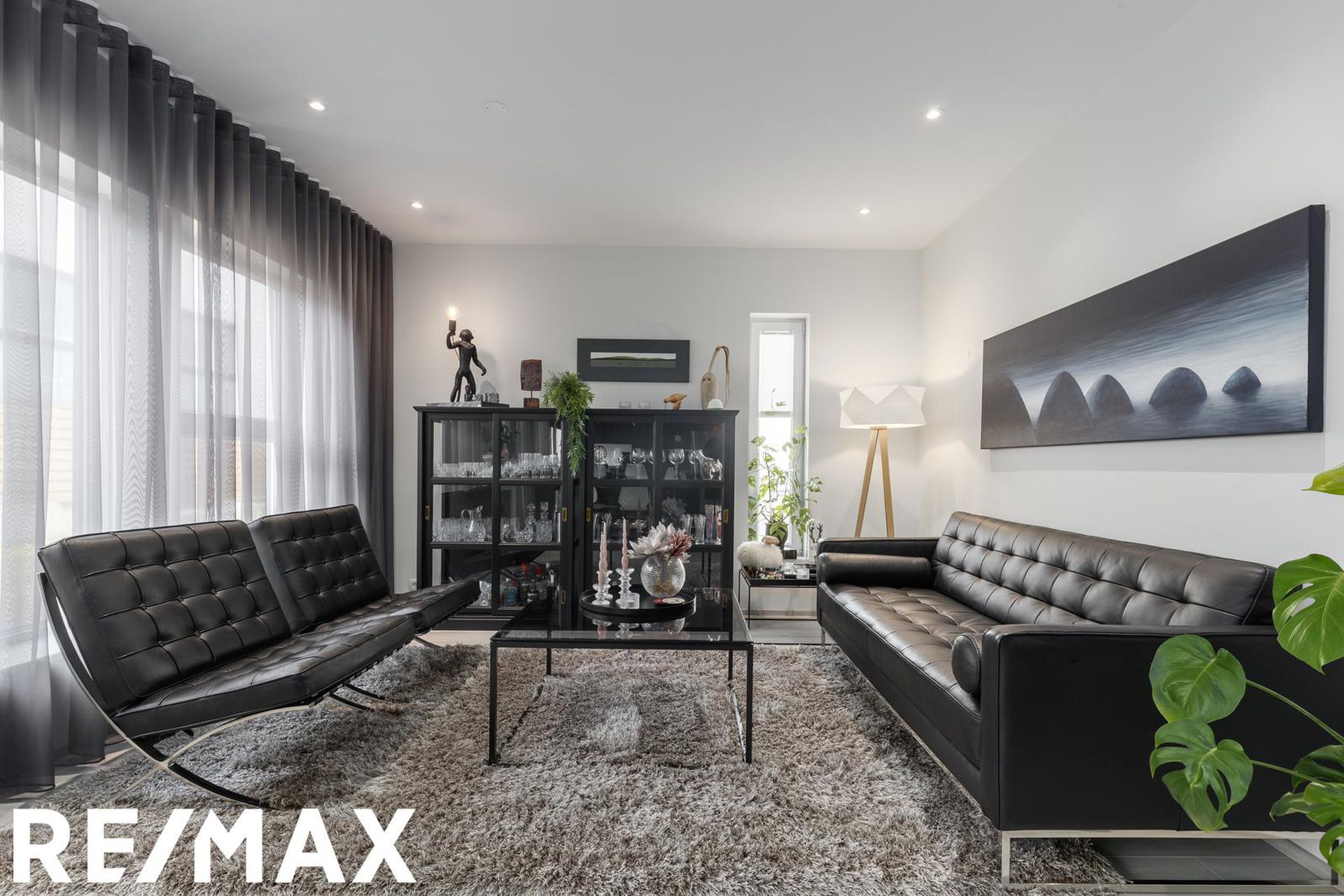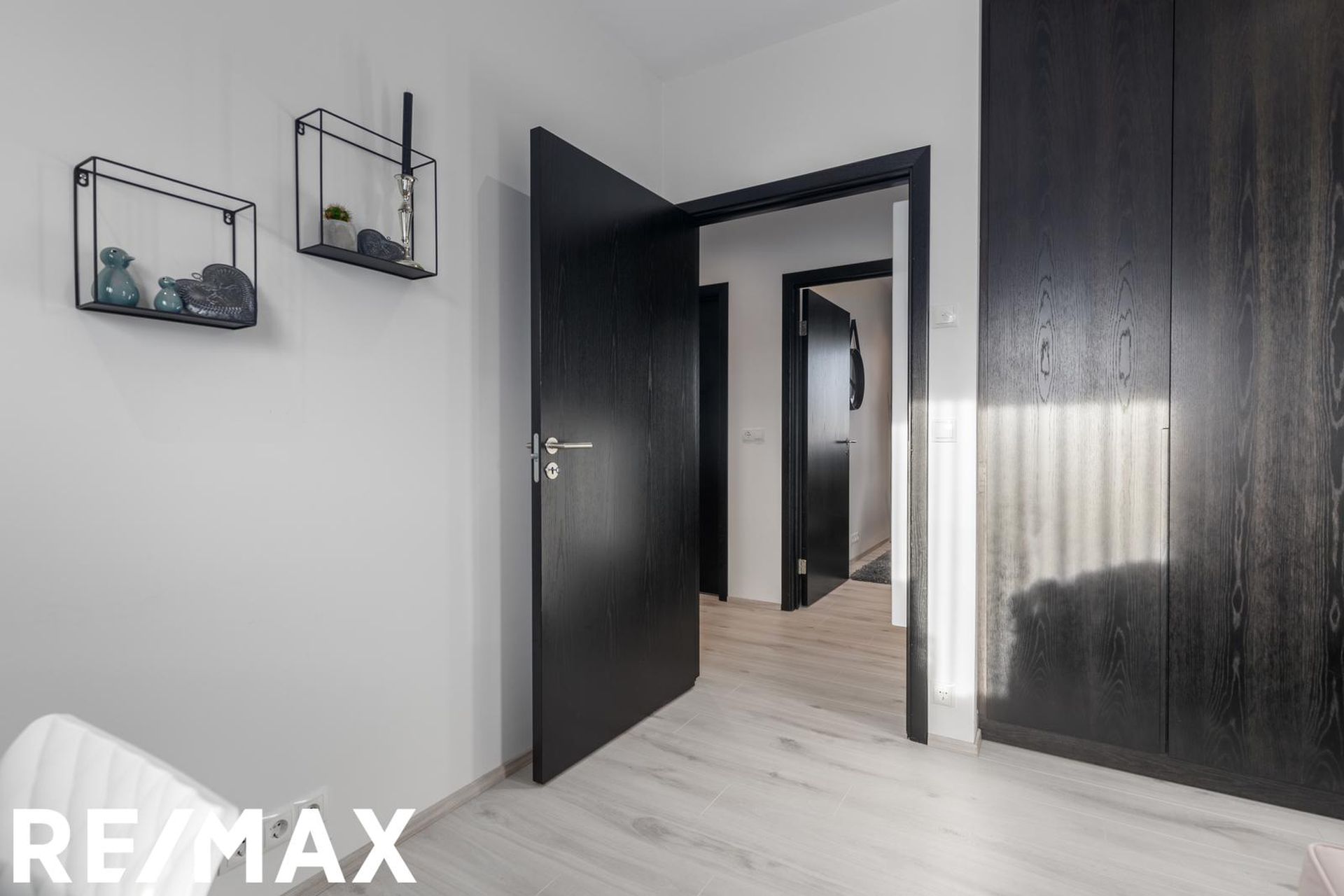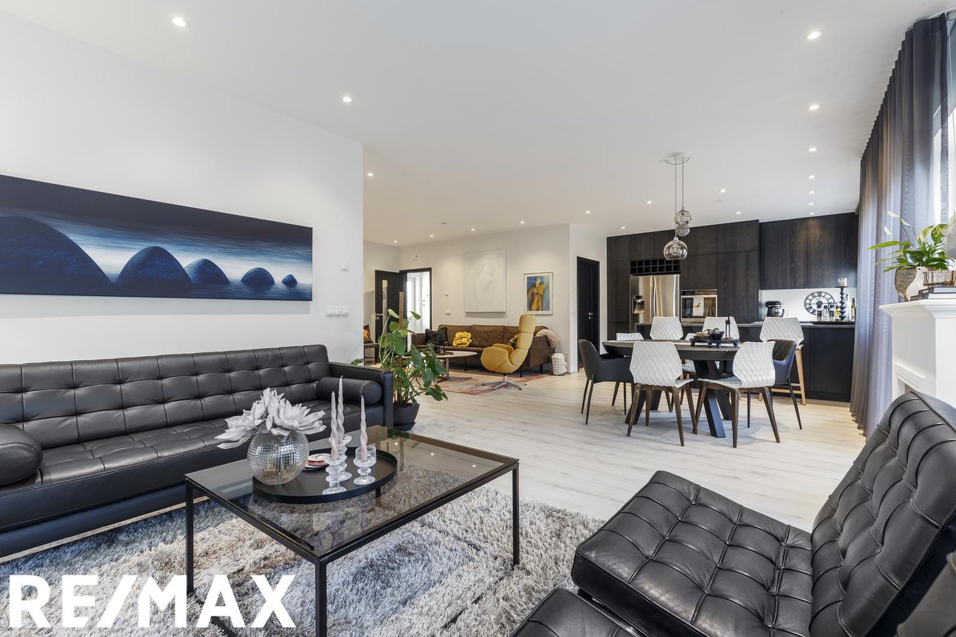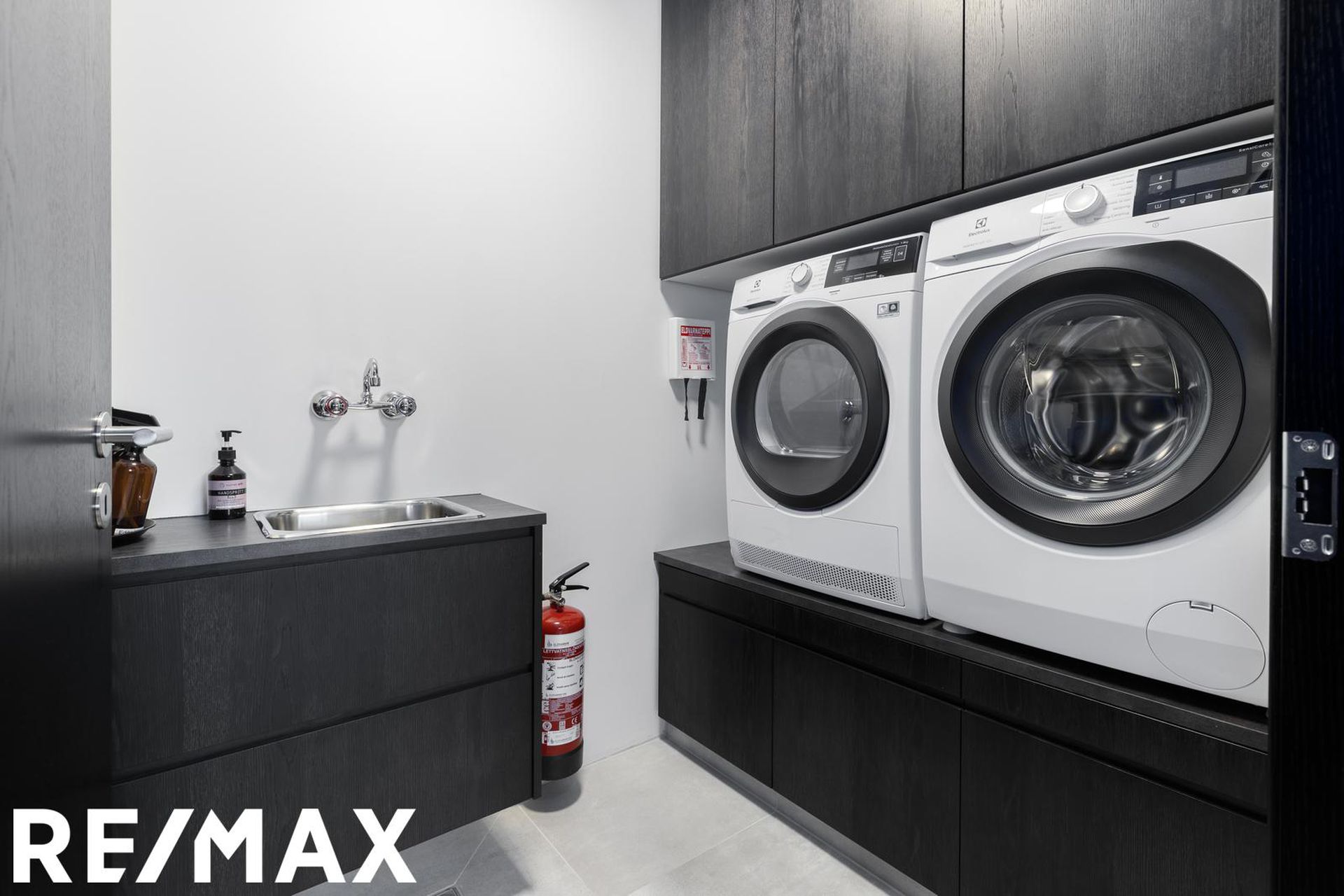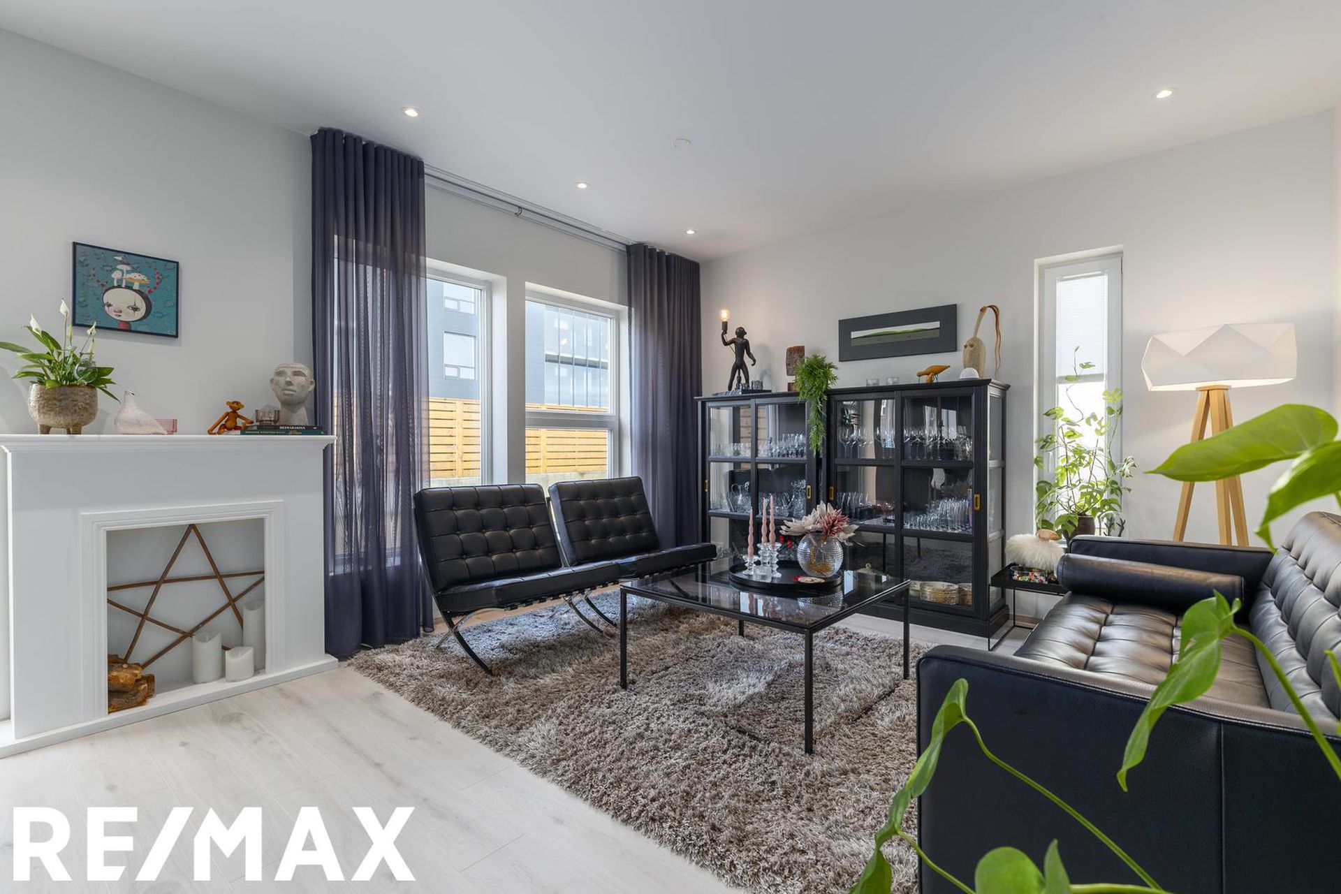 * Allar innréttingar eru sérsmíðaðar, svarbrúnar og ná upp í loft. Engar höldur á skápum og lokast skúffur og skápar með ljúflokun. Útiljós eru með birtunema.