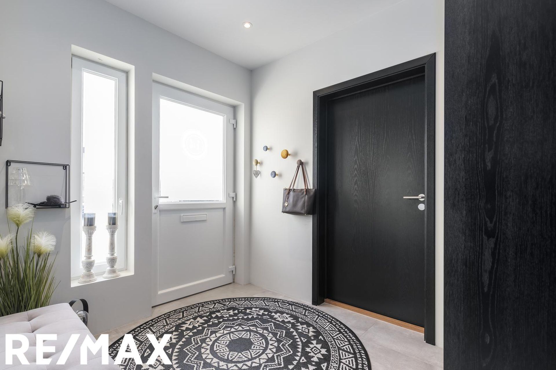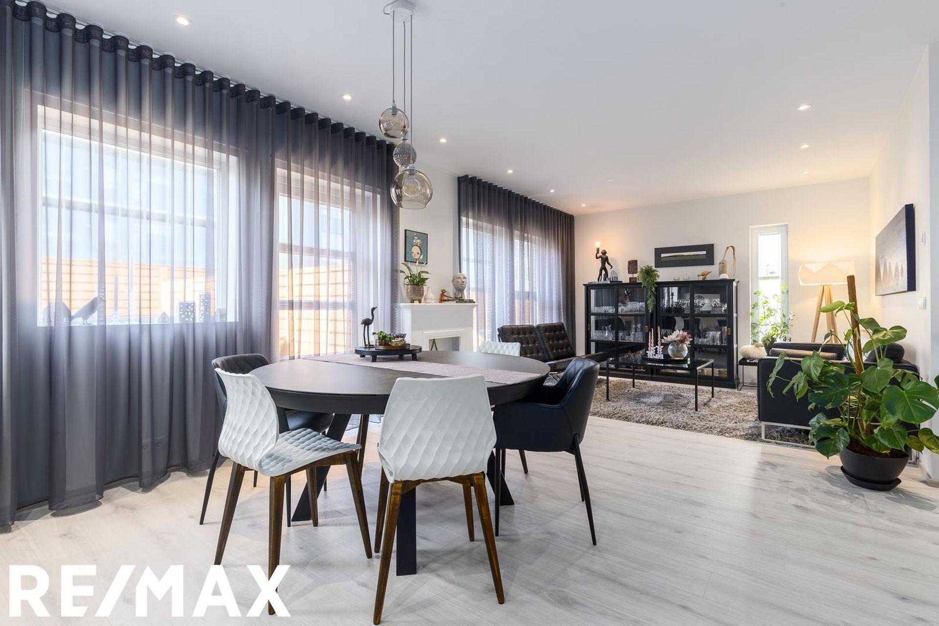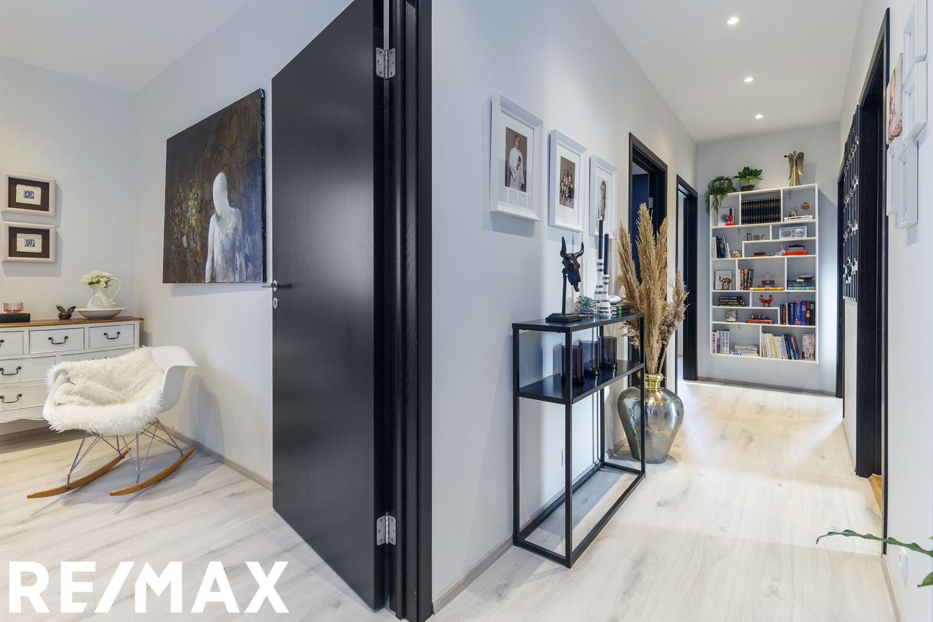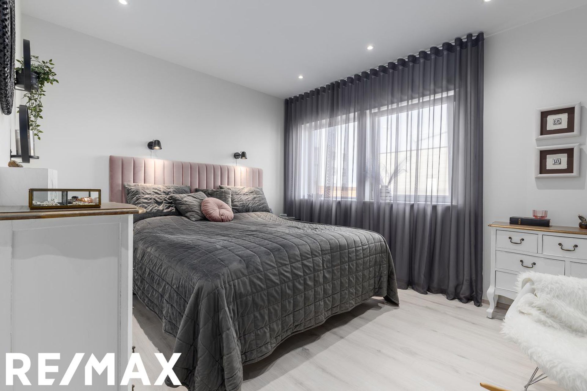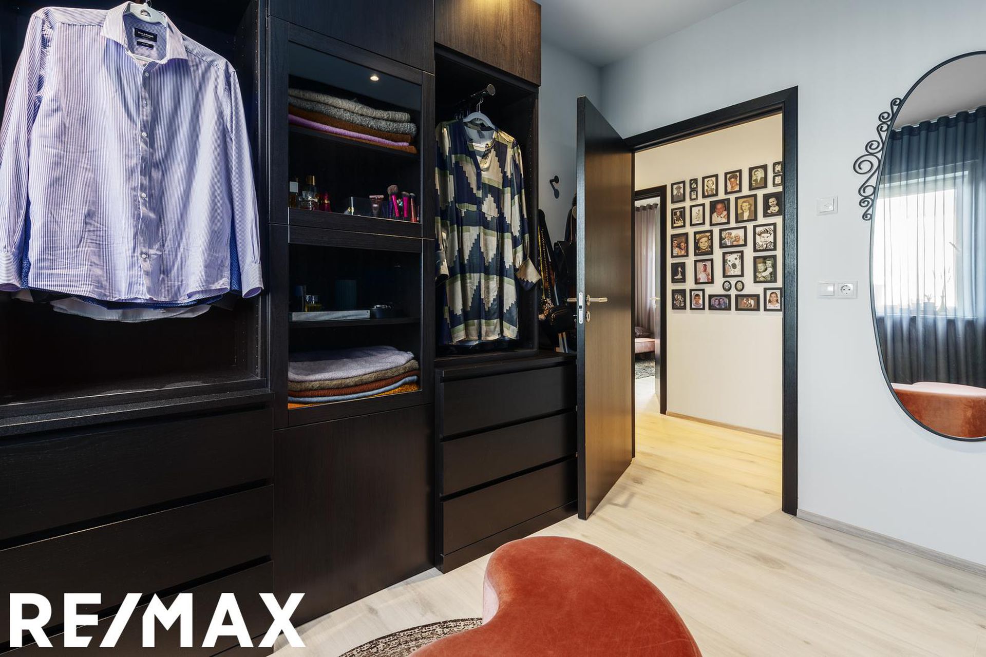 * Allar innréttingar eru sérsmíðaðar, svarbrúnar og ná upp í loft. Engar höldur á skápum og lokast skúffur og skápar með ljúflokun. Útiljós eru með birtunema.