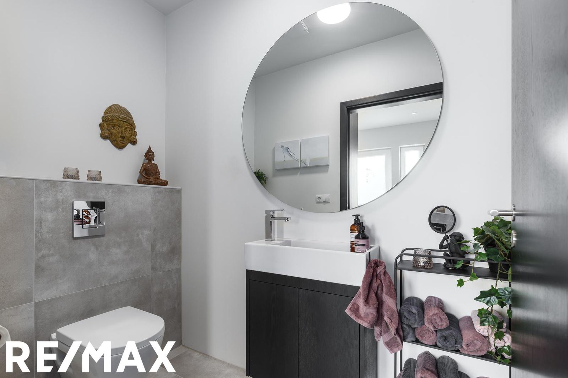 Gestasalerni er með eins gólfflísum og forstofa og ná flísar upp á salerniskassa. Upphengt salerni og skápur undir handlaug.