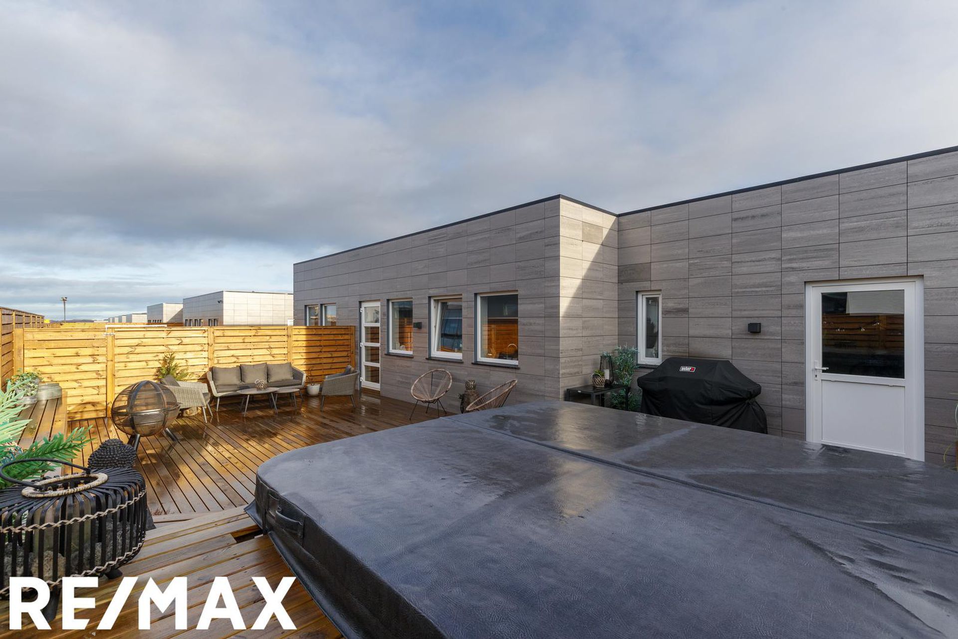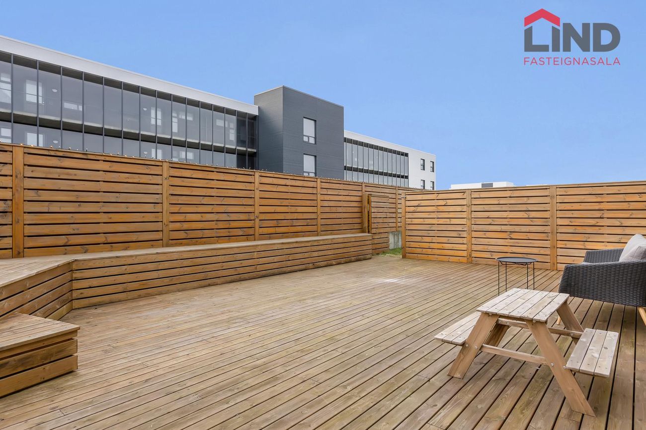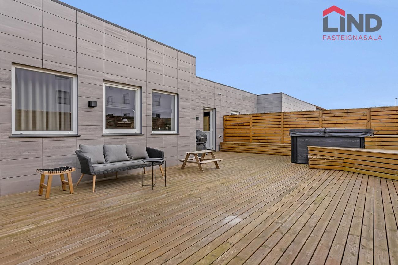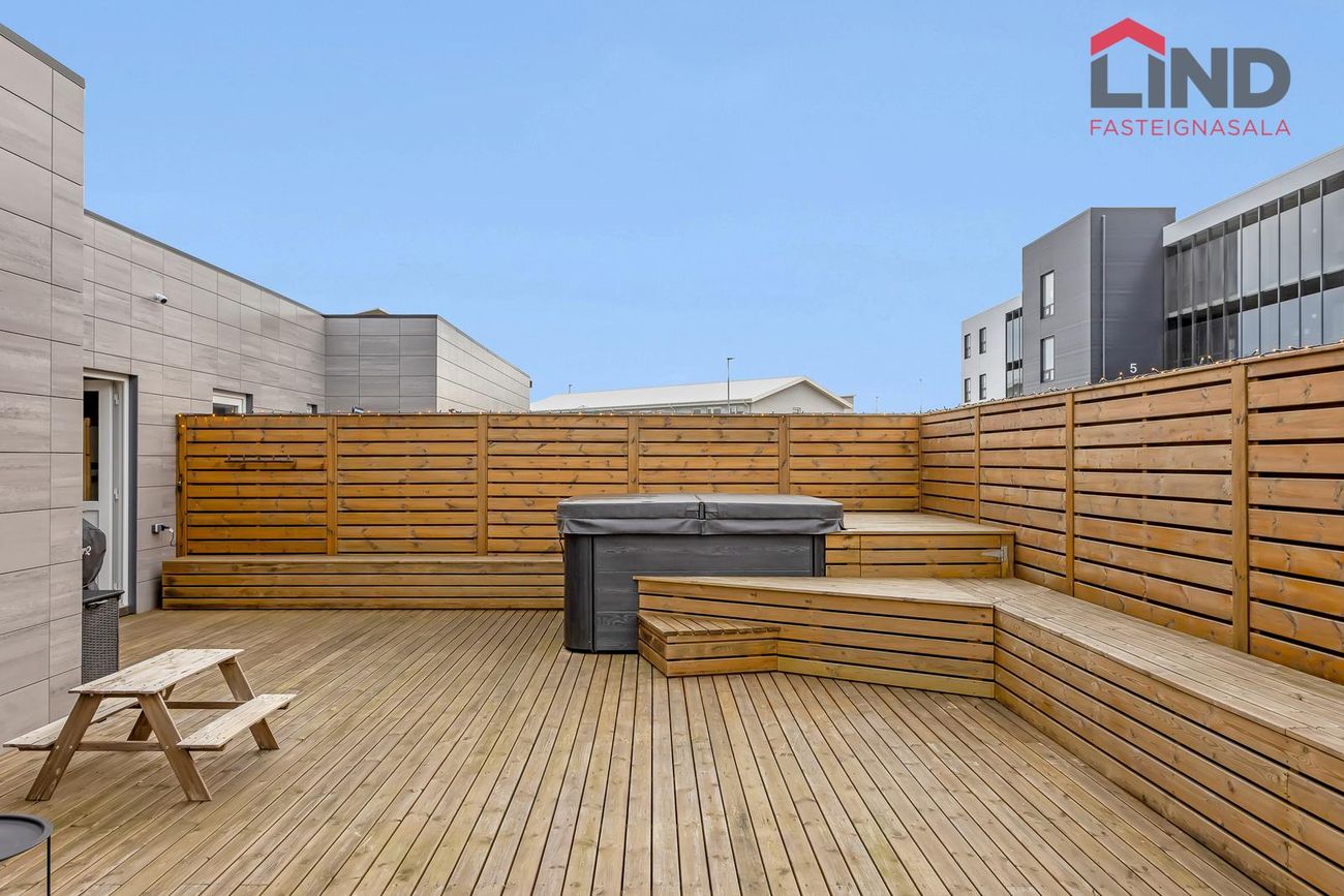 Viðar verönd er með heitum potti. Hitastýring er í bílskúr með rafmagns kúluloka. Í hluta af timburvirki við pottinn eru geymslurými.