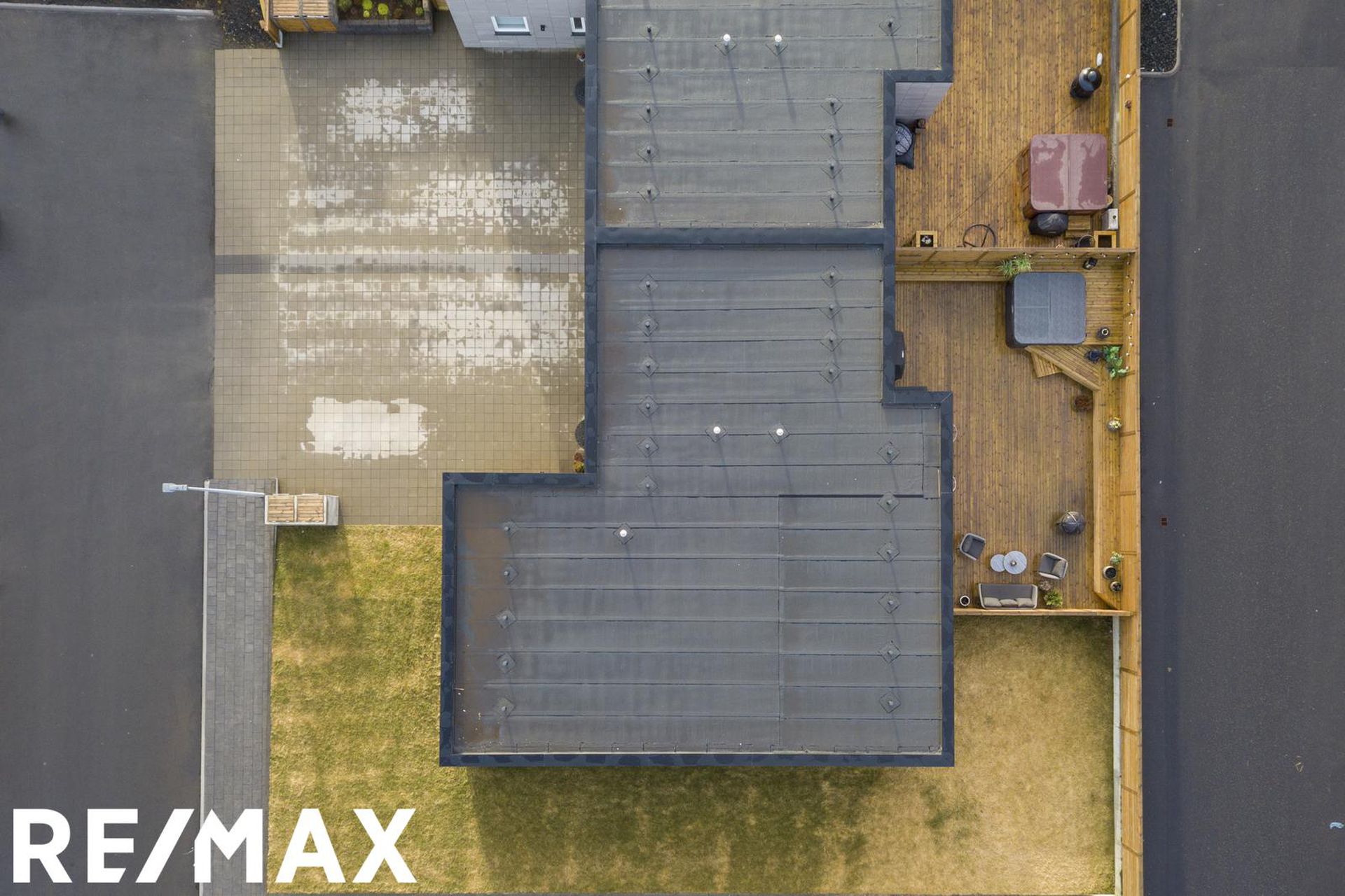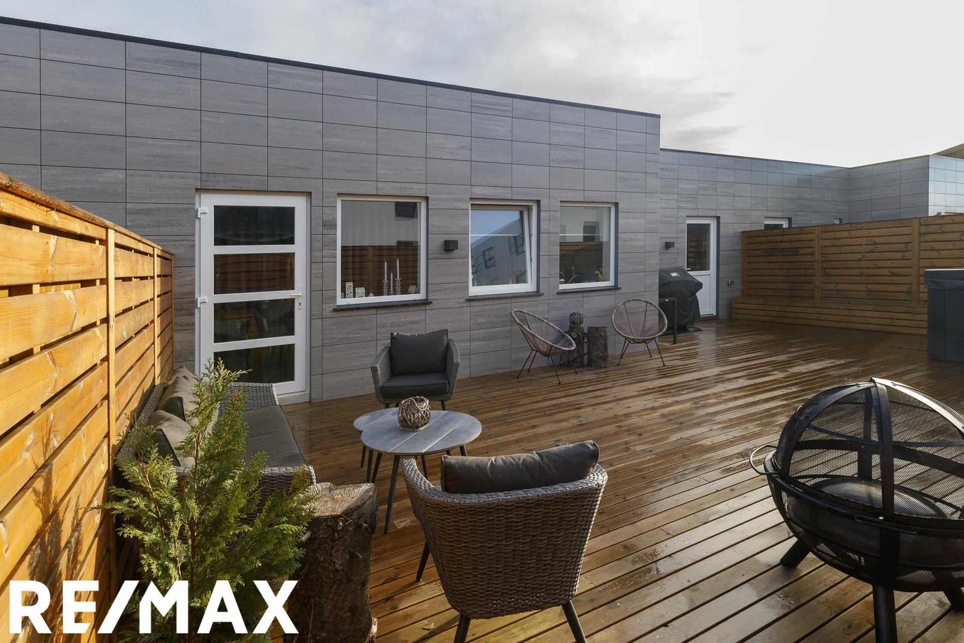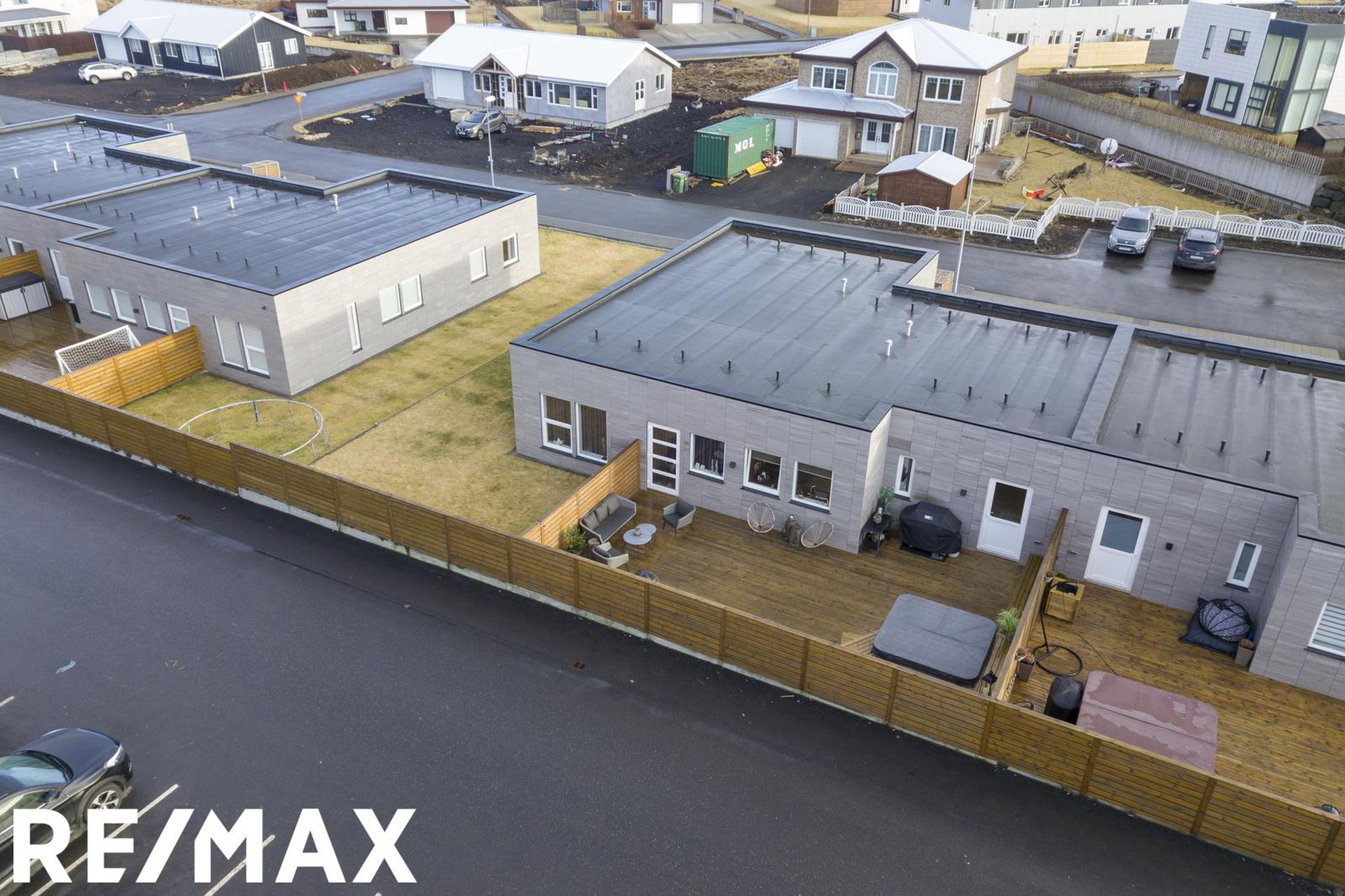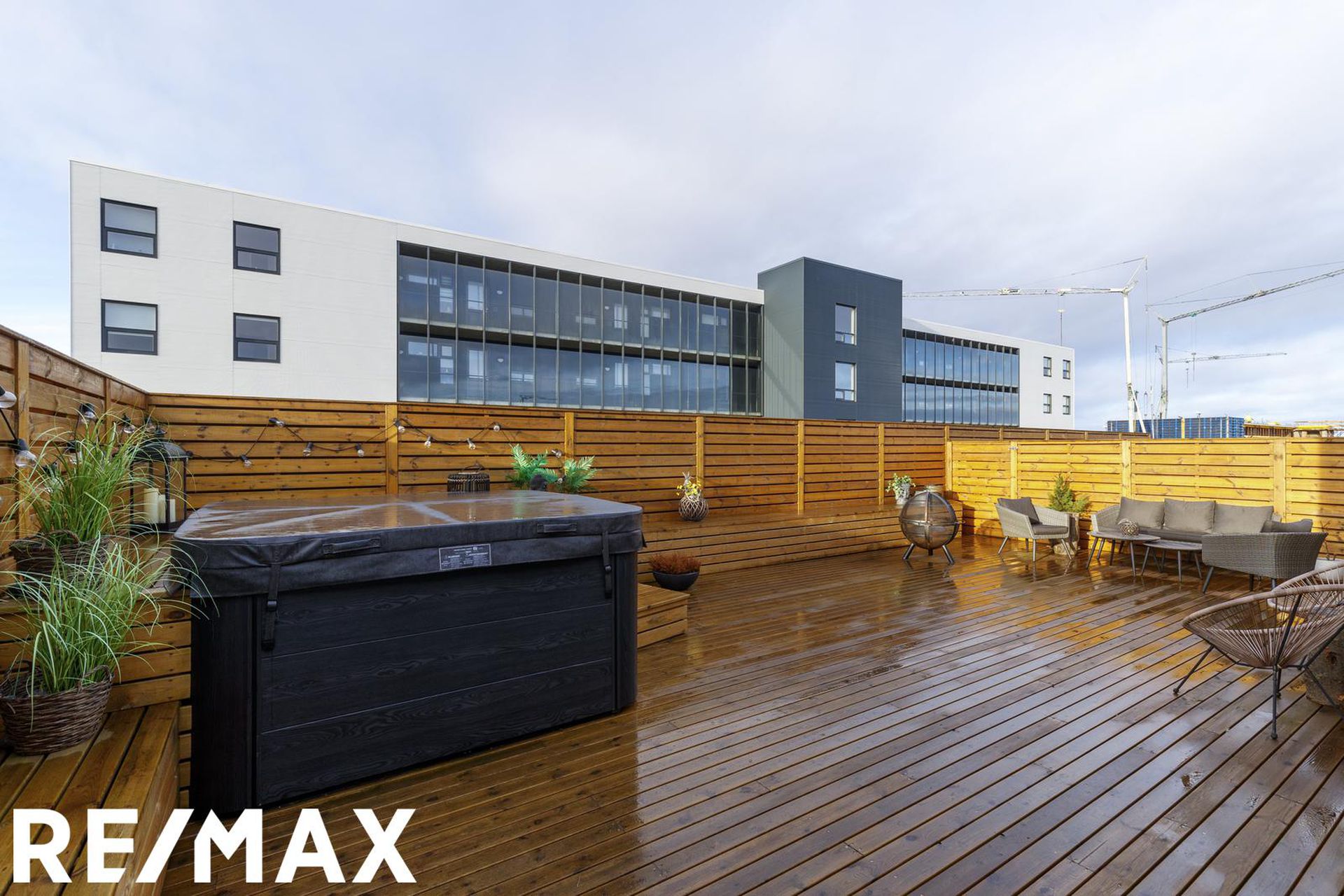 Viðar verönd er með heitum potti. Hitastýring er í bílskúr með rafmagns kúluloka. Í hluta af timburvirki við pottinn eru geymslurými.