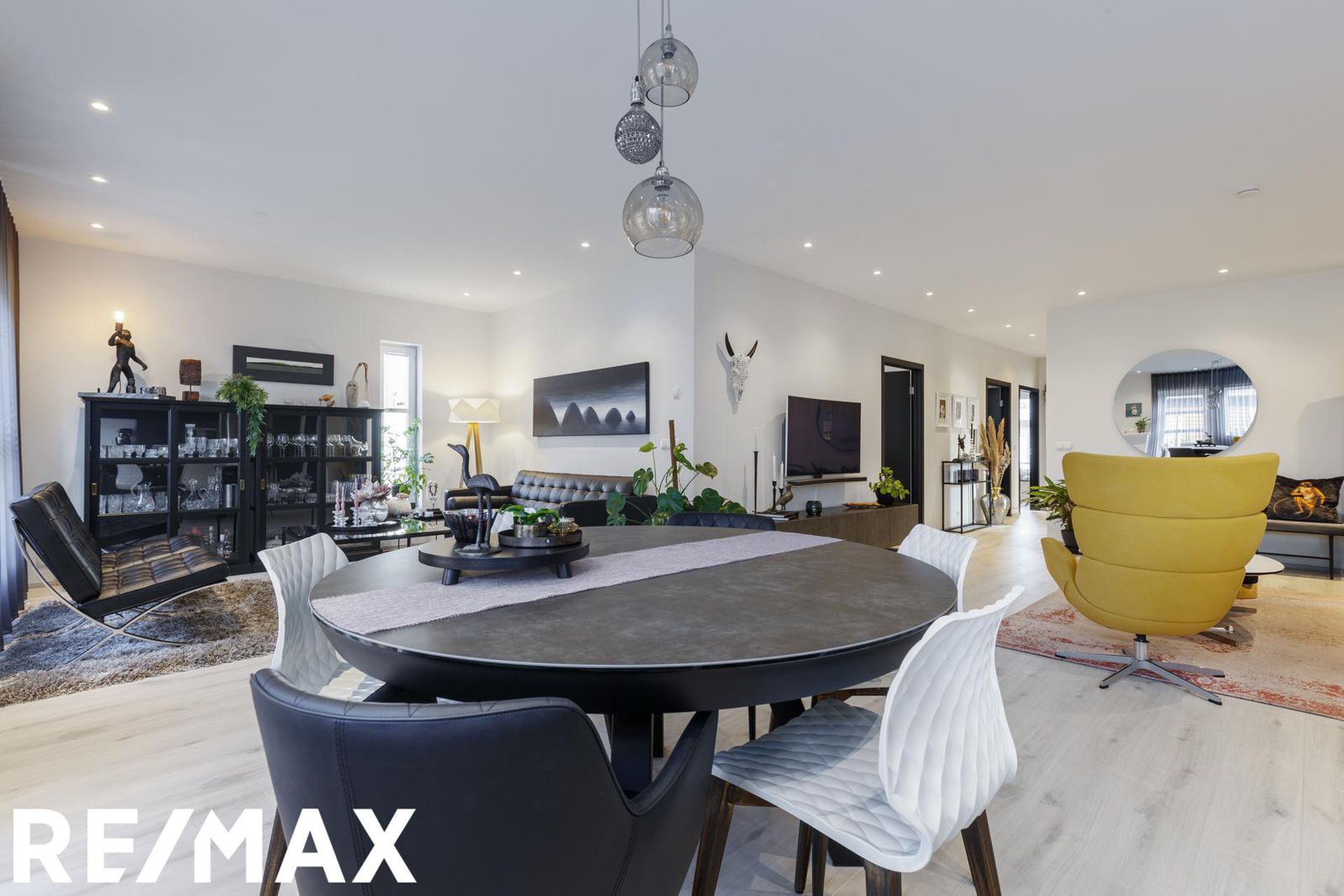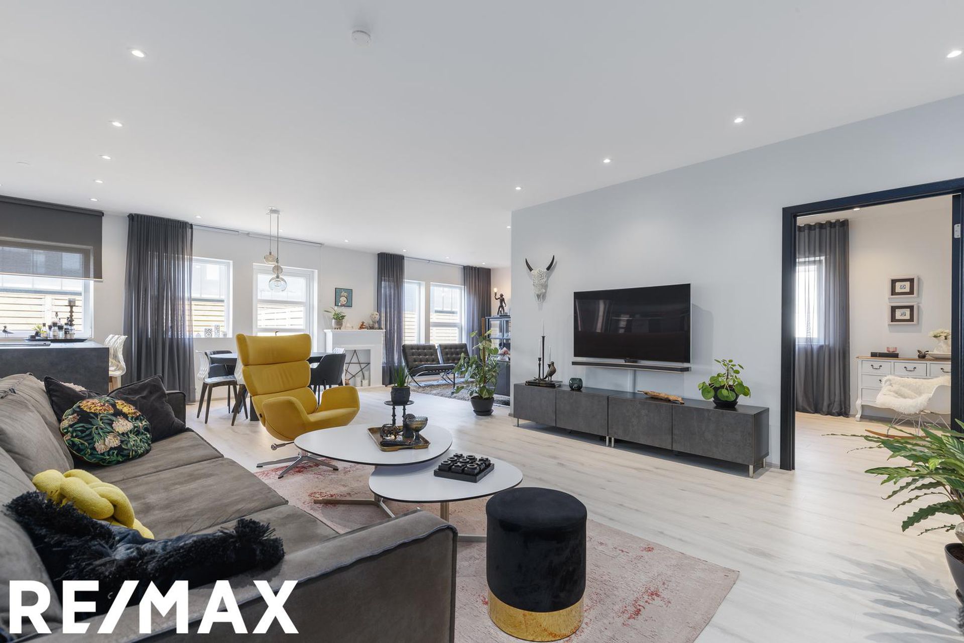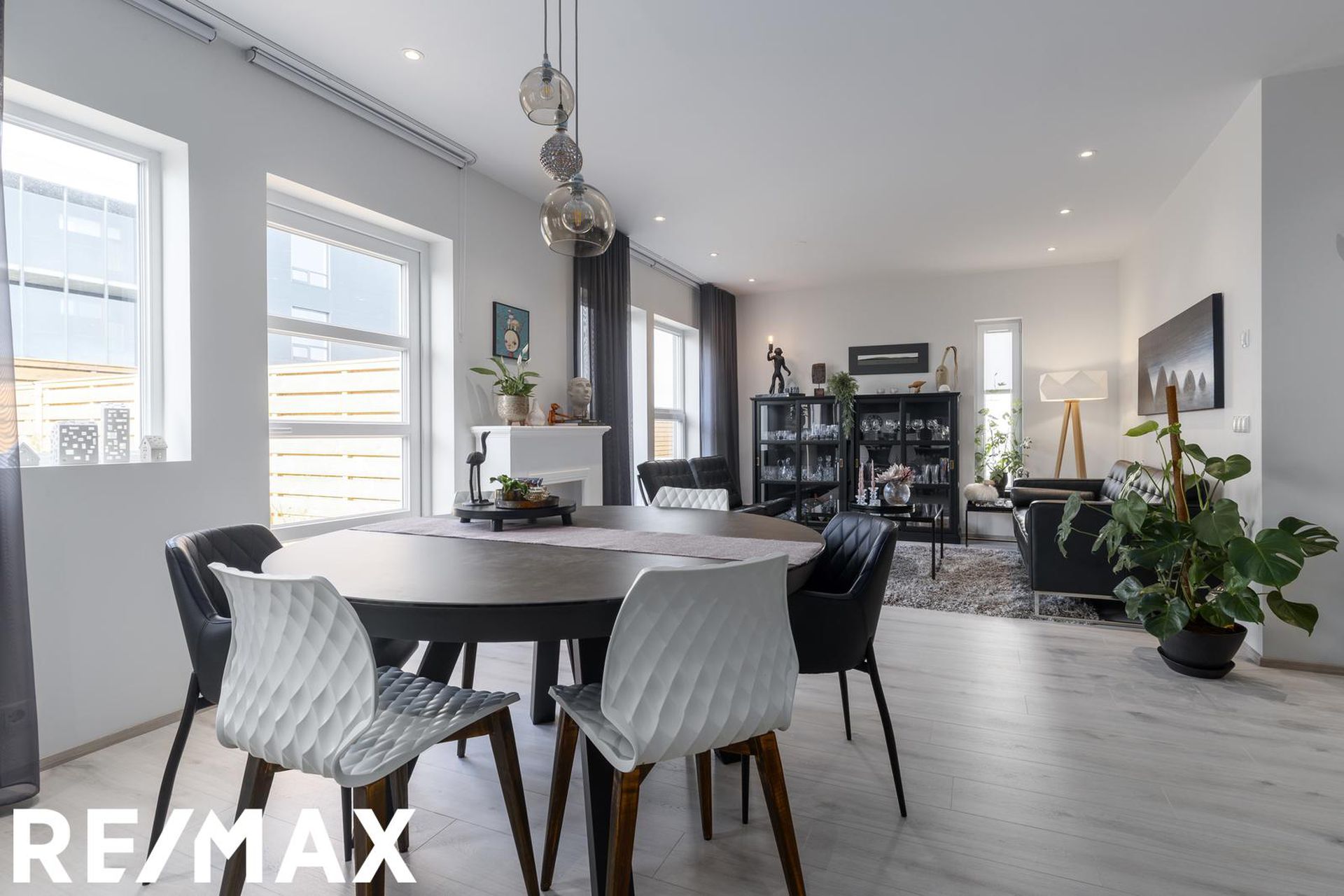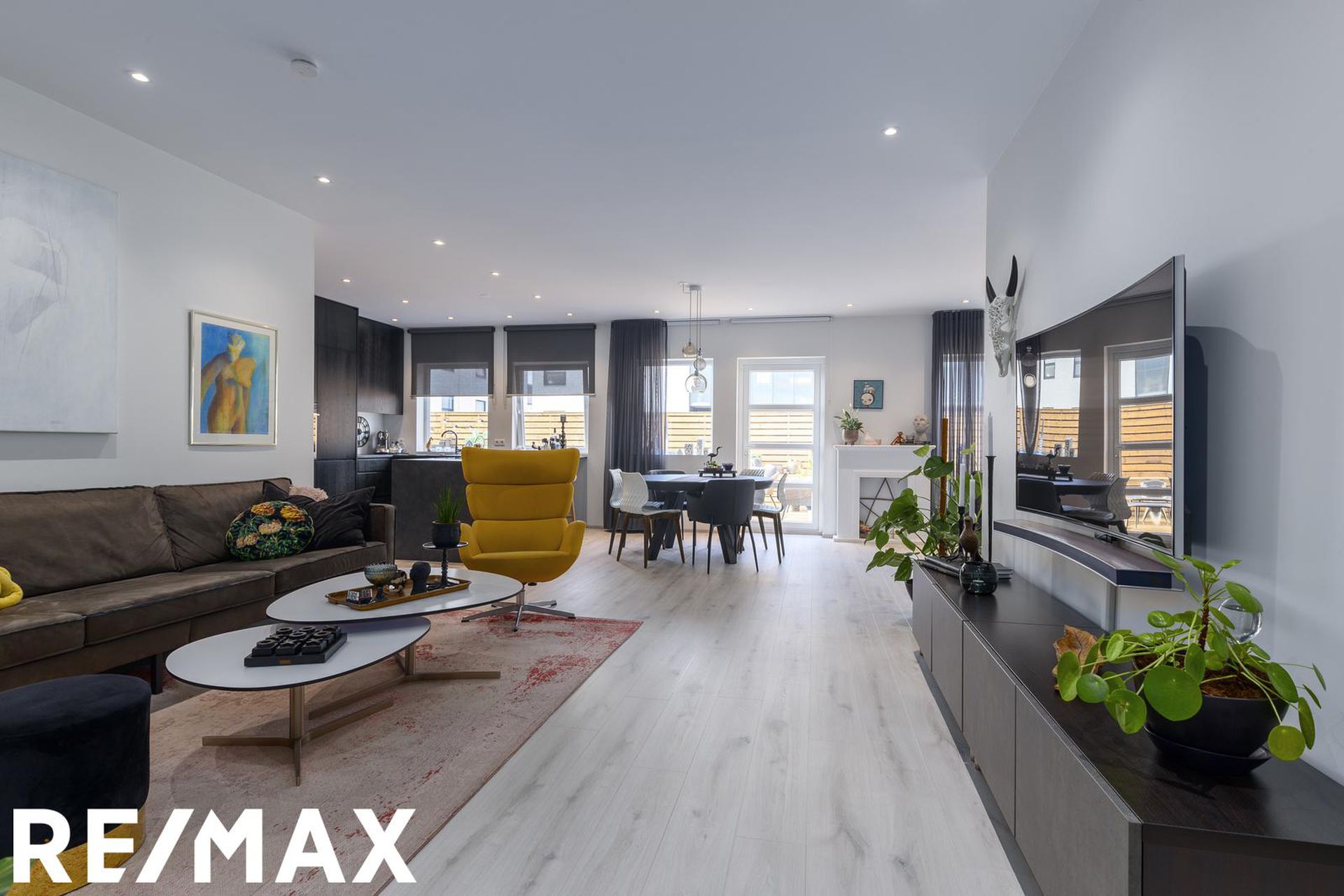 Stofa og borðstofa ásamt sjónvarpsrými er í skemmtilega opnu rými með eldhúsi. Útgengi er út á viðarverönd frá stofu.