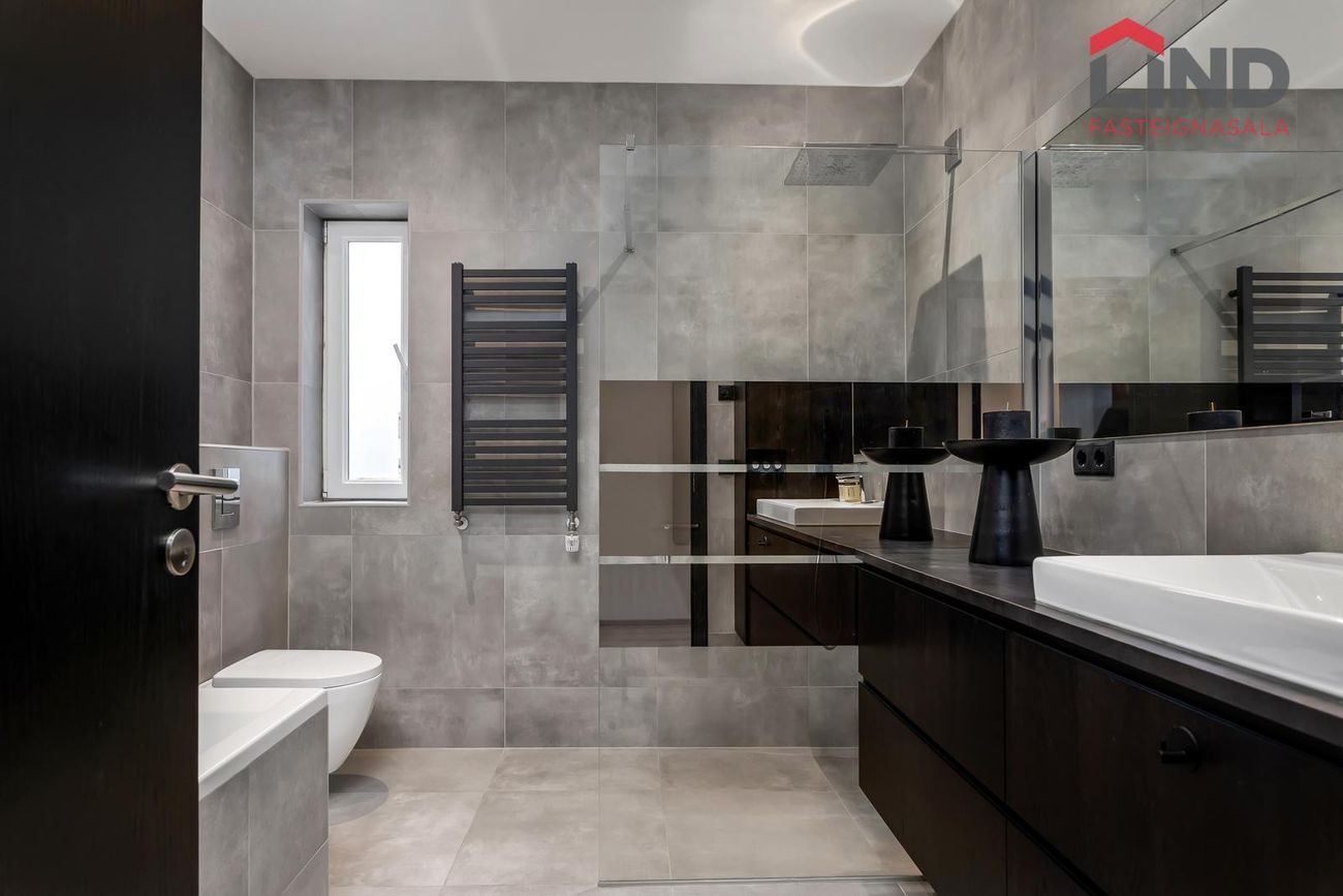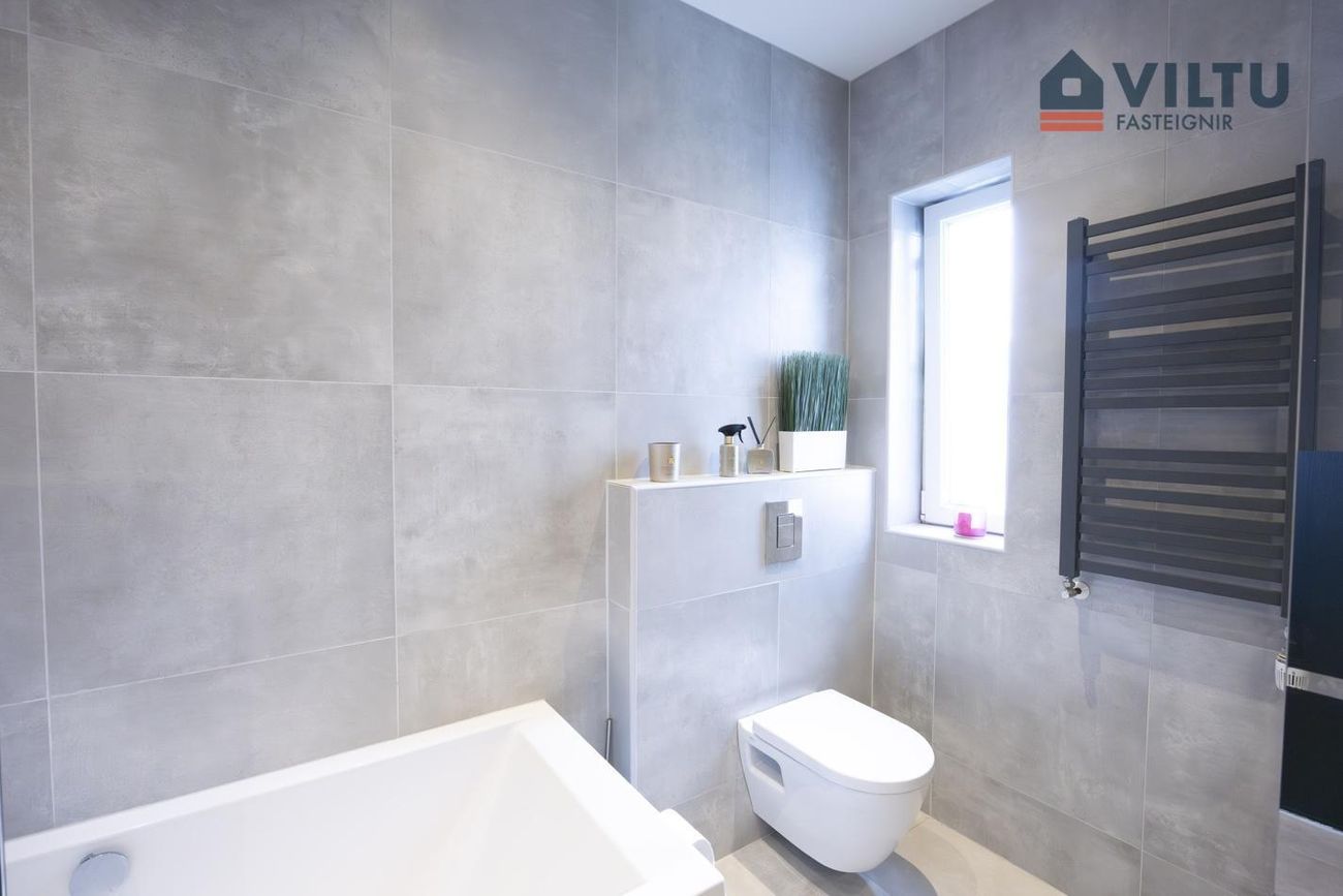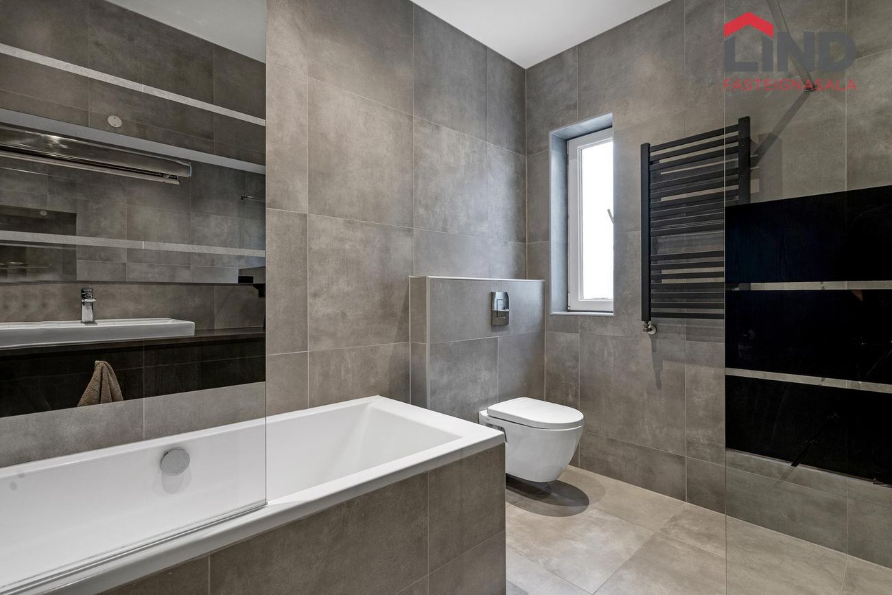 Baðherbergi er flísalagt í hólf og gólf með ljósum flísum. Sturta með gleri, baðkar, upphengt salerni, svartur handklæðaofn og innrétting við handlaug.