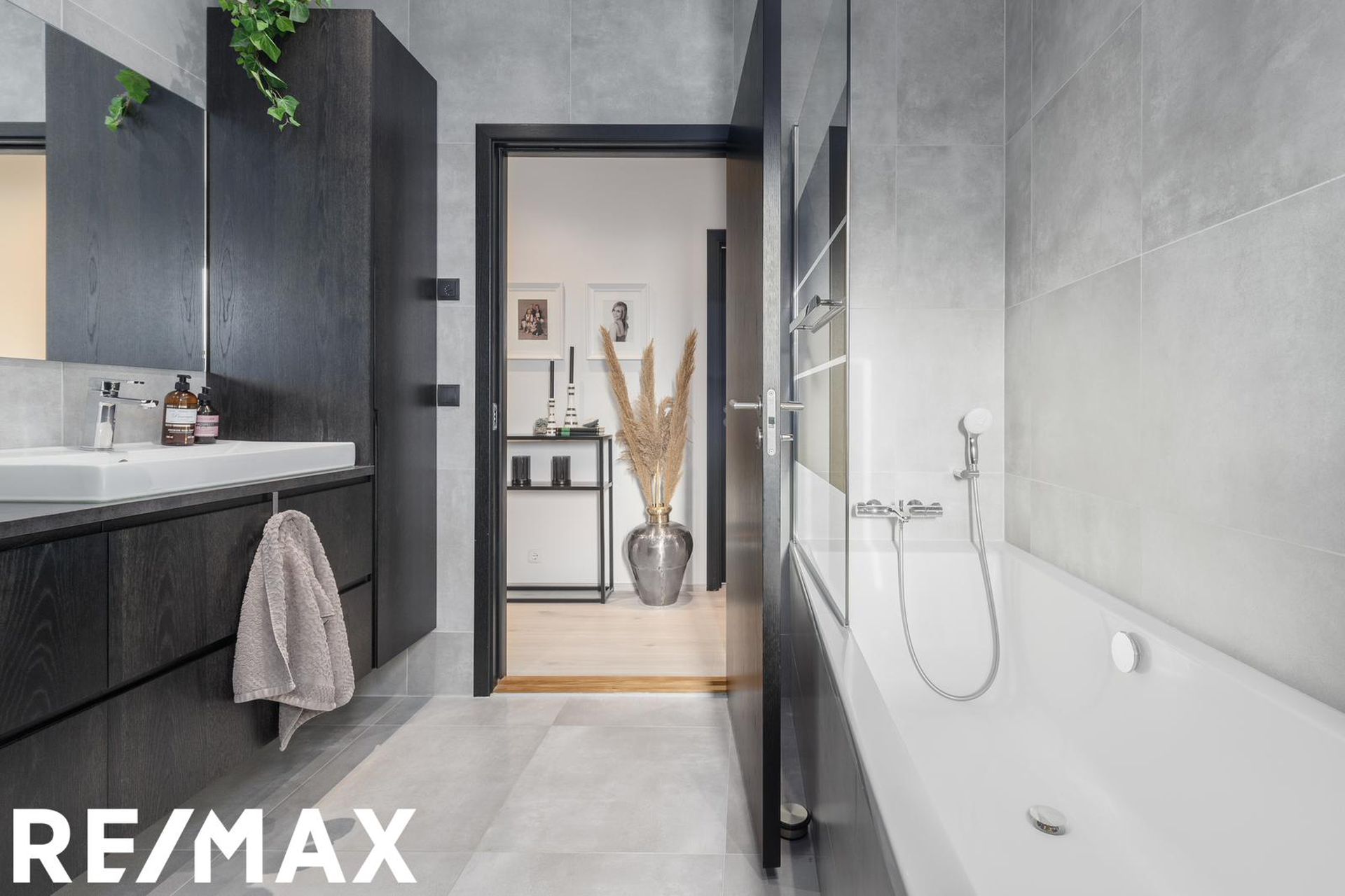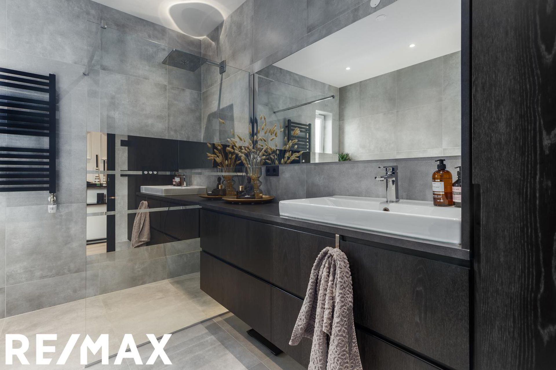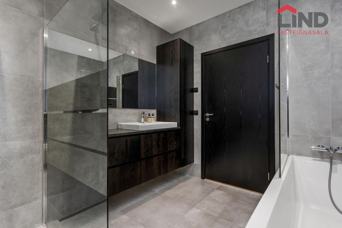 Baðherbergi er flísalagt í hólf og gólf með ljósum flísum. Sturta með gleri, baðkar, upphengt salerni, svartur handklæðaofn og innrétting við handlaug.