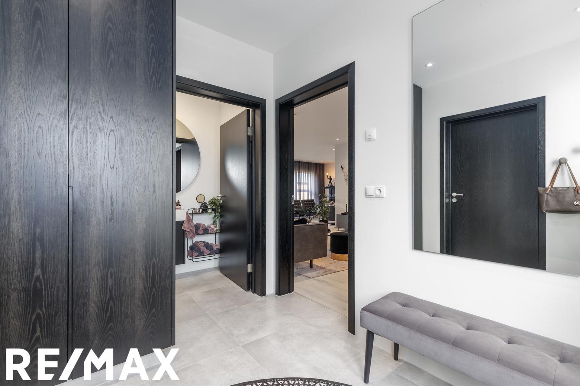 Forstofa er með ljósum gólfflísum og dökkum viðarfataskáp sem nær upp í loft. Inn af forstofu er gengið inn í bílskúr, gestasalerni og inn í alrými íbúðar.