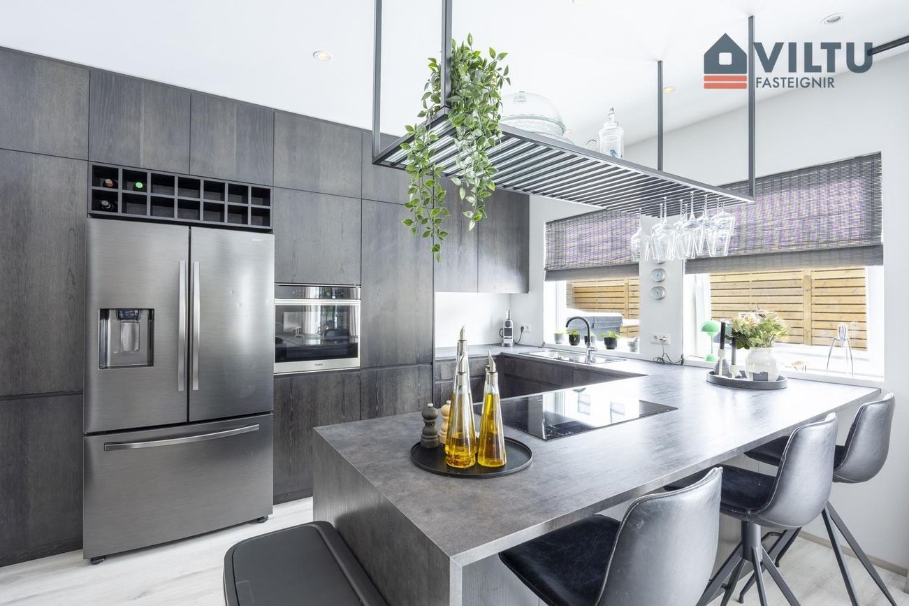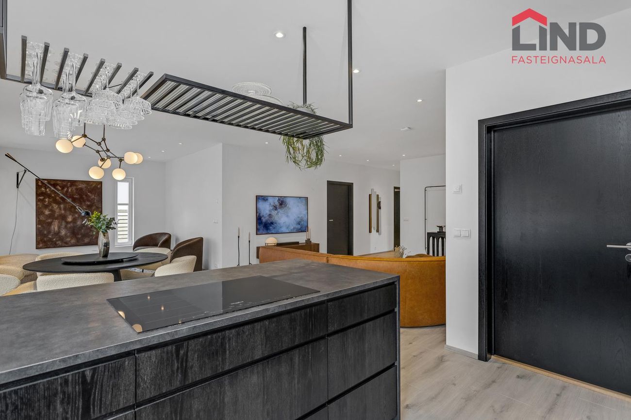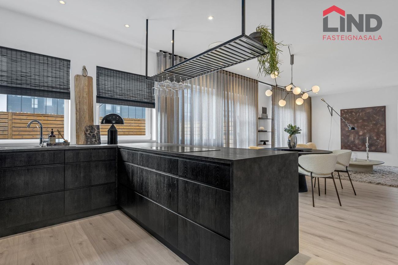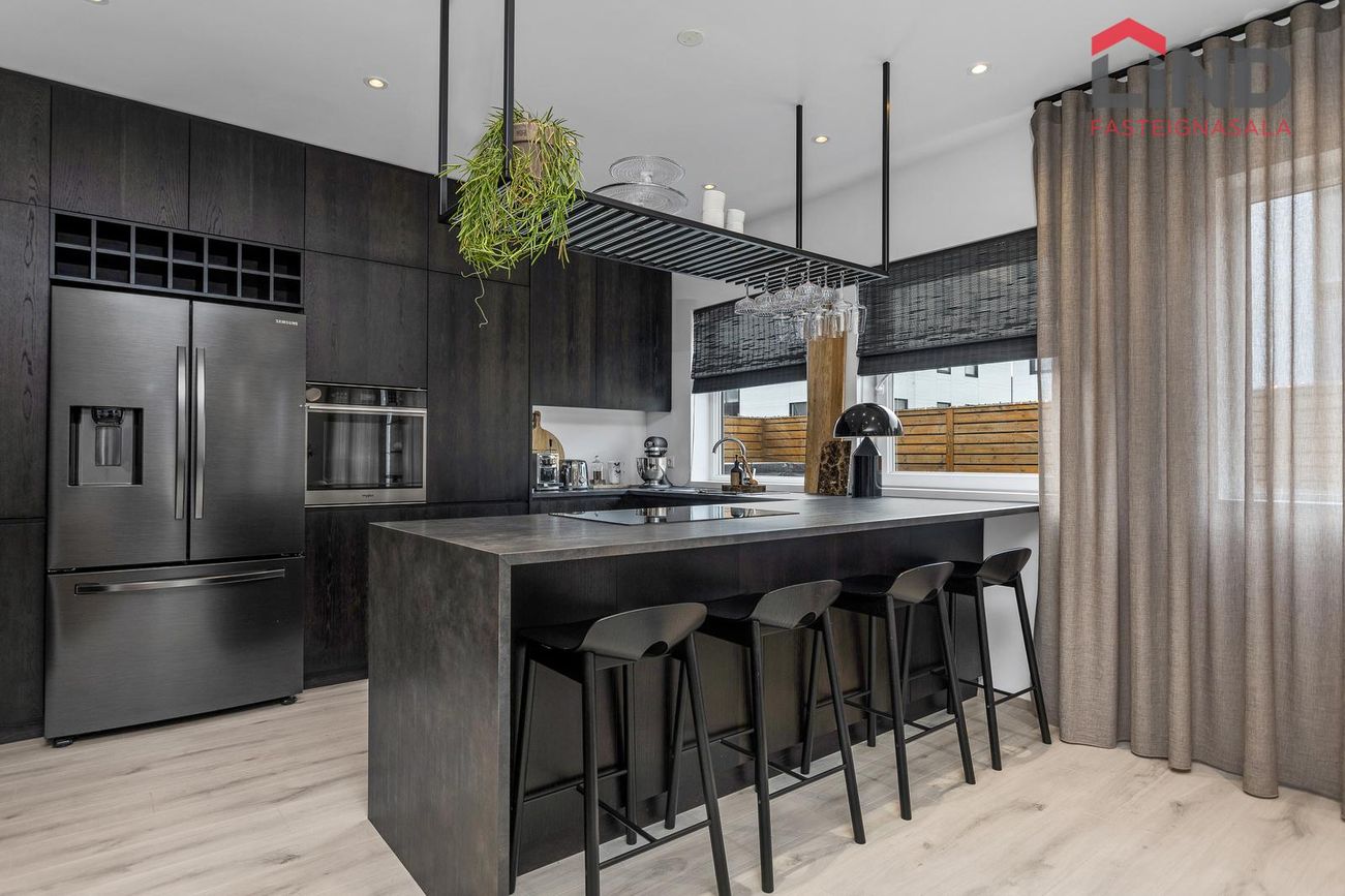 Eldhús er opið inn í stofu og skilur eyja á milli. Við eyju er hægt að koma fyrir fjórum háum stólum. Whirlpool spanhelluborð á eyju. í innréttingu er innfelld Whirlpool uppþvottavél, sjálfhreinsandi bakaraofn og vínrekki ofan við ísskáp. Útdraganlegar skúffur og gott aðgengi. Steingráar borðplötur.