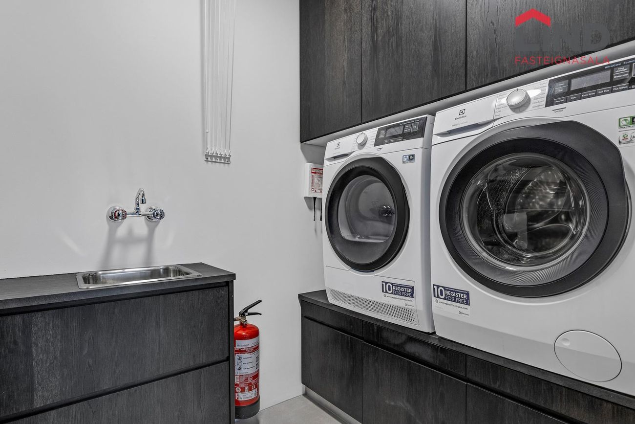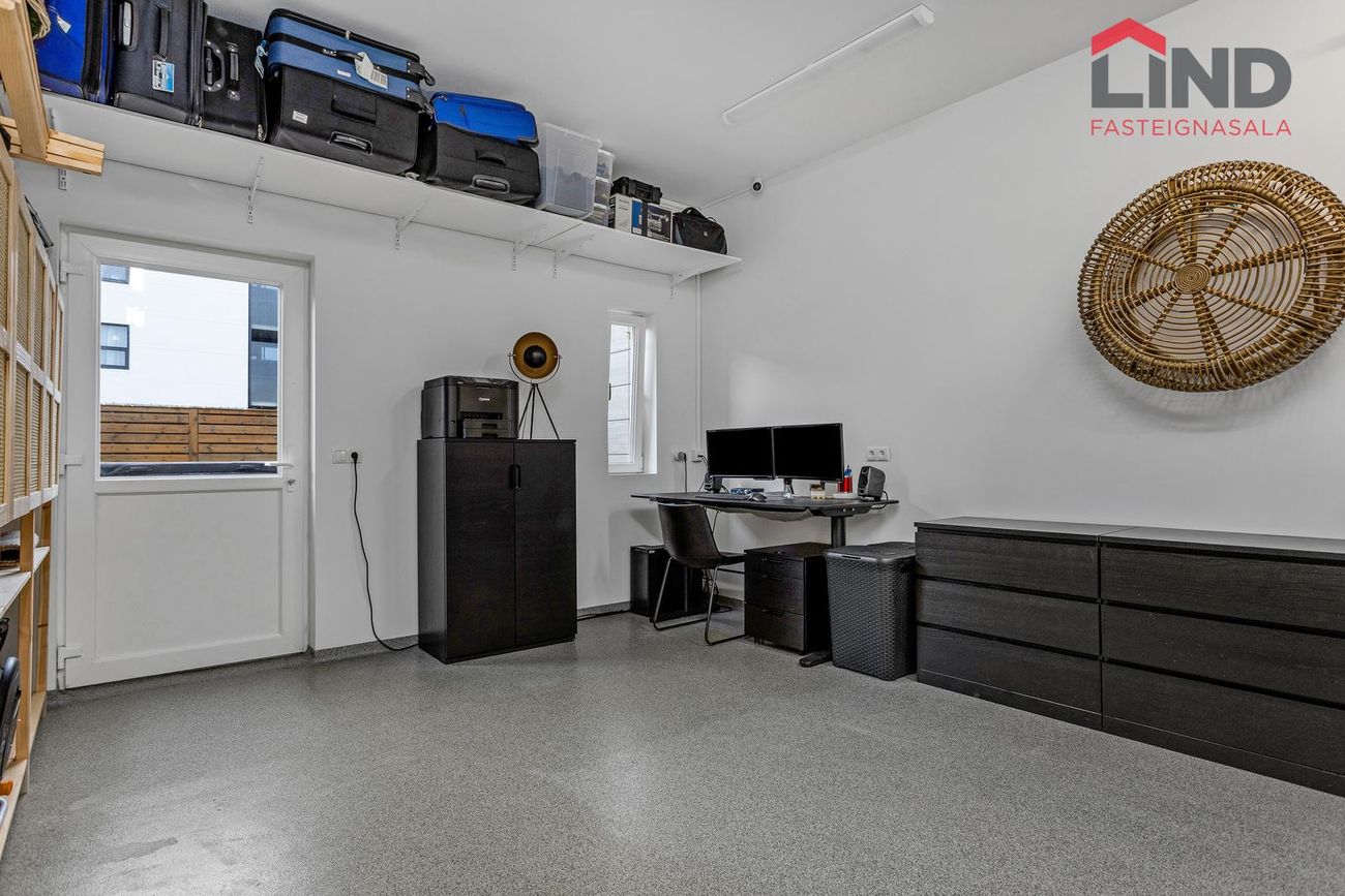 Geymsla er opin og er í hluta af bílskúr. Búið er að setja þvotta aðstöðu með fallegri innréttingu í enda bílskúrsins. Útgengi er út á viðar verönd.