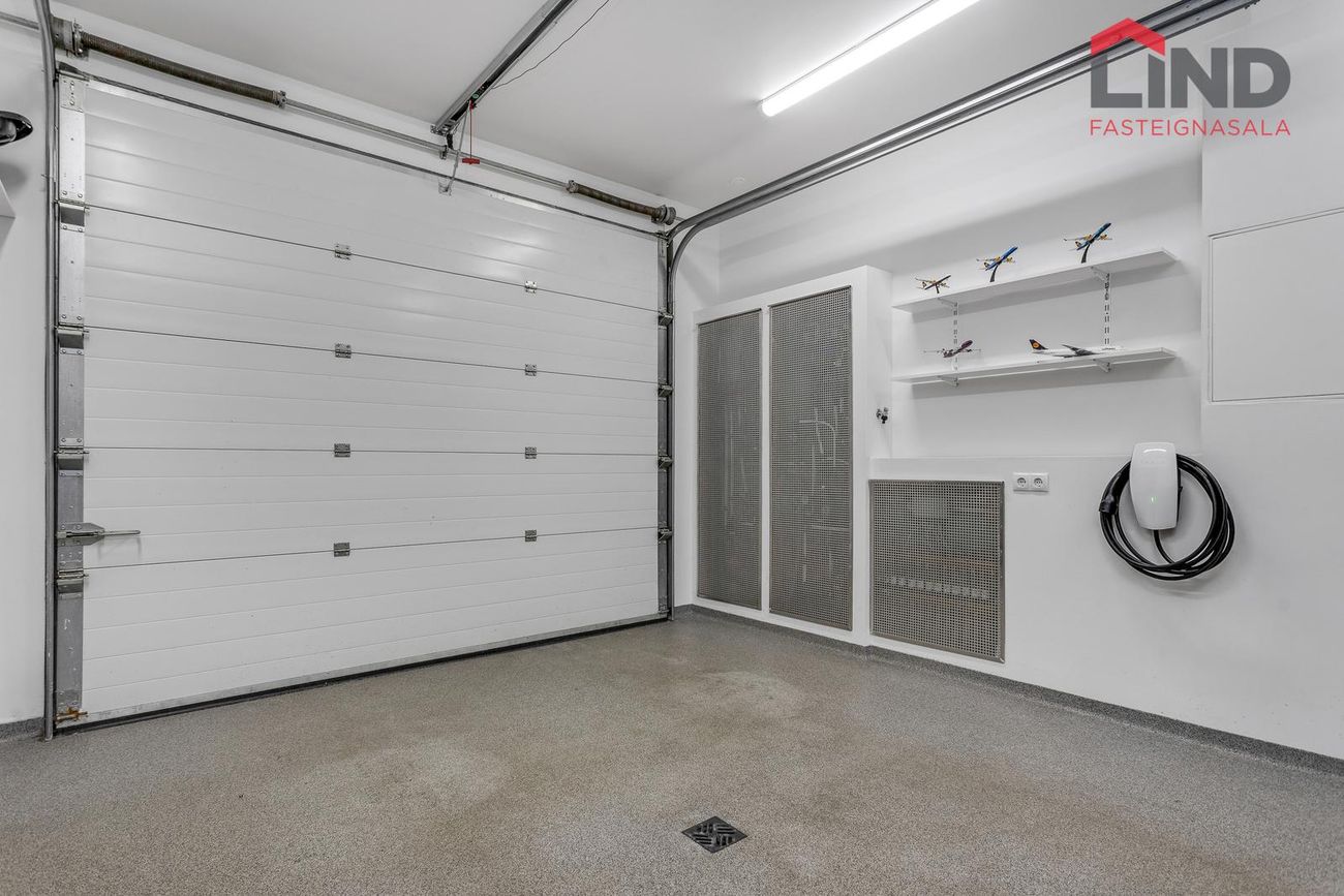 Bílskúr er með epoxy á gólfi. Niðurfall fyrir miðju gólfi. Vaskur. Lagnagrind, rafmagnstafla og ljósleiðari í bílskúr. Varmaskiptir á vatninu. Rafmagn er 3-fasa. Sjálfvirkur hurðaopnari.
