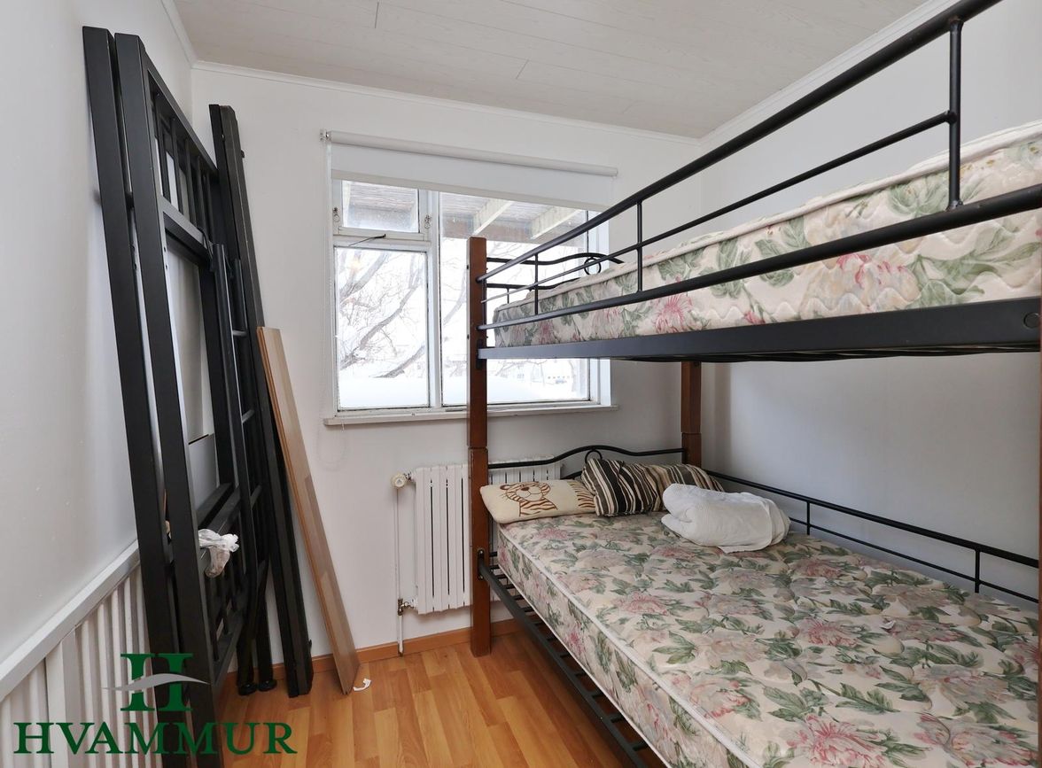 Svefnherbergin eru tvö, annað dúk á gólfi og hitt með plastparketi.