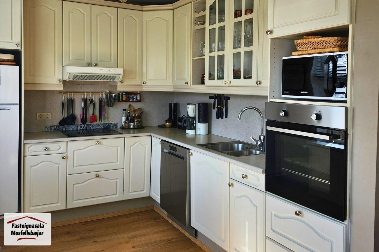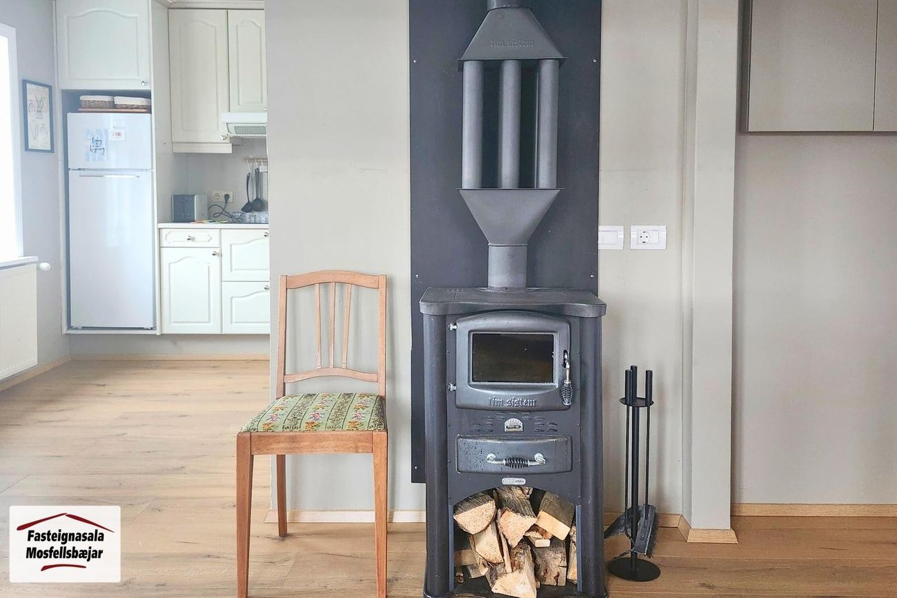 Eldhús, stofa og borðstofa eru í opnu rými með parketi á gólfi. Í eldhúsi er L-laga innrétting. Í stofu er falleg kamína.