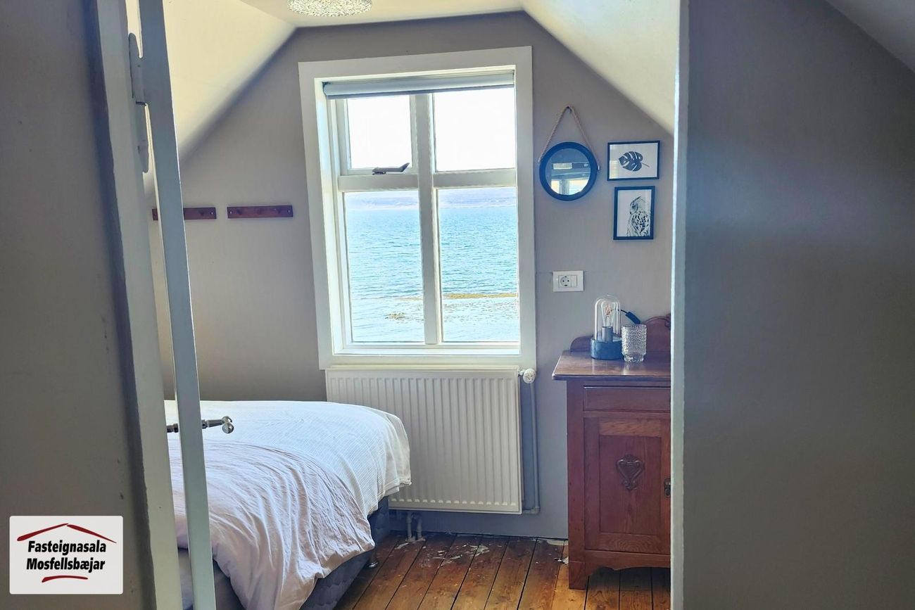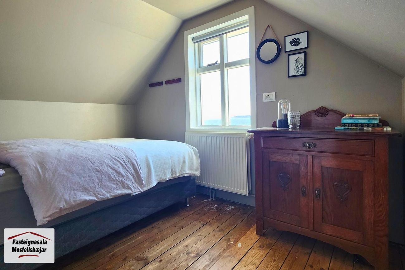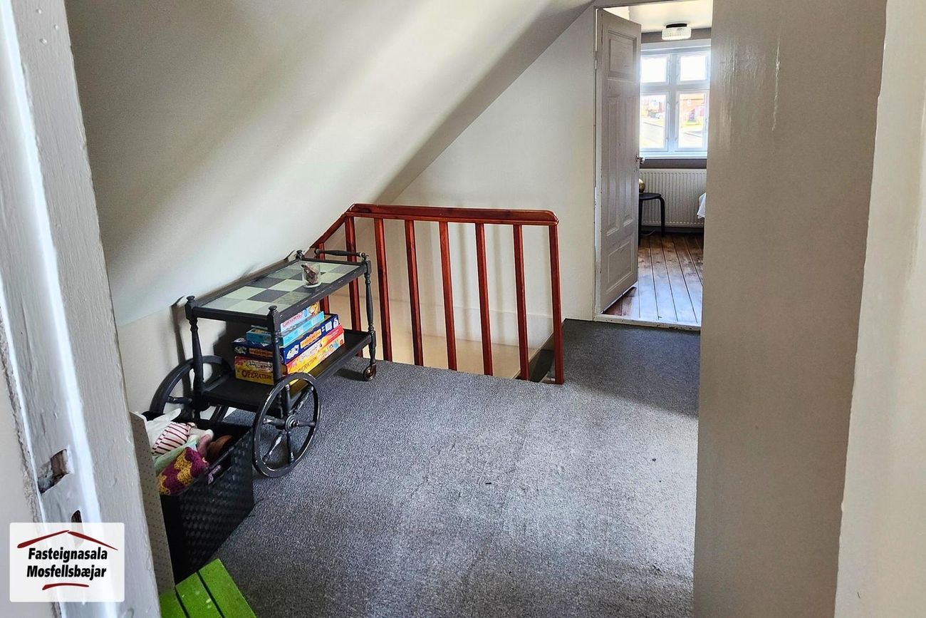 Efri hæð:Gengið er upp teppalagðan stiga á efri hæðina. Timburgólf er milli hæða. Af