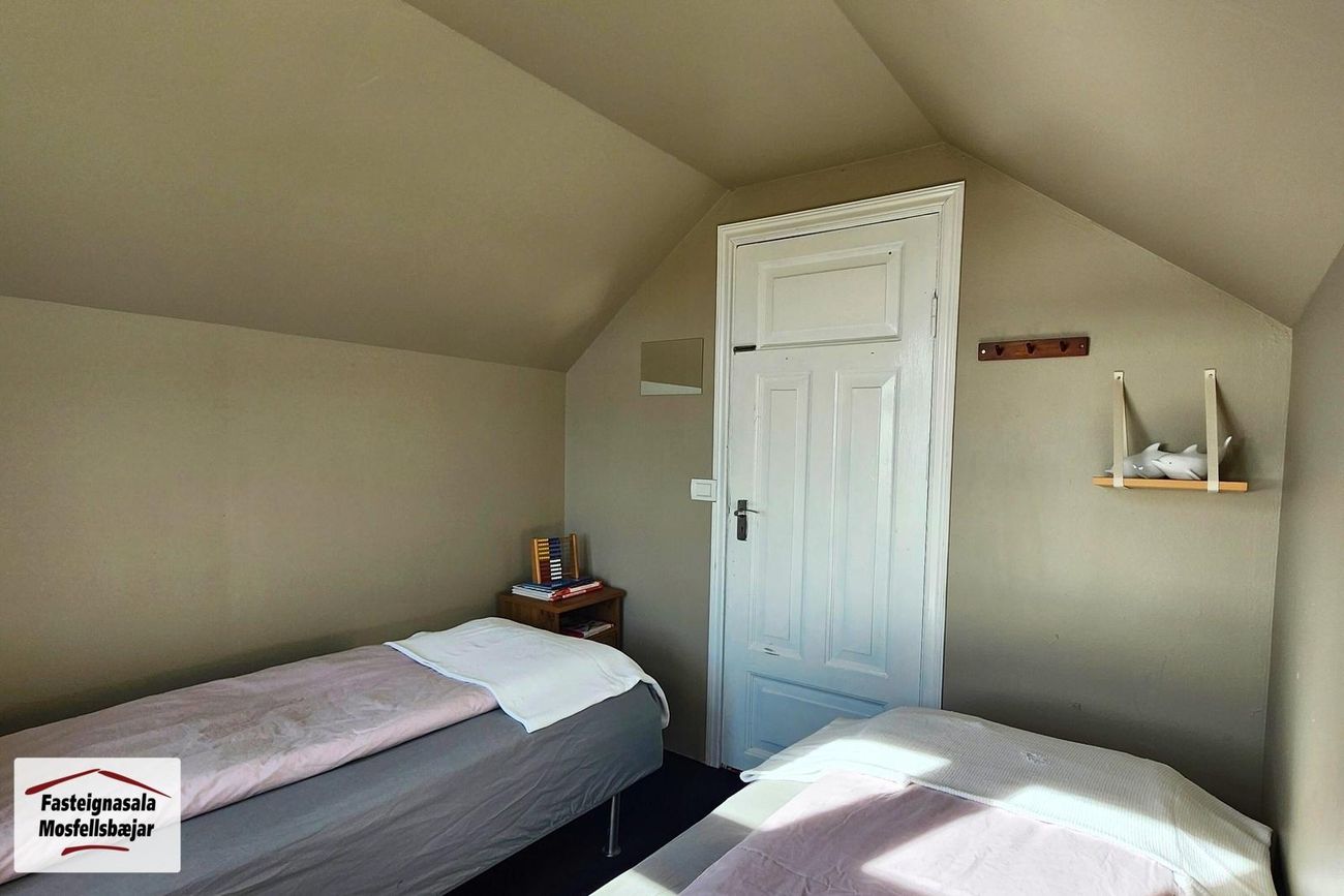 svefnherbergi á efri hæð. Herbergin eru undir súð.