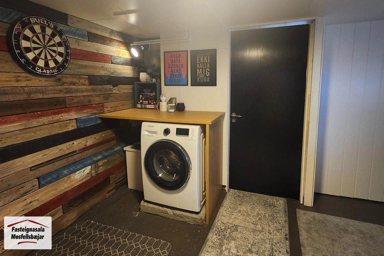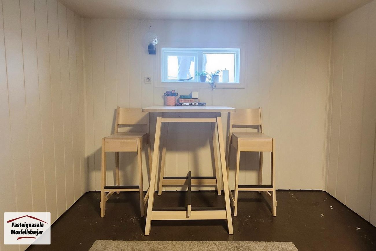 Kjallari: Gengið er í kjallara niður steyptar tröppur. Þar er ekki full lofthæð.