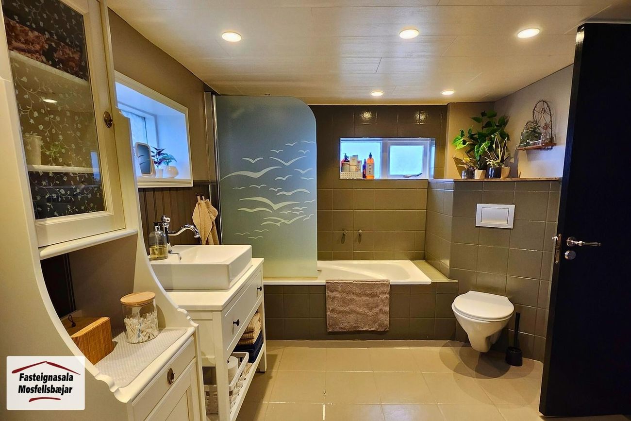 Baðherbergi er flísalagt með innréttingu með vaski, baðkari með sturtuaðstöðu og vegghengdu salerni.